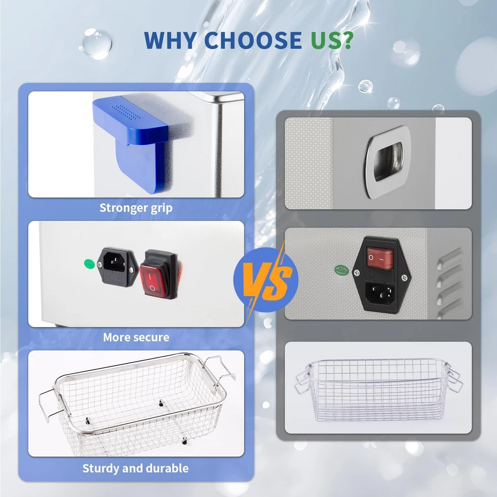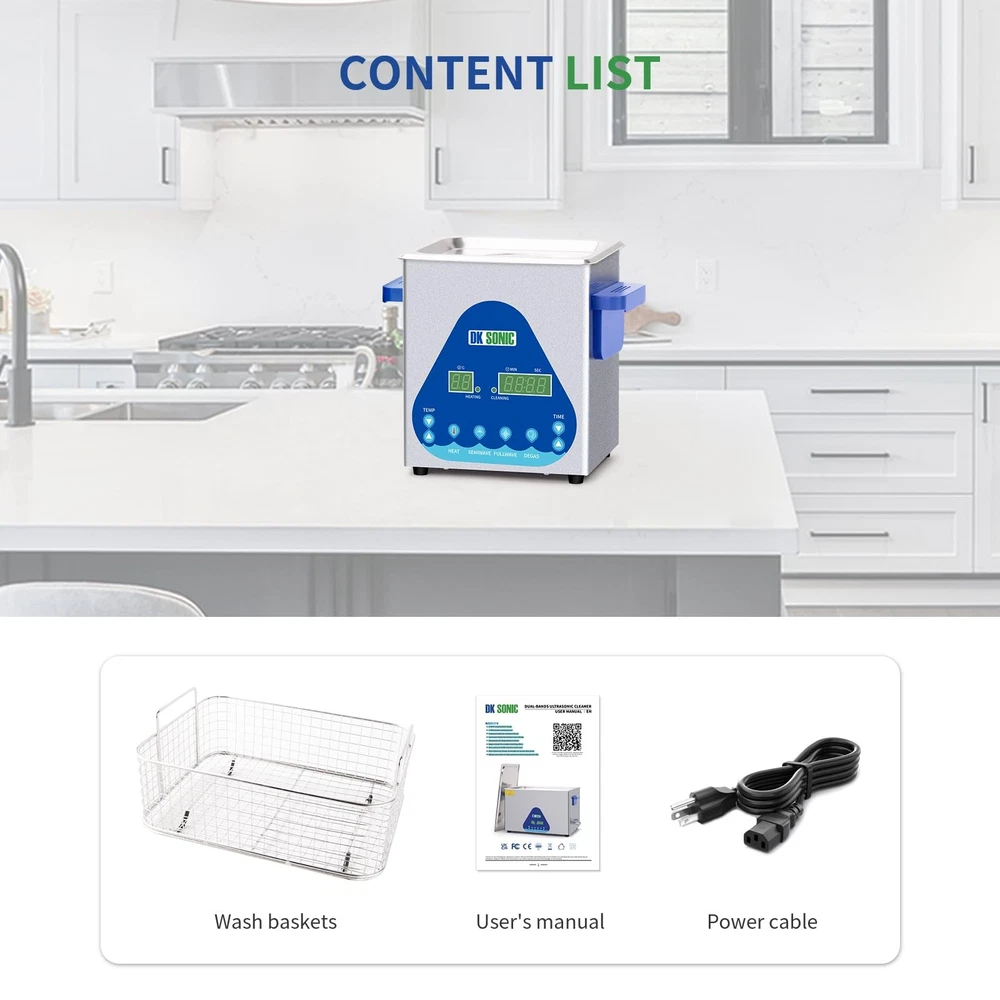 is a professional manufacturer of ultrasonic cleaners and has focused on the R&D of ultrasonic cleaners for more than 10 years. always bears in mind the "quality first, credit first" principle and tries to provide perfect products and great after-sales service. Specifications Tank Material: Stainless Steel SUS304 Heating Power: 100W Ultrasonic Power: 60W Frequency: 40kHz&33kHz Power Supply: AC110V/60Hz Tank Capacity: 2L Time Setting: 1~99 Minutes Temperature Setting: Temp Settings within 0~80℃ Transducer Quantity: 1 sets Tank Size (L x W x H): 175*136*87 mm/6.89*5.35*3.42 in Product Size (L x W x H): 220*170*200 mm/8.7*6.36.69*7.9 in Package Contents 1 x Ultrasonic Cleaner 1 x Cleaning Basket 1 x Stainless Steel Cover 1 x Power Supply 1 x Instruction Manual Multiple Cleaning Modes for an Extensive cleaning Range: Fullwave,Semiwave,Degas Cleaning Modes based on 40KHz ultrasonic frequency make the device applicable for rough surface cleaning and intensive rinse. Generally, fullwave cleaing mode is used for making intensive rinse, while semwave is used for rough surface cleaning Digital Control Panel with LED Display and Memory Function: Digital control panel can make the device be operated more convenient and accurately, and therefore make the device have a long service life; especially the preset cleaning time and heating temperature can be memorized by the device even after power-off unless it is reset manually. SUS304 Stainless Steel Drain Valve and Die-casting Tank: Both the cleaning tank and drain valve of the device are made with SUS304 stainless steel materials, and it makes the device be resistant to weak acid and weak alkali. Free time setting among 1~99 minutes: Extensive time-setting range makes the device be freely set to work for any certain time within 99 minutes based on the characters of the stuffs to be cleaned 0~80°C Heating Range for Degreasing and Dewaxing: Heating function is helpful for reducing the adhesion strength of oil and wax so as to improve the cleaning effect, and generally the best cleaning temperature is among 40~60°C, i.e. 104~140°F