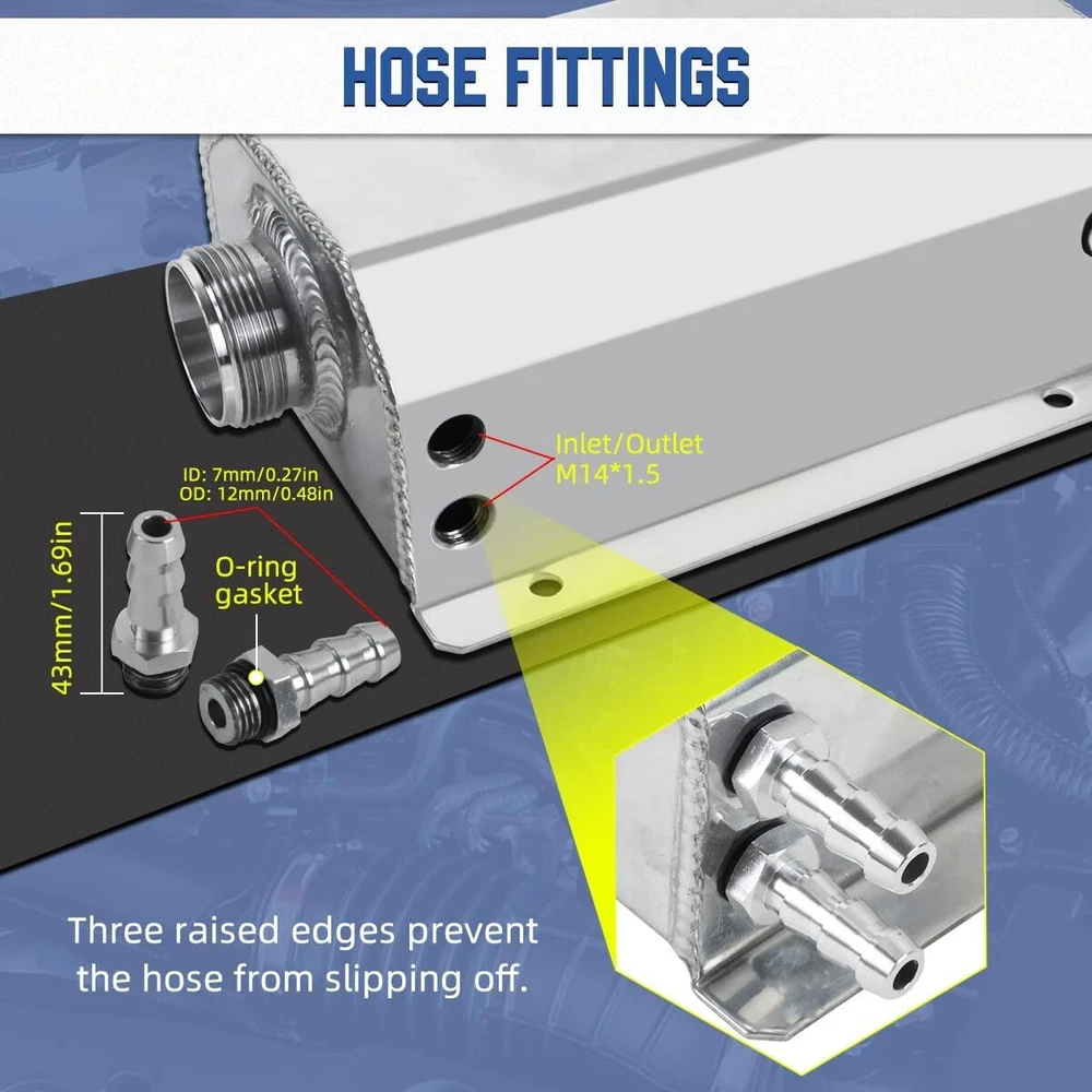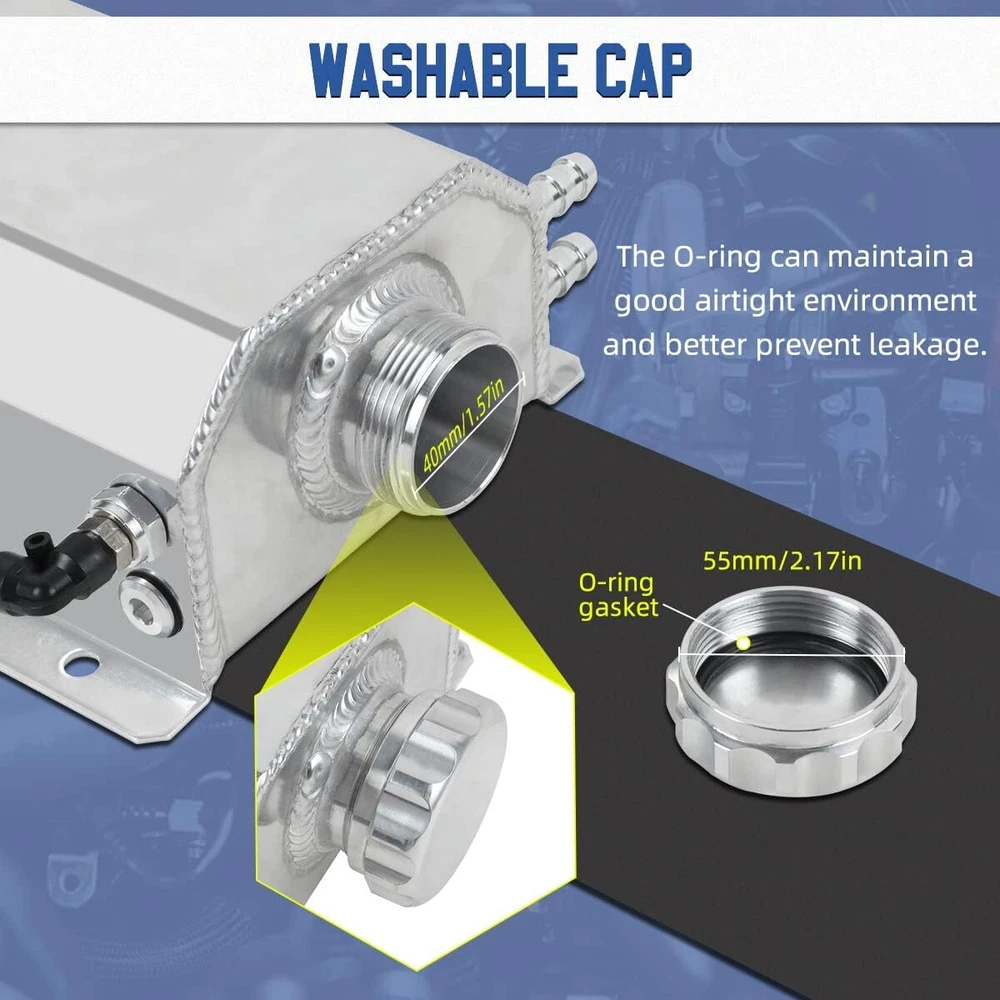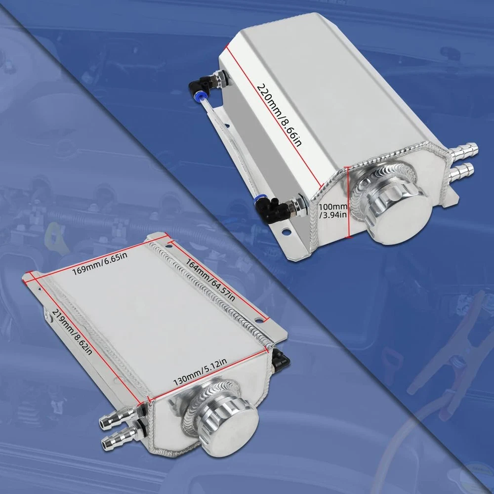 Feature: Capacity:2L Barb inlet and outlet ports:2*12 mm Thread size:M14*1.5 Size:144mm/5.67inchx85mm/3.34inchx260mm/10.24inch Package: Coolant Overflow Tank * 1 Hollow Nut & Pneumatic Connector *2 Hose Connector *2 Aluminium Cap *1 2L Aluminum Radiator Coolant Overflow Bottle Recovery Water Tank Reservoir Silve Product Description MULTIPLE USES Used as oil catch can Prevent carbon and sludge build-up in the intake system and the engine, keep engine clean and prolongs its life. Used as coolant overflow tank Coolant overflow tank is basically a remote reservoir for the radiator. Switchable inlet/outlet and level indicator can be placed either on the right or left hand side of the can. Universal coolant reservoir overflow tank, suitable for most vehicles. The water tank is compatible with Mitsubishi, compatible with Nissan, compatible with Mazda, compatible with Jeep, compatible with Dodge, compatible with Ford, compatible with Acura, compatible with Infiniti, compatible with Lexus, compatible with Sion, compatible with GM and other vehicles. PRODUCT DETAILS Fully Tig Welded Keep a good sealing environment and better prevent coolant leakage. Aluminum alloy body High temperature and corrosion resistance, longer service life, better than plastic materials. Hose Fitting with O-ring Three raised edges can effectively prevent the hose from slipping off. Liquid level indicator with O-ring Fluid levels can be easily checked without opening the bottle cap. Washable cap with O-ring The cap is knurled for easy opening and closing. Bottom drain valve with 0-ring Magnetic drain plug at the bottom of the car expansion tank for easy draining and cleaning. PRODUCT PARAMETERS