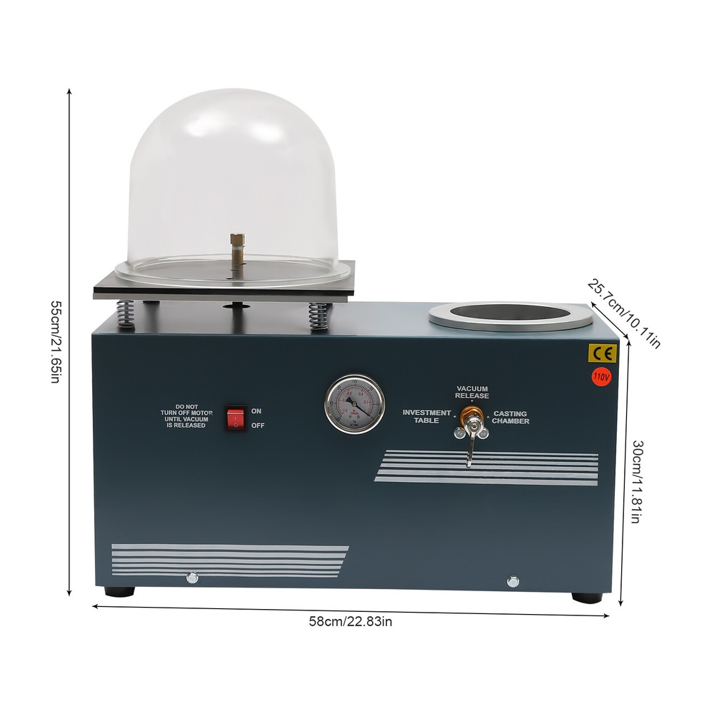 2L Vacuum Investing Casting Investment Machine for Jewelry Lost Wax Cast 110V Jewelry Lost Wax Cast Combination Vacuum Investing Casting Investment Machine Product Parameters: Product Size: 58*27.5*30cm Net Weight: 33kg Voltage: 110v 60hz Power: 375w Air Pump Capacity: 2l Cfm:4.24 Hp: 1/2 Workbench: 11"X 11" Vacuum Hood: 9" Diameter X 8" Height Product Features: 1. Vacuum Hood Made of plexiglass, Vacuumed to Reduce Burrs and Bubbles 2. Vacuum Oil Level Gauge The Value of the Fuel Gauge Cannot Be Lower than Min, and Cannot Be Higher than Max 3. the Body Is Thick and Heavy, and the Base Is Flat to Ensure the Stability of the Equipment When Working 4. the Air Switch Is Made of Metal Material, with a Smooth Texture, Comfortable and Not Rubbing Hands Packing List: Vacuum Cover + Casting Host + Rubber Base + Rubber Ring + Steel Bell Pliers + Steel Bell Sleeve + Steel Bell Payment Delivery details Terms of sales About us Contact us Payment We accept ebay payment 。 Fees such as import duties, taxes are not included in the item price or shipping costs. These charges are the buyer's responsibility. Delivery details Shipping: 2-9 working days to: USA Terms of sales We maintain high standards of excellence and strive for hundred percent customer satisfaction. Feedback is very important to us. We hope that you contact us immediately before you give neutral or negative feedback, so that we can address your concerns. It is impossible to address issues if we do not know about them! About us Your satis faction is our ultimate goal. We work hard to earn your trust and future business. Our certified technicians have tested each item before shipping. The unit comes with 1 year limited warranty on all manufacturing defects. a) If you receive a defective item, you may return it or ask for a discount. Please contact us within 14 days after you receive the package. b) What you returned must be intact and in its original packaging as re? u. Customer is responsible for shipping costs of the returned item. c) We will cover the cost of shipping back t with the shipping rate indicated in the registration page. We will send you a new unit or refund the full payment you paid. Thank you. Contact us Business Hour Business Hour: Monday To Friday: 8:30 AM to 5:00 PM (Beijing China time) Due to time zones, our reply to your questions may not be immediately. But within above working time, we will reply your email within 24 hours. If it's non-workdays, please kindly be patient and wait till Monday. Please contact us with ebay message. Please feel free to contact us if you have any questions. Monday To Friday: 8:30 AM to 5:00 PM (Beijing China time) Due to time zones, our reply to your questions may not be immediately. But within above working time, we will reply your email within 24 hours. If it's non-workdays, please kindly be patient and wait till Monday. Please contact us with ebay message. Please feel free to contact us if you have any questions. Country of Origin China Warranty Three years Custom Bundle No Features Stable characteristics, high reliability, Easy installation,Convenient Use,Easy Operation, Compact Design,Unique Appearance,high reliability Highlights High quality, long service life, Fast shipping Featuers Long service life, Easy installation,Convenient Use,Easy Operation, Compact Design,Unique Appearance,high reliability Shipping notice Can not ship to Puerto Rico,Alaska/Hawaii Wwarranty 3 years Featurs High-quality Material, stable performance, Stable characteristics, high reliability, Fast shipping Note Do not send to the Canary Islands Characteristic Convenient Use,Easy Operation,Easy installation Surface Finish Made of high quality material Shipping Note Cannot ship to Puerto Rico & Hawaii Festures Durable Material, Good quality Item Condition Brand New Transportation does not include canarias Featurtes Made of high quality material, Durable OE/OEM Part Number Does not apply Color As Shown Set Includes As Shown Type Jewelry Lost Wax Cast Material Metal Brand Unbranded Product size 58*27.5*30cm Net weight 33kg Voltage 110v 60HZ Power 375w Air pump capacity 2L CFM 4.24 Suitable For Casting