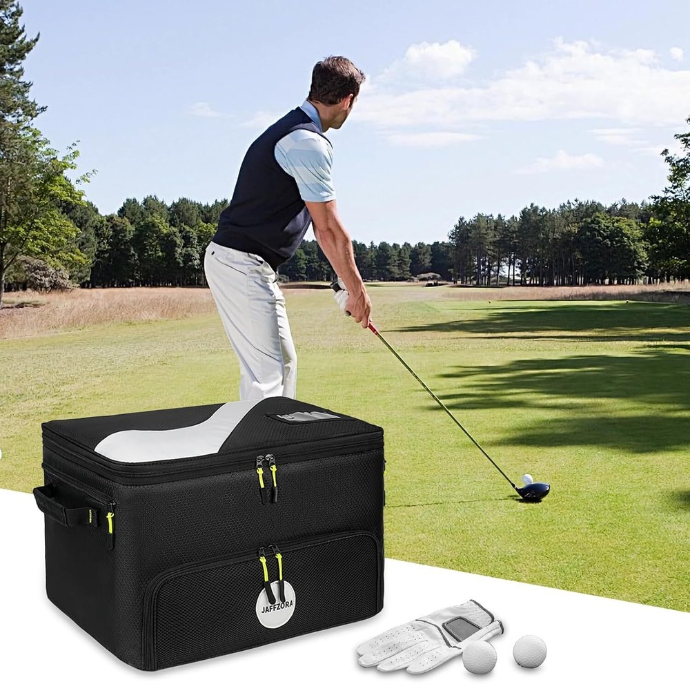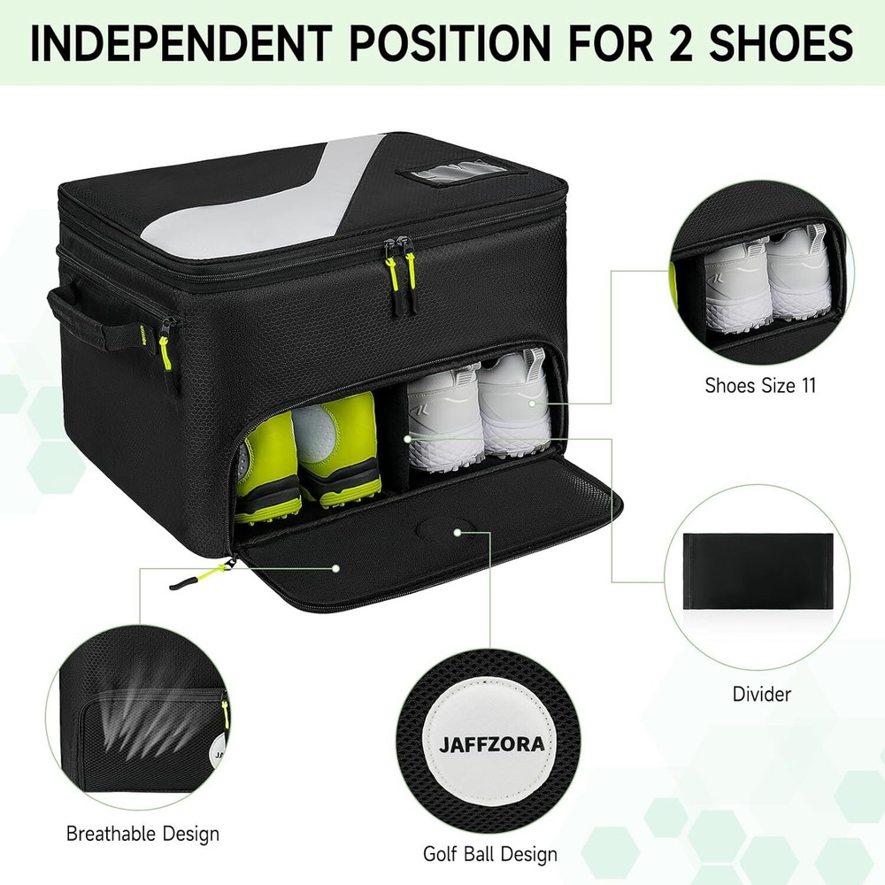 Golf Trunk Organizer, 2 Layers Golf Accessories Bag for Men, Waterproof Car Golf Storage Organizer with Compartment for 2 Pairs of Shoes, Golf Gifts for Men Women, Black Keep Structure: Our golf accessories bag comes with extra 2 support pads, you can insert these 2 hard pads into both sides for keeping the bag structure. And the anti-slip bottom base added durability. Separate Shoe Compartment: The golf organizer for car has shoe compartments to hold 2 pairs of shoes, up to size 11. The breathable design keeps air flowing, helping you solve odor problems. The golf logo design adds a touch of color to this golf bag. Large Capacity: The golf car bag organizer adopts multi-pocket design, and main compartment has 4 removable dividers, which can divide the space into 5 parts, can easily store your golf accessories such as towels, T-shirts, socks, hats, gloves, etc. Sturdy: The golf car organizer is made of high quality oxford fabric materials with reinforced corners, which has excellent wear resistance, scratch resistance and water resistance. Double layer design provides more space to store your golf accessories. Ideal Present: This golf trunk organizer stores all your golf essentials in your car for easy access, making it an ideal golf present for golfers. Also a great choice for Father's Day, Mother's Day, Thanksgiving Days, etc.