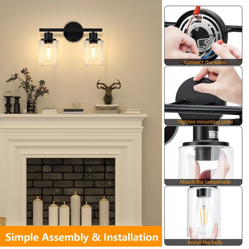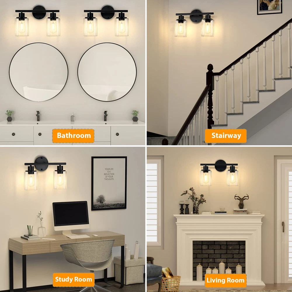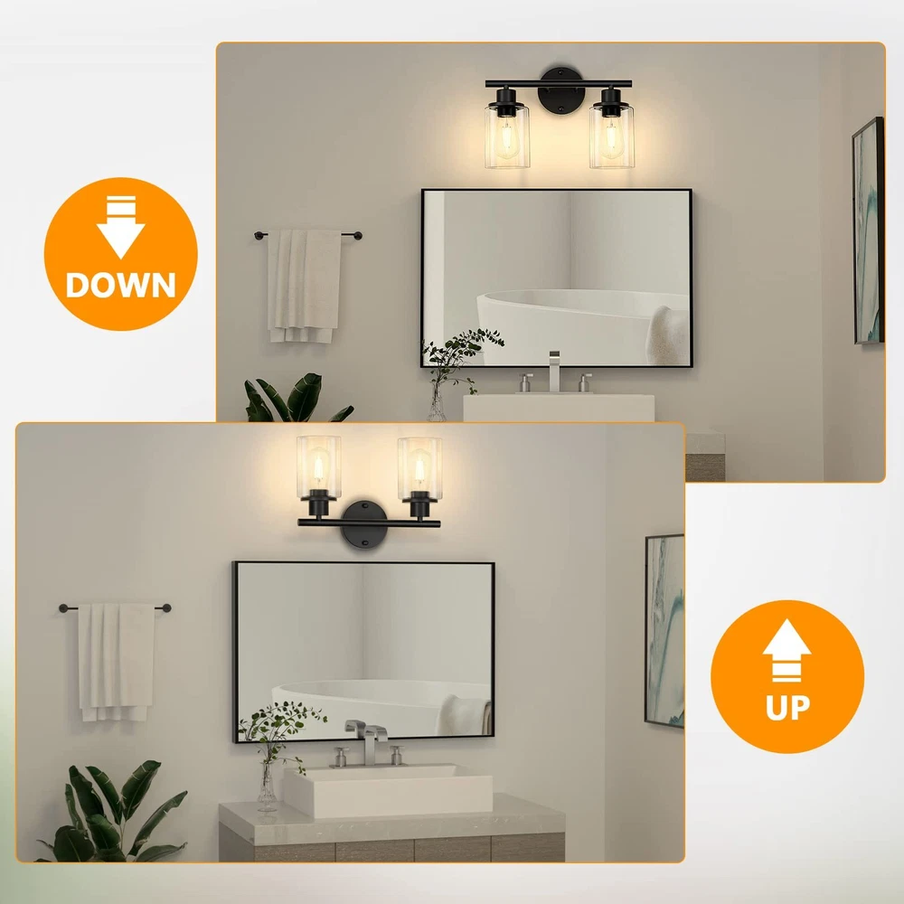 【Morden Design】This 2-light black bathroom light fixture is UL approval, built in a sturdy metal lamp body with clear glass shades, showing an exquisite and modern style for your home lighting. This vanity light fixtures not only can be installed downwards but also upwards, face up to cast more light, and face down to make the light on the bathroom mirror more pleasing. 【E26 Base Sockets】Our bathroom vanity lighting require 2 x E26 medium base bulbs (Max 60W for each light, Bulbs Not Included), Incandescent, CFL, halogen, LED bulbs suitable. It is recommended to use vintage Edison bulbs. This 2-light wall lighting can also be dimmable when you use with dimmable bulbs and compatible dimmer switch. 【Easy Installation】Wall Mounted and hardwired design. All mounting hardware required for installation are included in the package, just need to connect the wire and assemble the shade only. This bathroom wall lighting fixture comes with an open bottom, which allows you to change bulbs easily. 【Wide Application】The bathrooom lighting over mirror is ideal for the corridor and entrance as a wall sconce, bathroom as a vanity light, or bedroom as a bedside reading light. You can fit this black wall sconce light for bathroom, cabinets, dressing table, vanity table, hallway, closet, powder room, kitchen, dining room, bedroom, living room, study room, foyer, entryway etc. 【Let You Know】Please check the glass lampshade carefully about bathroom light fixture for damage caused during transportation. Please email us at the first time, we will always be ready to solve your problems.