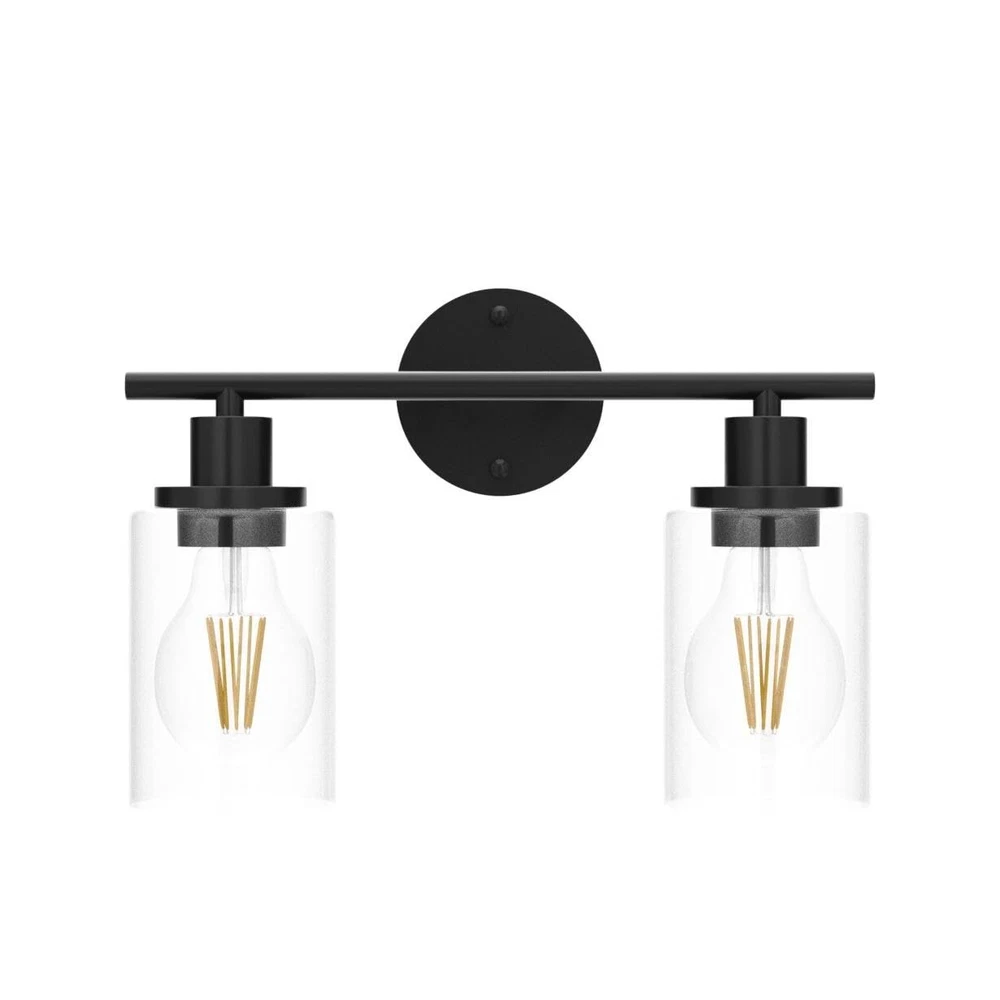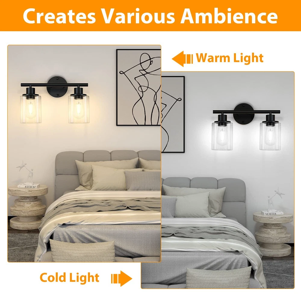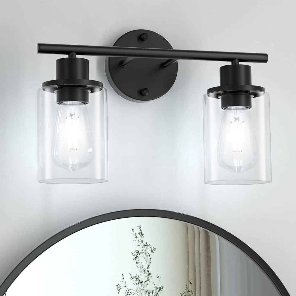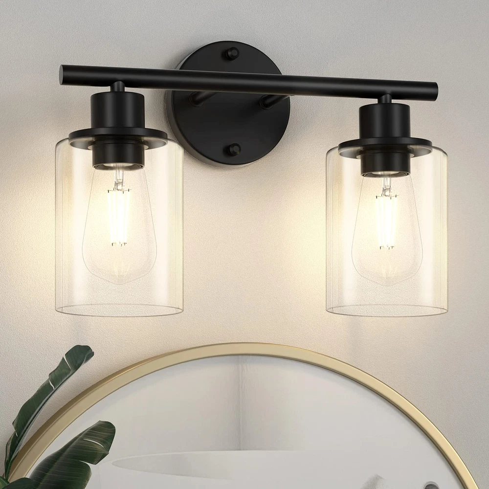 【Morden Design】This 2-light black bathroom light fixture is UL approval, built in a sturdy metal lamp body with clear glass shades, showing an exquisite and modern style for your home lighting. This vanity light fixtures not only can be installed downwards but also upwards, face up to cast more light, and face down to make the light on the bathroom mirror more pleasing. 【E26 Base Sockets】Our bathroom vanity lighting require 2 x E26 medium base bulbs (Max 60W for each light, Bulbs Not Included), Incandescent, CFL, halogen, LED bulbs suitable. It is recommended to use vintage Edison bulbs. This 2-light wall lighting can also be dimmable when you use with dimmable bulbs and compatible dimmer switch. 【Easy Installation】Wall Mounted and hardwired design. All mounting hardware required for installation are included in the package, just need to connect the wire and assemble the shade only. This bathroom wall lighting fixture comes with an open bottom, which allows you to change bulbs easily. 【Wide Application】The bathrooom lighting over mirror is ideal for the corridor and entrance as a wall sconce, bathroom as a vanity light, or bedroom as a bedside reading light. You can fit this black wall sconce light for bathroom, cabinets, dressing table, vanity table, hallway, closet, powder room, kitchen, dining room, bedroom, living room, study room, foyer, entryway etc. 【Let You Know】Please check the glass lampshade carefully about bathroom light fixture for damage caused during transportation. Please email us at the first time, we will always be ready to solve your problems.