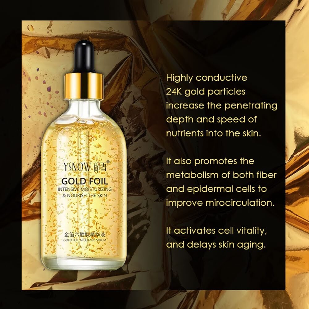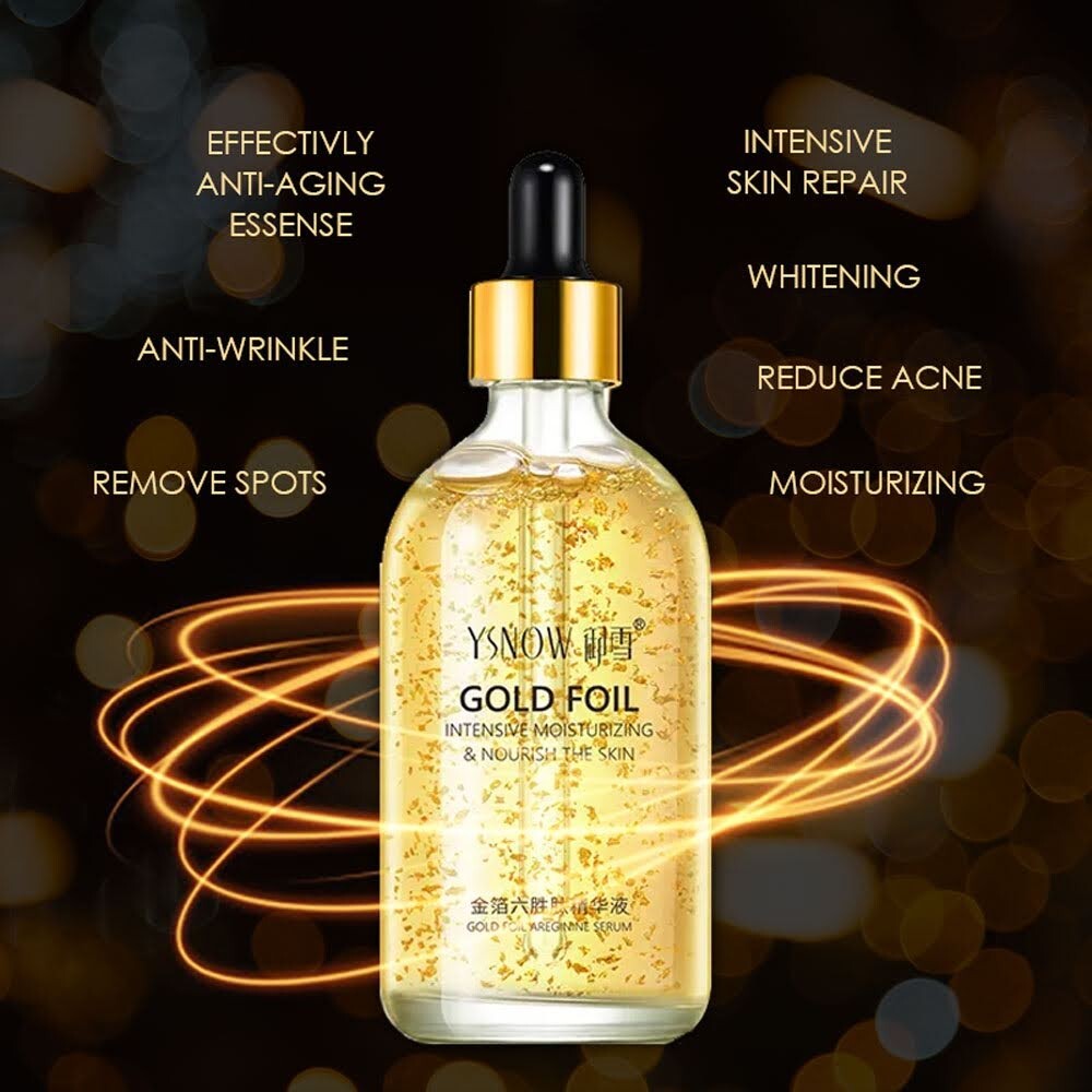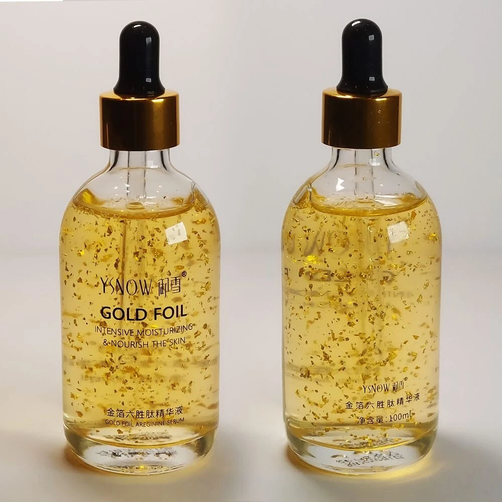 Gold Foil Areginine Serum formulated with hyaluronic acid to fight and improve the appearance of firmness fine lines and wrinkle.Helps to firm,lift, instantly brighten complexion, restore full skin’s elasticity for firmer.Fix uneven skin tone and leave your skin moisturized and youthful glowing. Best Anti-aging serum. Benefits of Gold Foil Areginine Serum: ANTI-AGING: Gold Foil Areginine Serum acts as a natural antioxidant to protect skin from radiation, promote cell metabolism and regeneration, accelerate collagen synthesis and growth, effectively activate skin and restore skin tension. Reproduces the radiance of your skin. ULTRA MOISTURIZING: After the gold foil is fully absorbed, the skin is deeply moisturized. The unique nourishing and moisturizing ingredients can effectively improve dry, rough, and dull skin, leaving the skin soft like pearls. The moisturizer soothes dryness and irritates the skin while helping to balance oily skin tones. Reduce redness, calm inflammation, and find proper moisture. REDUCES DARK SPOTS & WRINKLES: Gold Foil Areginine serum has the effect of removing skin dirt, removing infectious acne, reducing pores; smoothing wrinkles, leaving skin soft and shiny. SKIN REJUVENATION: Improve roughness of skin on the face, as well as holes and various microgrooves caused by weakened skin repairability due to the outflow of collagen protein. FOR ALL SKIN TYPES: Gold Foil Areginine serum for face can effectively reduce the stimulation of sensitive skin, suitable for the anti-aging needs of women of different ages. A refreshing effect that quickly blends the essence into the skin.