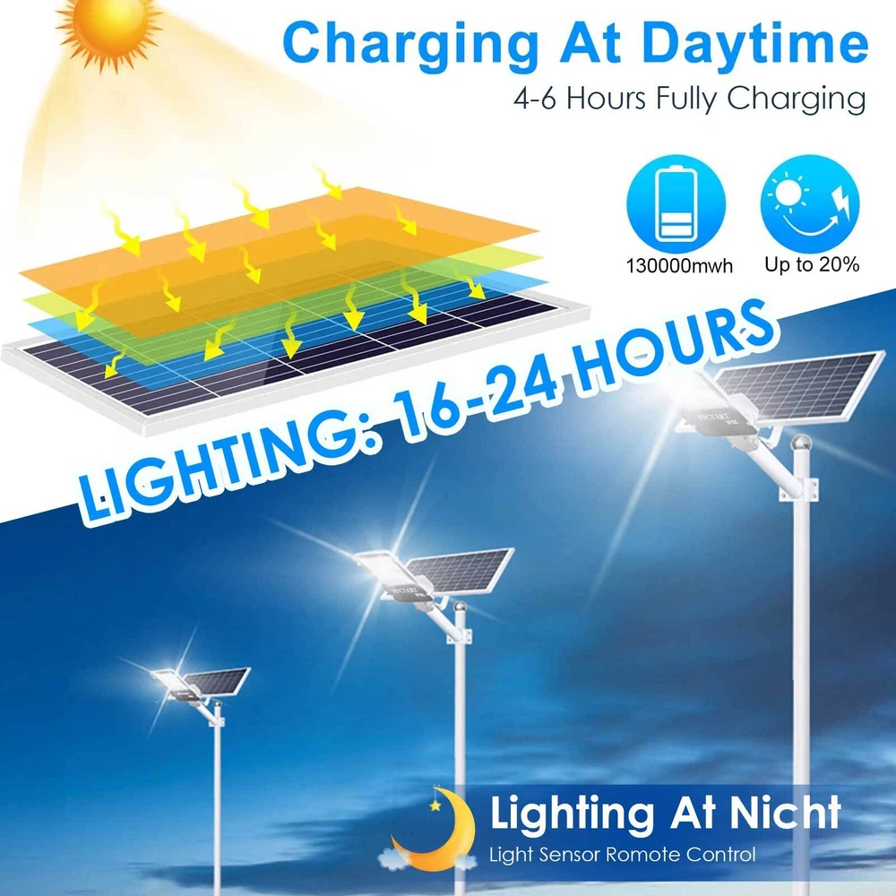 Product Description New Solar Street Lights 2000W Watts Solar LED Flood Light Dusk to Dawn 135000 LM Specifications: ★【Super Bright】 Equipped high quality 2835 SMD LED beads;Provides over 1000w light 100000 Lumens of brightness and reaches 200-300m² illumination range ;No struggle to see in dark places;Built-in 3.2v-13.5Ah large capacity lithium battery with a long life of 50,000+ hours;Working time is up to 20 hours after 4-6 hours fully charged,about 72 hours in dim mode.;Long-lasting and highly efficient solar panels,fast charging and high conversion rate ★【Dusk to Dawn Sensor & Remote Control】 Built-in smart sensor,lights will turn on automatically at dusk, and turn off at dawn. Upgraded Remote Control -ON/OFF Function;Auto Mode- automatically lights up at night,automatically turns off during the day;Timing function-3H,5H,8H ;.Full / Half brightness mode;Brightness increase /decrease mode; ★【Easy to Install】 The kit contains the installation accessories set. You can effortlessly mount them on a tree, pole, balcony, wall, or any desired outdoor spot. These solar powered street lamps can be instantly mounted as long as there is a wall or a pole. ★【Durable&Sturdy&Maintence-free 】 Thickened die-cast aluminum case;IP65 waterproof rating; Dust-proof, rust resistant, corrosion resistant, and bad weather resistant; Designed to withstand any severe weather condition, including snowstorms and hurricanes, ultra reliable;Cost savings;No need to run pesky wires under your lawn, and no batteries that need replacing at the most inconvenient times.Safe-less risks of fires and burns; Environmentally friendly; ★【Widely Used】 Ideal for Plaza, Park, Garden, Courtyard, Street, Walkway, Pathway, Campus, Farm, Perimeter Security etc;Also can be used in Urban roads, industrial areas, residential areas,Elegant design,it will add a nice touch to your outdoor space;an excellent choice for any outdoor Package Content Per Box: 1 x Solar Lamp 1 x Solar Panel 1 x Remote Control 1 x Accessories; Notice: Please allow 1-3cm error due to manual measurement and make sure you do not mind before ordering. Please understand that colors may exist chromatic aberration as the different placement of pictures. About Us Payment Shipping Returns Contact Us Welcome to our store, your support is the biggest driving force for us to move forward. Our main businesses are solar panels, lithium iron phosphate batteries, electric vehicle chargers, solar outdoor/indoor lights, travel solar panels, etc . The product is directly connected with the factory to ensure product quality. Please rest assured to buy, we will provide you with a perfect shopping experience! We accept payment via Paypal only. Payment must be completed within 7 days. If you have any problems about payment, please contact us by ebay message. We only ship to confirmed eBay addresses. Please comfirm that your eBay address is in line with your shipping address. Most of our products are provided with shipping services. Also, the each additional item means exactly the the same color and size. The item shipping from USA. It takes about 5-10 working days to your addresses; Transit time may be a little delayed because of the bad weather. If you do not receive your item within 15 working days since payment finished, please contact us immediately for further assistance. If you have any issue about Item. Please contact us with 7 days since you receive the item and and return to us within 30 days from the delivery date for exchange or refund. If you need return, please contact our customer service representative, let us know the detailed problem and send us some pictures for confirmation. We strive for 100% customer satisfaction! Positive Feedback is very important to us. If you have any questions, please feel free to contact us via "Ask seller a question" . We will reply your email within 24 working hours. About Us Welcome to our store, your support is the biggest driving force for us to move forward. Our main businesses are solar panels, lithium iron phosphate batteries, electric vehicle chargers, solar outdoor/indoor lights, travel solar panels, etc . The product is directly connected with the factory to ensure product quality. Please rest assured to buy, we will provide you with a perfect shopping experience! Payment We accept payment via Paypal only. Payment must be completed within 7 days. If you have any problems about payment, please contact us by ebay message. Shipping We only ship to confirmed eBay addresses. Please comfirm that your eBay address is in line with your shipping address. Most of our products are provided with shipping services. Also, the each additional item means exactly the the same color and size. The item shipping from USA. It takes about 5-10 working days to your addresses; Transit time may be a little delayed because of the bad weather. If you do not receive your item within 15 working days since payment finished, please contact us immediately for further assistance. Returns If you have any issue about Item. Please contact us with 7 days since you receive the item and and return to us within 30 days from the delivery date for exchange or refund. If you need return, please contact our customer service representative, let us know the detailed problem and send us some pictures for confirmation. Contact Us We strive for 100% customer satisfaction! Positive Feedback is very important to us. If you have any questions, please feel free to contact us via "Ask seller a question" . We will reply your email within 24 working hours. powered by