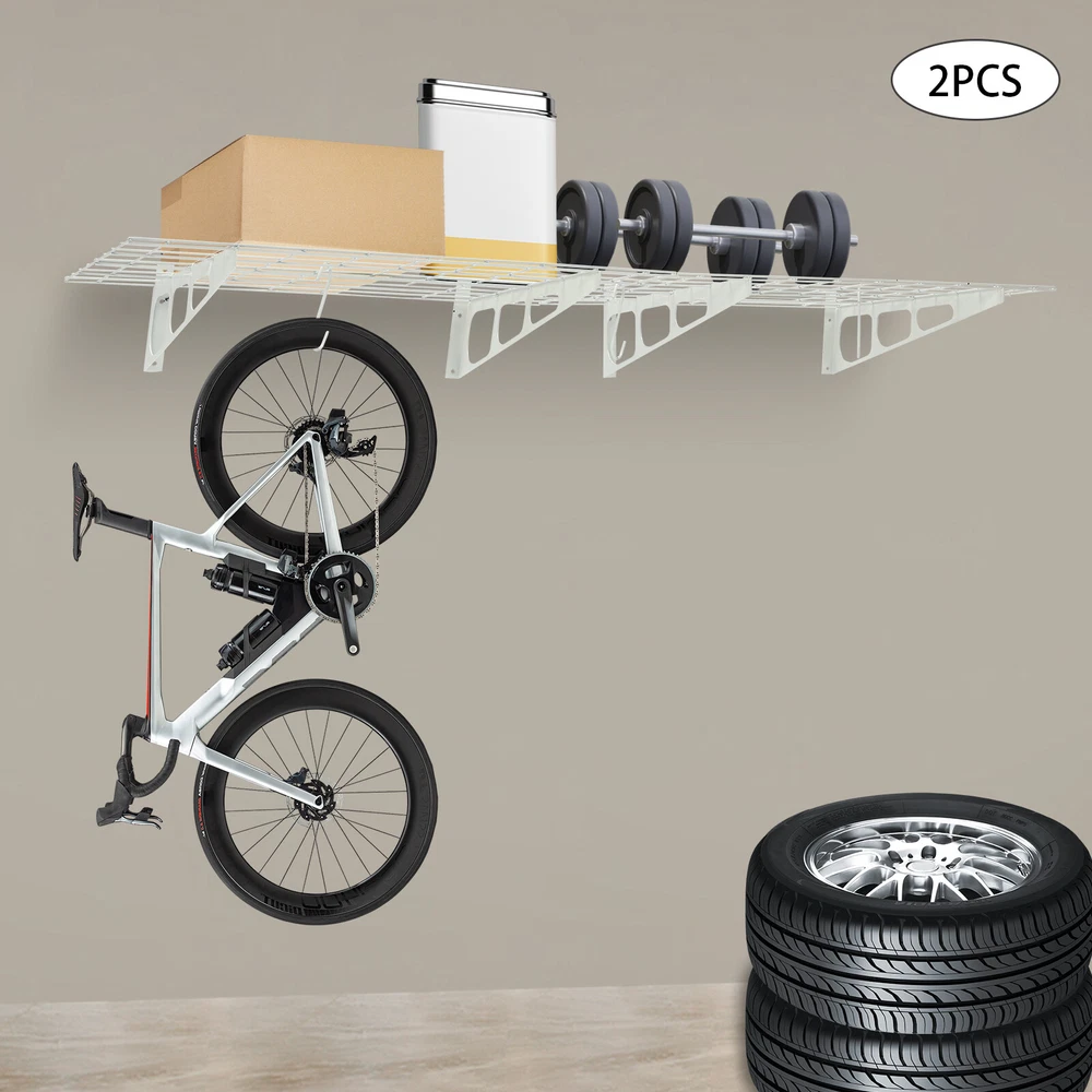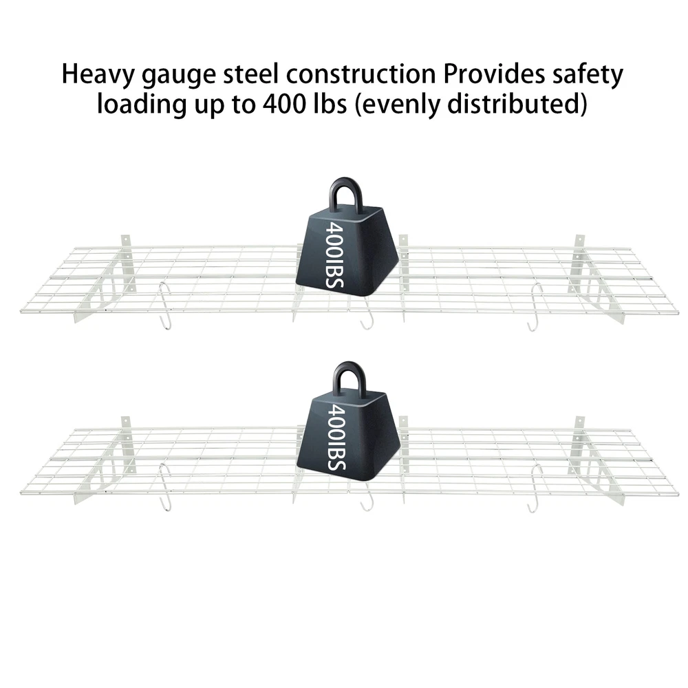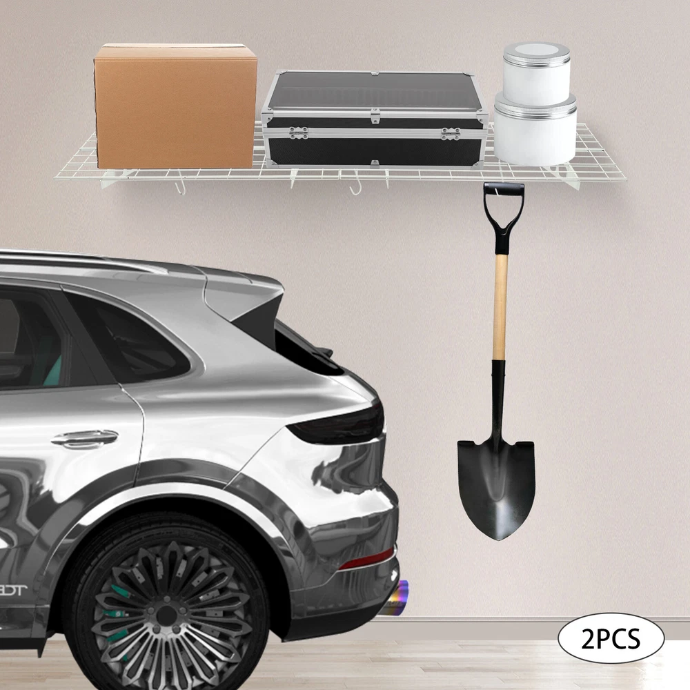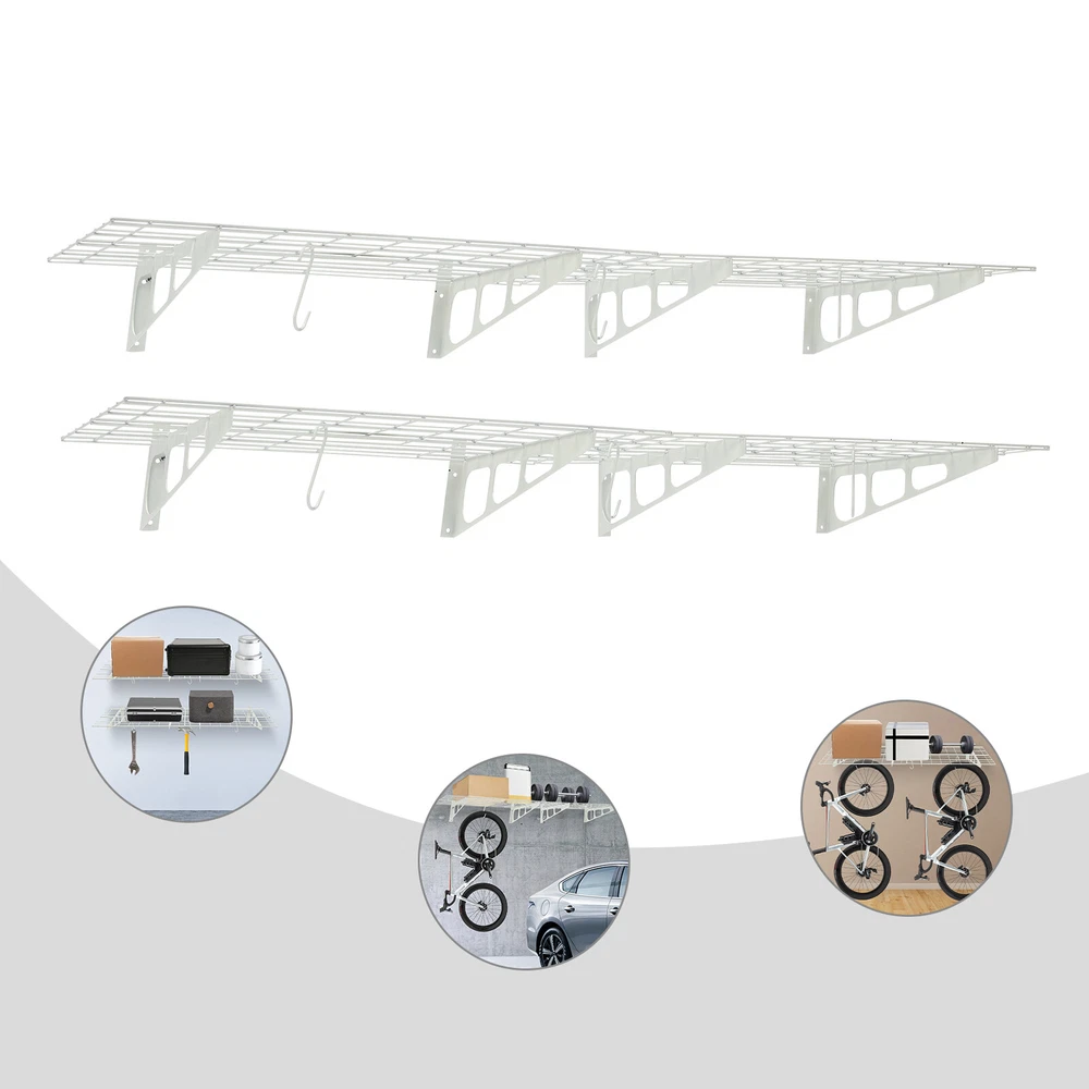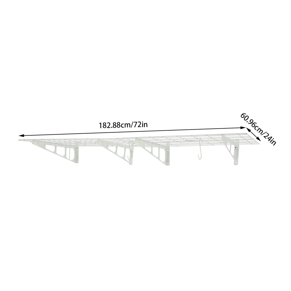 Made of steel wire, the garage storage rack has triangular brackets and zip ties design so it can withstand heavy loads. It comes with six hooks to extend your storage space, meeting your daily storage needs. Meanwhile, the neat grid and sleek white finish add a touch of a stylish yet modern look to your garage. Details Double-Fixed Bars: The horizontal bars are double-layered to keep the product firm and stable. Net Boards: They are not just strong and durable but also boast good ventilation, keeping your items dry and allowing the odor to dissipate in a timely manner. Application It's suitable for hanging or storing bikes, tools, storage boxes, sports equipment, and other items. 2PACKS 400LBS Garage Shelving with Hooks, Garage Storage Rack, Garage Wall Shelf Description Made of steel wire, the garage storage rack has triangular brackets and zip ties design so it can withstand heavy loads. It comes with six hooks to extend your storage space, meeting your daily storage needs. Meanwhile, the neat grid and sleek white finish add a touch of a stylish yet modern look to your garage. Key Features Build to Last: The product is made of steel wire, after the plastic spraying process, with high strength, corrosion resistance, abrasion resistance , and long service life. High Load-bearing Capacity: The high-quality material, sturdy triangular brackets, welding process, and zip ties design allow it to withstand up to 400 lbs without falling, giving you a piece of mind. And each hook can withstand up to 33 lbs. Set of 2: The package includes two-piece garage storage racks with 6 hooks, so you can choose different mounting methods, such as parallel mounting, vertical mounting, separated mounting, which can fully meet your daily storage needs. Large Storage Capacity: The wall-mounted storage rack is 72*24in and the removable storage hooks can be moved to any position, holding toolboxes, sports equipment, gardening tools, and more equipment, flexible to meet your actual storage needs, and saving space in the garage. Stylish Appearance: The sleek white finish and the neat modern grid appearance make it a nice garage decor. At the same time, toolkits and clutter are arranged in a neat and orderly manner, which is more pleasing to the eye. Effortless Assembly: Complete installation accessories, a simple structure, and pre-drilled holes allow you to complete the assembly in a very short time. Adjustable Spacing Design: The spacing between the four triangular brackets can be adjusted according to your actual installation needs. Guaranteed Customer Service: We stand behind all our guests and look forward to assisting you with your purchase. It is our pleasure to answer your confusion and questions. The end of the story between us is not "we sell and you buy". Details Double-Fixed Bars: The horizontal bars are double-layered to keep the product firm and stable. Net Boards: They are not just strong and durable but also boast good ventilation, keeping your items dry and allowing the odor to dissipate in a timely manner. Application It's suitable for hanging or storing bikes, tools, storage boxes, sports equipment, and other items. Specifications Material: Steel Wire, Nylon Surface Treatment: Plastic Spraying Process Color: White Style: Modern Mount Type: Wall Mounted Load-bearing Capacity: 181kg/400lbs Each Hook Load-bearing Capacity: 15kg/33lbs Assembly Required: Yes Number of Items: 2 Number of Hooks: 6 Gross Weight: 17kg/37lbs Product Size: 183*61cm/72*24in Package Size: 95*62*12cm/37.4*24.4*4.7in Package Included 2* Garage Storage Racks 6* Hooks All Accessories for Installation Notes lt is normal that the expansion screw will blow up after the force is applied. Before purchasing, please check the product information carefully to make sure the load bearing of your wall and the installation environment are suitable! Please check the screw hole spacing carefully if it is installed on the studs! Cement walls need to be perforated and thin wood walls or hollow walls need to be supported by a certain thickness of solid wood struts(not included) laid on the front or back of the wall. Please allow the slight color difference caused by the shooting light and 1-3cm error due to manual measurement, and make sure you do not mind before you order. Brand Unbranded Type Wall Mounted Rack Shelf Type Bracket Shelf, Floating Shelf Color White Material Steel Wire, Nylon Surface Treatment Plastic Spraying Process Style Modern Mount Type Wall Mounted Load-bearing Capacity 181kg/400lbs Each Hook Load-bearing Capacity 15kg/33lbs Assembly Required Yes Number of Items 2 Number of Hooks 6 Gross Weight 17kg/37lbs Product Size 183*61cm/72*24in Package Size 95*62*12cm/37.4*24.4*4.7in Manufacturer Warranty 3 Years