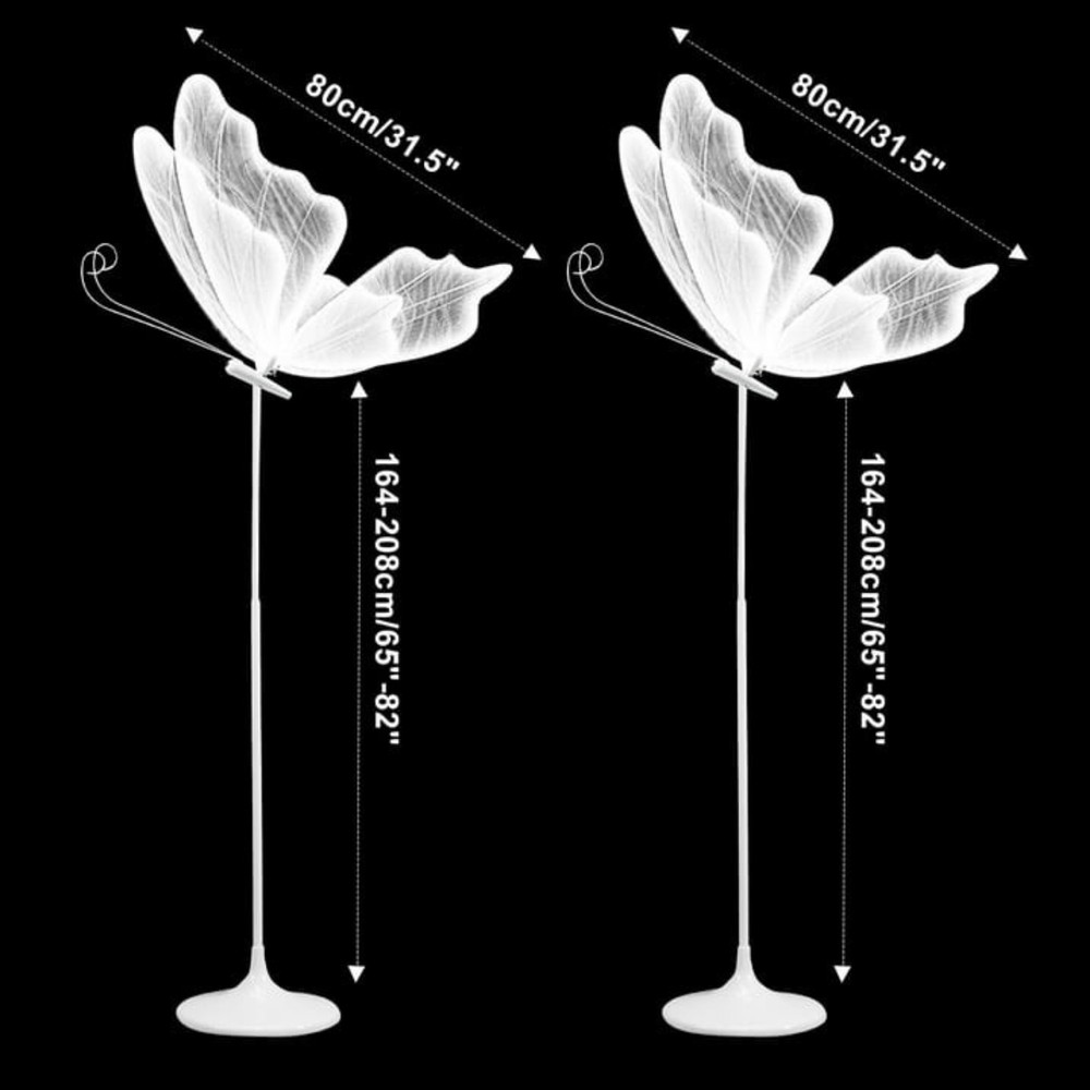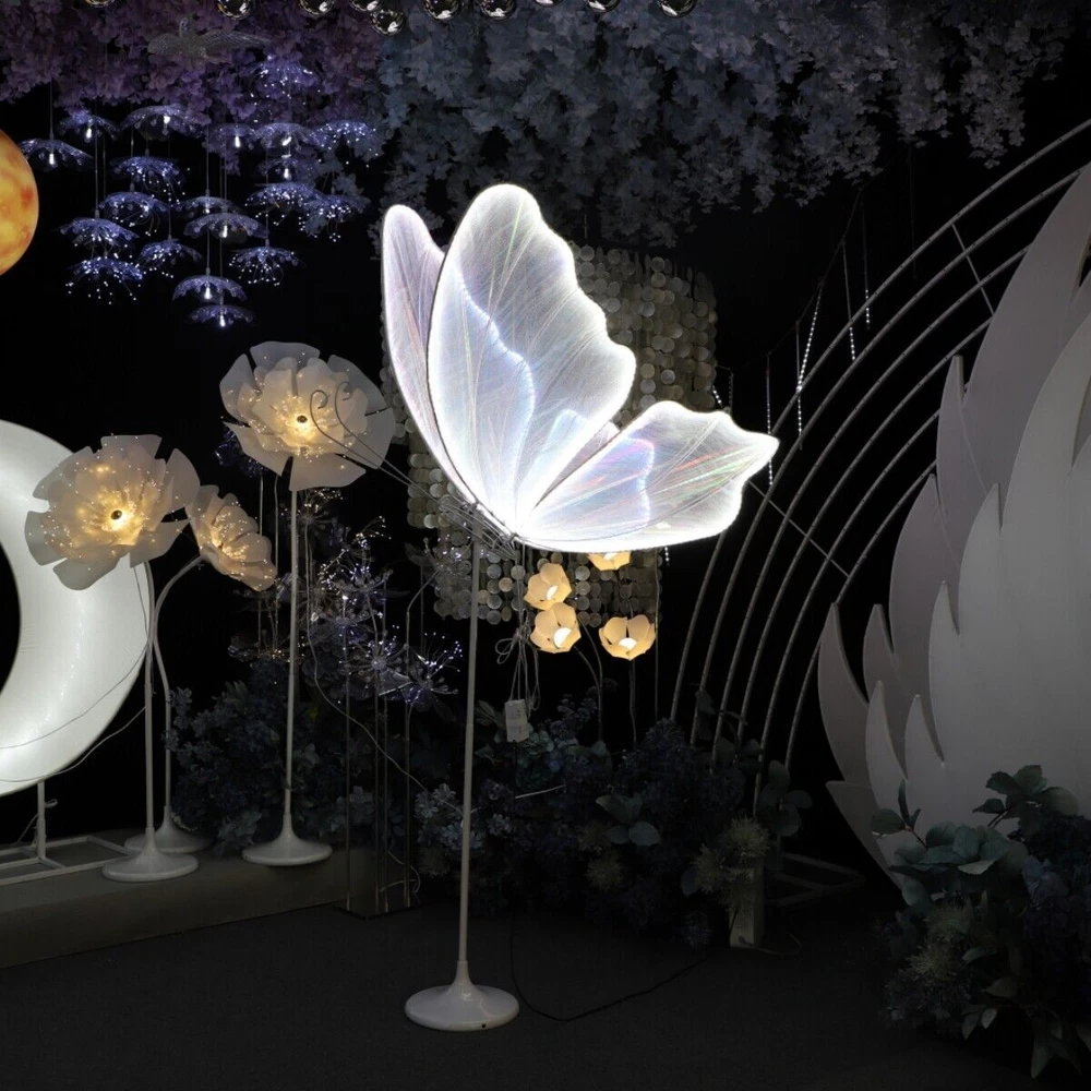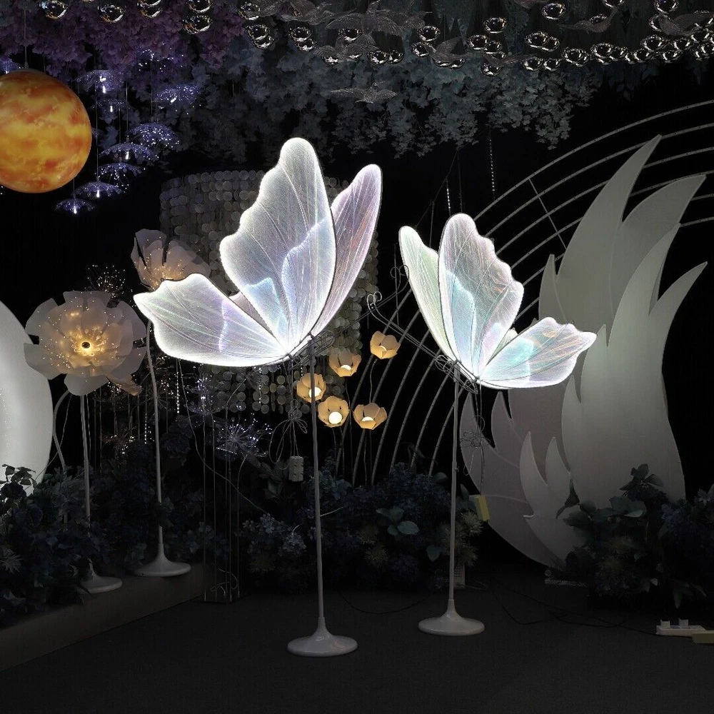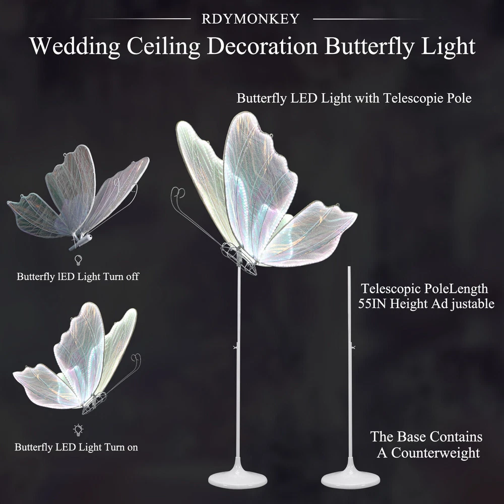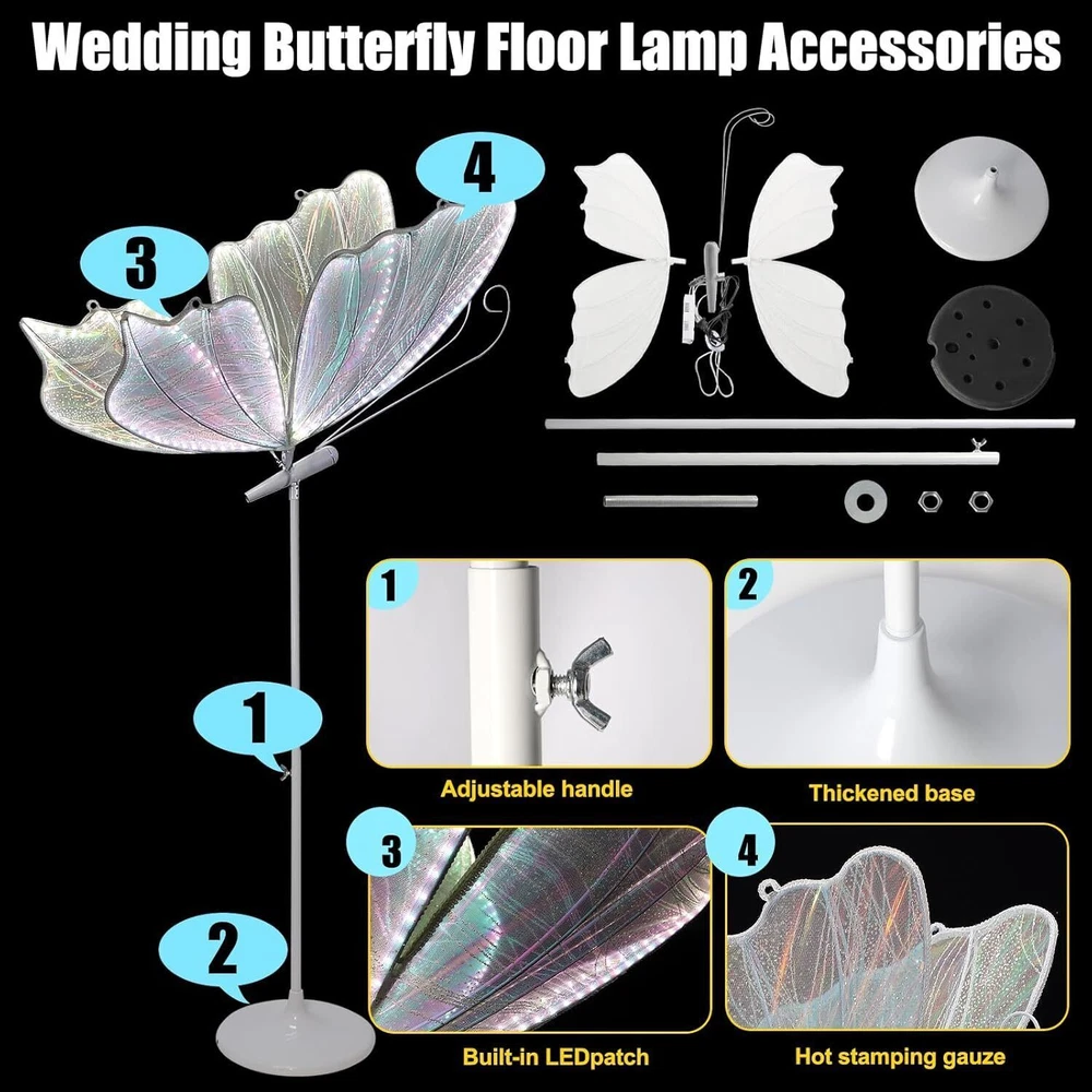 Product Description đŠăWedding Butterfly Floor LampăThe wedding romantic atmosphere floor lamp creates a romantic, warm and elegant atmosphere at the wedding or party venue. It can be used on the floor or ceiling. Butterfly decorations can be matched with flowers and background to bring you a unique romantic atmosphere. đŠăSturdy MaterialăButterfly floor lamp made of iron body + lace cloth + LED light strip, with LED white light (white lace cloth) Butterfly lamp uses built-in LED chip light source,white light (6000K). They can be placed in every corner of the venue to add a warm and romantic light and shadow play. đŠăEasy to InstallăSurface mount, includes all mounting hardware for quick and easy installation, features push button switch for easy adjustment. The package includes the butterfly lamp and base, which can be hung or ceiling-mounted. đŠăApplicable ScenesăWedding Romantic Atmosphere Floor Lamp creates a romantic, warm and elegant atmosphere at the wedding or party venue. Butterfly lamp suitable for wedding stages, T stage street guidance decorative lights, wedding halls, hotel layouts, window layouts, lamps, hotel decorations. Creating a Romantic Atmosphere: These decorative lights typically emit soft lighting, creating a warm and romantic ambiance at the wedding venue. They can be placed in various corners of the venue, adding a cozy and romantic play of light and shadow.