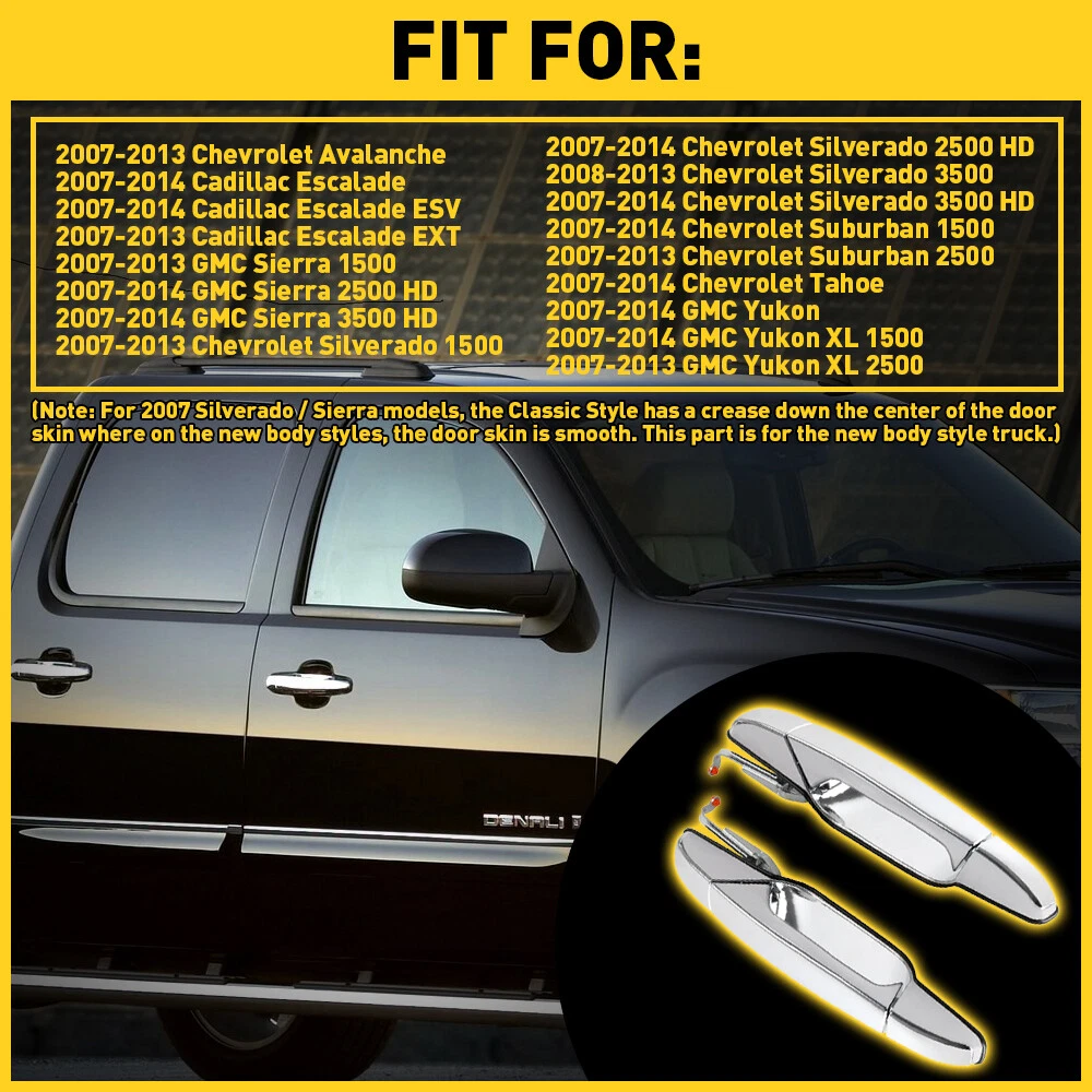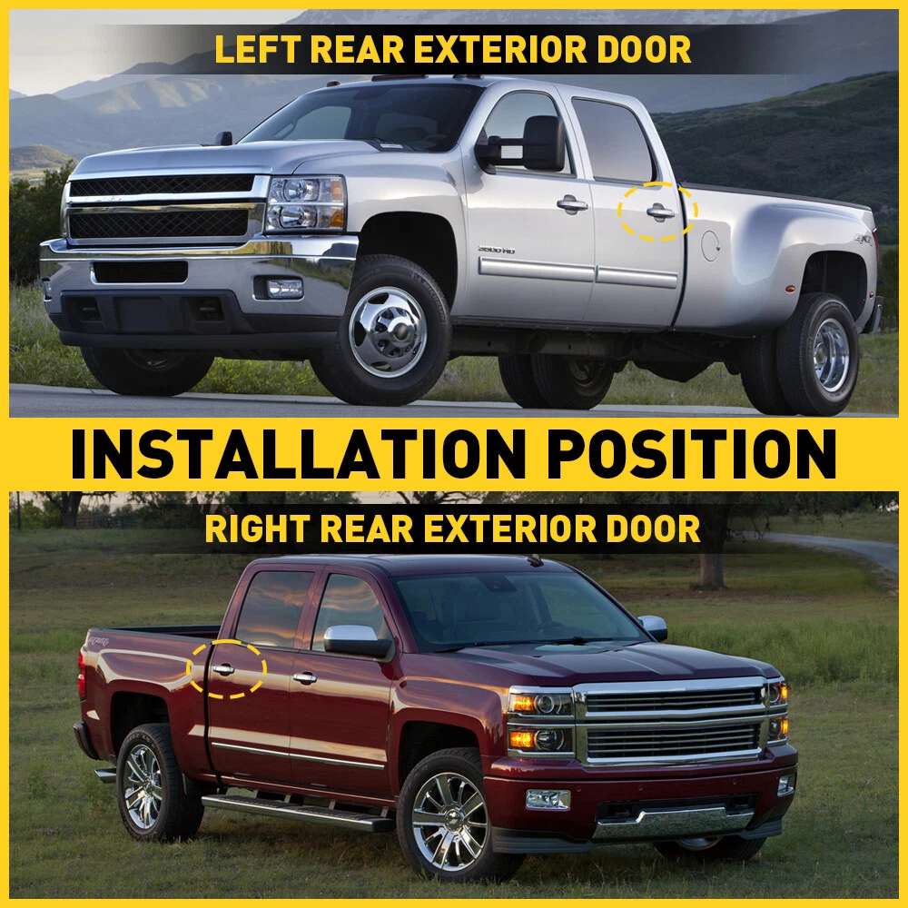 Exterior Door Panel Handle Fits For Chevrolet,Cadillac,Gmc etc Fits for: 2007-2013 Chevrolet Avalanche 2007-2014 Cadillac Escalade 2007-2014 Cadillac Escalade ESV 2007-2013 Cadillac Escalade EXT 2007-2013 GMC Sierra 1500 2007-2014 GMC Sierra 2500 HD 2007-2014 GMC Sierra 3500 HD 2007-2013 Chevrolet Silverado 1500 2007-2014 Chevrolet Silverado 2500 HD 2008-2013 Chevrolet Silverado 3500 2007-2014 Chevrolet Silverado 3500 HD 2007-2014 Chevrolet Suburban 1500 2007-2013 Chevrolet Suburban 2500 2007-2014 Chevrolet Tahoe 2007-2014 GMC Yukon 2007-2014 GMC Yukon XL 1500 2007-2013 GMC Yukon XL 2500 2PC Chrome Door Handles For Left&Right GMC Tahoe Sierra Denali 45486 Colorado Exterior Door Panel Handle Fits For Chevrolet,Cadillac,Gmc etc Fits for: 2007-2013 Chevrolet Avalanche 2007-2014 Cadillac Escalade 2007-2014 Cadillac Escalade ESV 2007-2013 Cadillac Escalade EXT 2007-2013 GMC Sierra 1500 2007-2014 GMC Sierra 2500 HD 2007-2014 GMC Sierra 3500 HD 2007-2013 Chevrolet Silverado 1500 2007-2014 Chevrolet Silverado 2500 HD 2008-2013 Chevrolet Silverado 3500 2007-2014 Chevrolet Silverado 3500 HD 2007-2014 Chevrolet Suburban 1500 2007-2013 Chevrolet Suburban 2500 2007-2014 Chevrolet Tahoe 2007-2014 GMC Yukon 2007-2014 GMC Yukon XL 1500 2007-2013 GMC Yukon XL 2500 Note: For 2007 Silverado / Sierra models, the Classic Style has a crease down the center of the door skin where on the new body styles, the door skin is smooth. This part is for the new body style truck. Specifications: OE number: Left: 15915659 22738725 25960521 80105 GM1520130 Right: 15915660, 22738726, 25960522, GM1521130, 80547 Material: ABS Color:Chrome Placement on vehicle: Exterior(Rear Left & Right) Features: *Perfect fit Manufactured according to original one to match with your vehicle perfectly. *Strict Quality Control All of our handles undergo strict quality control not just before shipping but throughout the production process. *Durable Mainly made of high-quality plastic material to ensure the durability. Packaging include: Door Handle*2 (Rear Left & Right) Item Specifics Brand Unbranded Manufacturer Part Number 25960521 , 22738725; 22738726, 25960522 Type Rear Left & Right Side Exterior Door Handle Other Part Number 15915659 15915660 Placement on Vehicle Rear, Left & Right Side Material ABS Interchange Part Number 15915659, 25960521, 80105;15915660, 25960522, 80547 Fitment Type Direct Replacement Manufacturer Warranty 1 Year Color Black Number of Pieces 1 Finish Chrome Features Durable, Easy Installation, Without Key Hole OE/OEM Part Number ?22738725 22738726 Attachment Type Bolt-On Fit For 2007-2013 Chevrolet Silverado 1500 Fit For 2007-2013 Chevrolet Silverado 1500 Payment We accept PayPal via eBay Secure Check-Out only. Immediate payment needs to be processed for items with Add to Cart option so that any promotional discounts can be applied to your order immediately. Shipping 1 .We do everything we can to ship your orders out as soon as possible. 2. Shipping and Handling: We process orders within two business day after the payment was clear. Returns Our 30-day Satisfaction Guarantee assures our customers that they will receive all orders promptly and exactly as described. In addition, it allows customers to return new and unused products in their original factory condition for any reason within 30 days from the date of purchase. 1. All returns must be pre-approved by AUXITO and have a return merchandise authorization(RMA) number. Unauthorized returns will not be accepted. 2. Buyers are responsible for appropriate packing, returning shipping cost, insurance and returning the item in "new" condition. Used items will not be accepted for return. 3. We will replace the returning item with an identical item, issue a full store credit or a full refund. Contact Us Our Working Time:(GMT+8)Monday to Friday,9:00-18:00. For inquires and customer support, please send your email via ebay email system. All emails will be responded to within 24 hours during business days. Feedbacks 1. We appreciate your business and strived to improve our customer service and our commitment to quality. 2. We will leave a positive feedback immediately after payment is received. We appreciate a positive feedback as much as you do. 3. If for some reason there is any issue with the purchase, please contact us prior to leaving feedback, and we will be glad to work with you to have it resolved. DESCRIPTION PAYMENT SHIPPING RETURN POLICY CONTACT US Hot Item 190 PCS Bumper Fender Moulding Side Garnish Grille Retainer Clip ABS Various USD 10.99 Waterproof Motorcycle Handlebar Dual USB Phone Charger Cigarette Lighter Socket USD 13.29 4" Red Truck Long Performance High Flow Cold Air Intake Cone Dry Filter Cotton USD 27.54 AUXITO 7440/7443 Turn LED Signal Light Bulbs Anti Hyper Flash Amber Super Bright USD 21.84 Fit For 2015-2019 Hyundai Center Light Gray Sonata Armrest Console Lid Cover USD 13.29 Hot Item AUXITO 7440/7443 Turn LED Signal Light Bulbs Anti Hyper Flash Amber Super Bright USD 21.84 190 PCS Bumper Fender Moulding Side Garnish Grille Retainer Clip ABS Various USD 10.99 Waterproof Motorcycle Handlebar Dual USB Phone Charger Cigarette Lighter Socket USD 13.29 Fit For 2015-2019 Hyundai Center Light Gray Sonata Armrest Console Lid Cover USD 13.29 4" Red Truck Long Performance High Flow Cold Air Intake Cone Dry Filter Cotton USD 27.54 2PC Chrome Door Handles For Left&Right GMC Tahoe Sierra Denali 45486 Colorado Exterior Door Panel Handle Fits For Chevrolet,Cadillac,Gmc etc Fits for: 2007-2013 Chevrolet Avalanche 2007-2014 Cadillac Escalade 2007-2014 Cadillac Escalade ESV 2007-2013 Cadillac Escalade EXT 2007-2013 GMC Sierra 1500 2007-2014 GMC Sierra 2500 HD 2007-2014 GMC Sierra 3500 HD 2007-2013 Chevrolet Silverado 1500 2007-2014 Chevrolet Silverado 2500 HD 2008-2013 Chevrolet Silverado 3500 2007-2014 Chevrolet Silverado 3500 HD 2007-2014 Chevrolet Suburban 1500 2007-2013 Chevrolet Suburban 2500 2007-2014 Chevrolet Tahoe 2007-2014 GMC Yukon 2007-2014 GMC Yukon XL 1