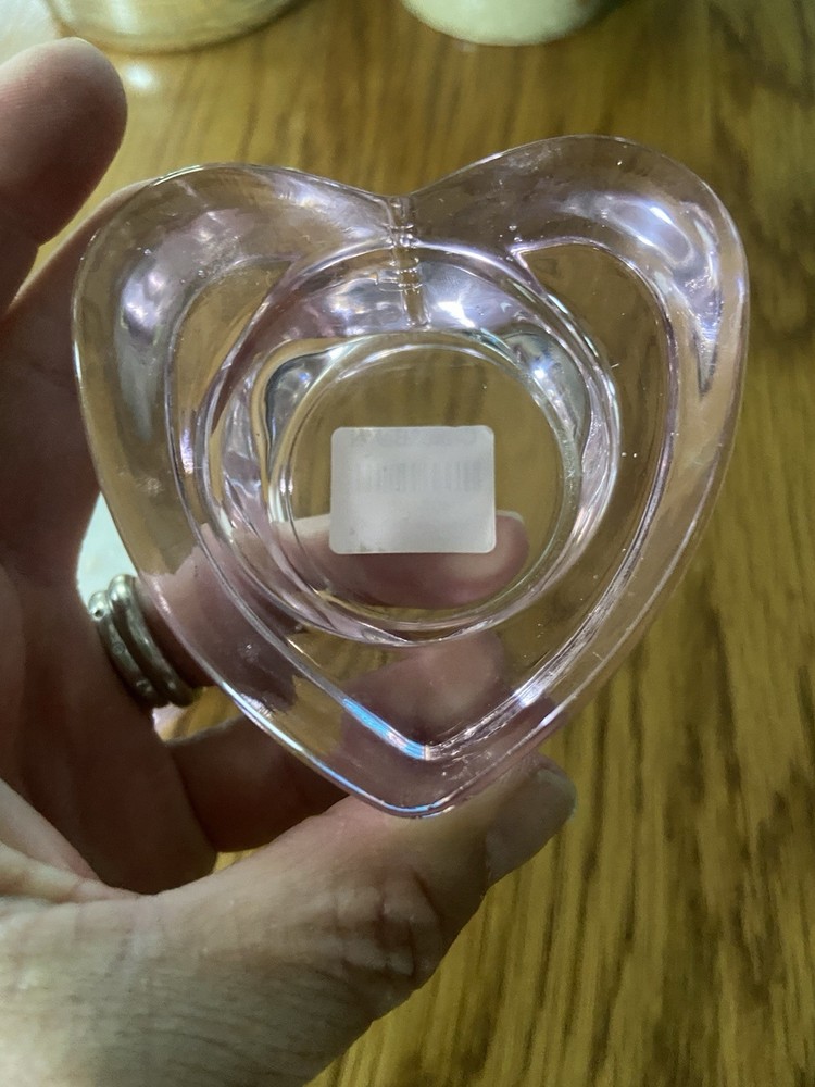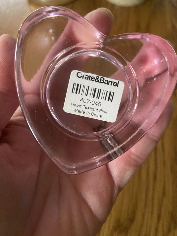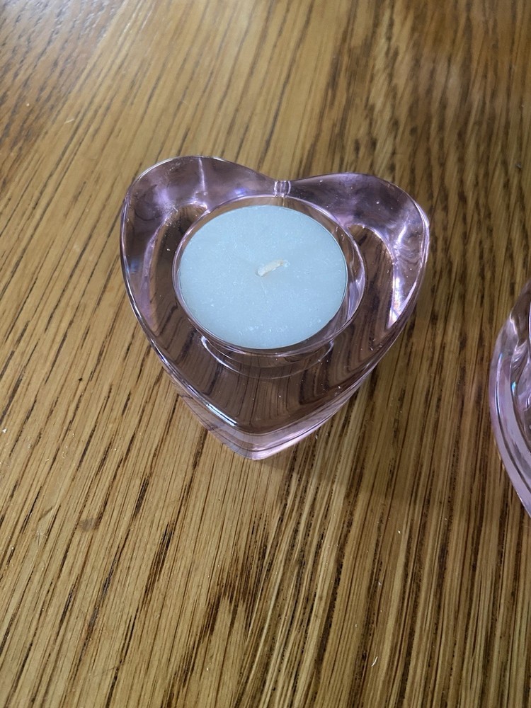 Set of 2 Crate & Barrel Pink Glass Heart Shaped Tea Light Candle Holders. 3 inches wide, 1 inch length