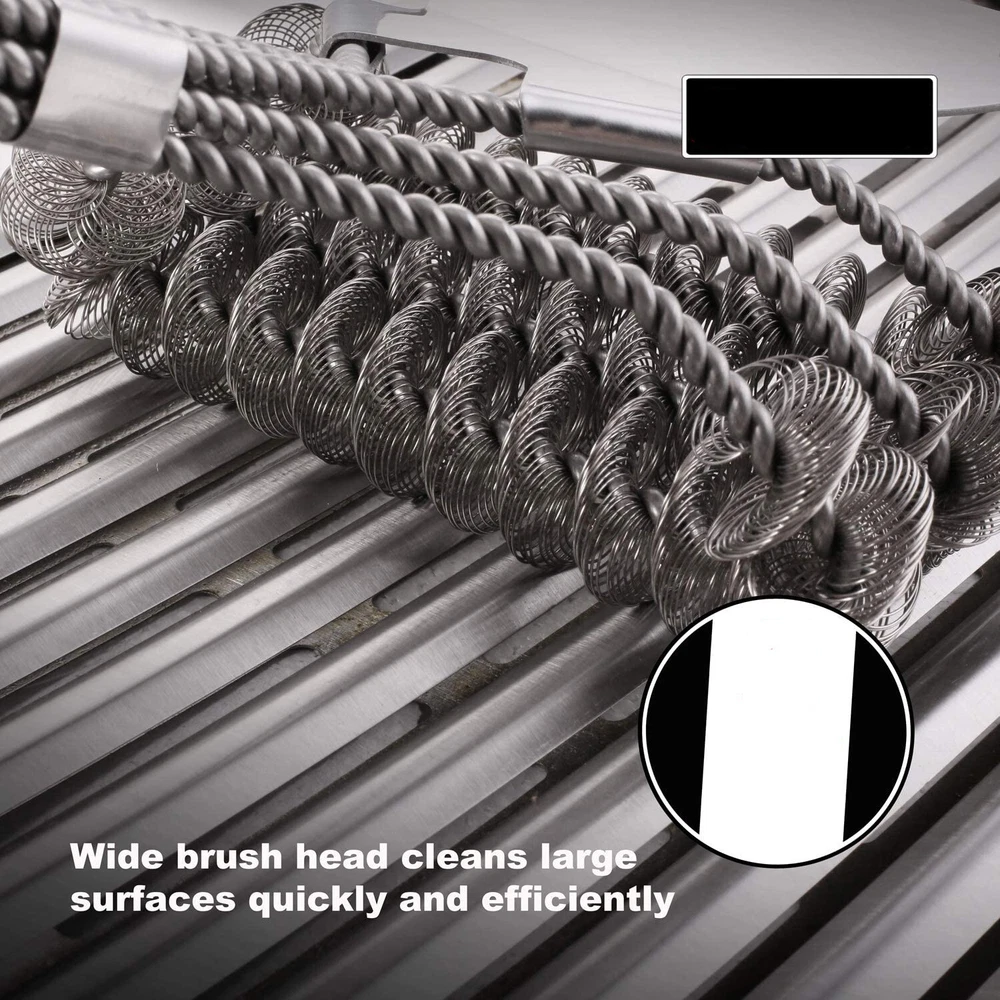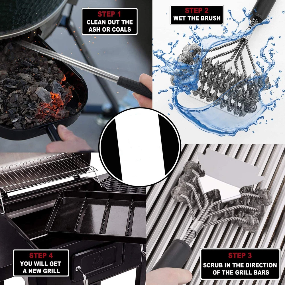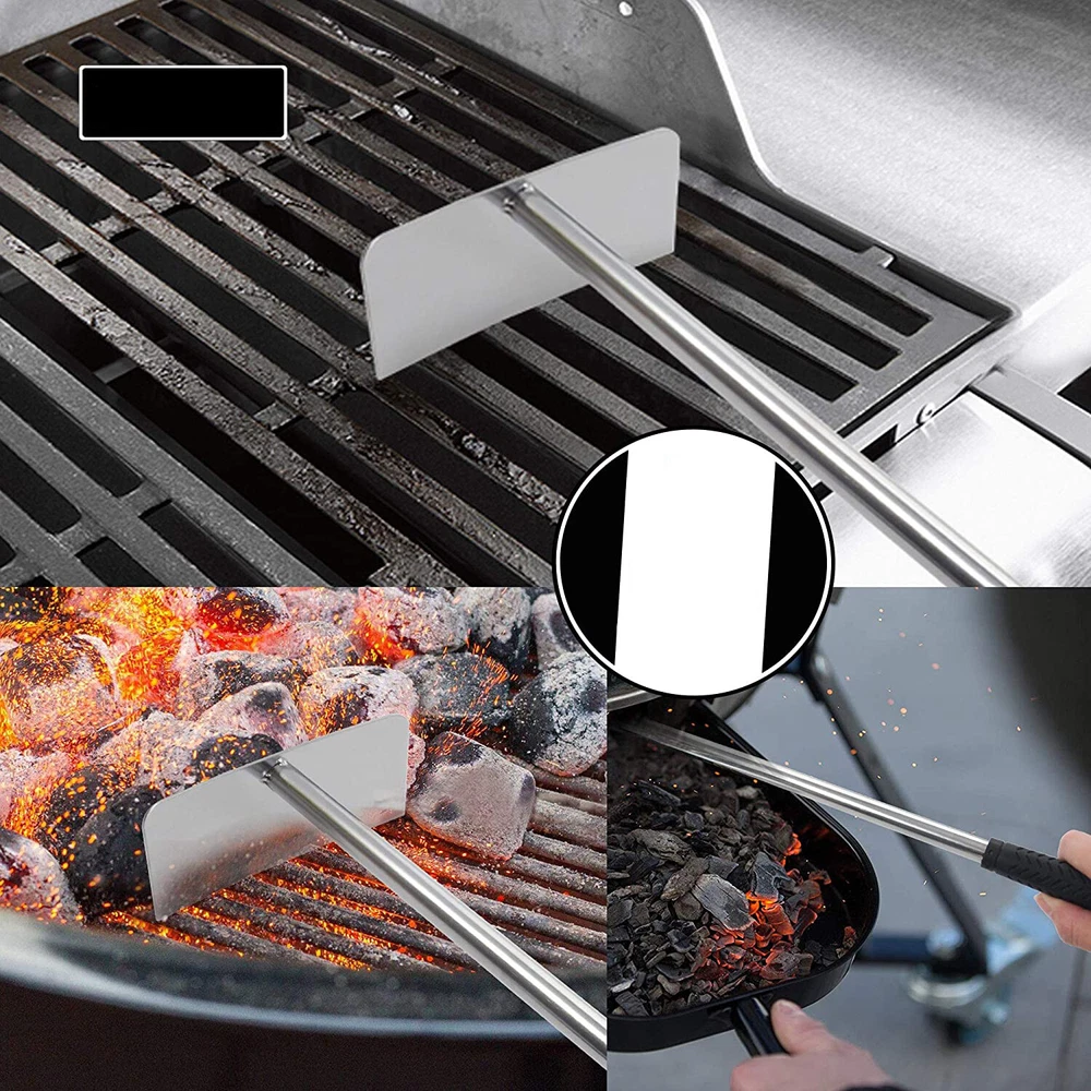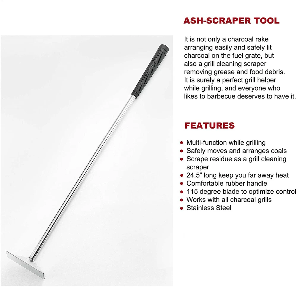 2 Piece BBQ Grill Cleaning Tool Set - Heavy Duty Bristle Free Grill Brush and Elongated Charcoal Rake - Best Stainless Steel BBQ Grill Brush Kit for Weber Charcoal Grills, Smoker, Char-Broil · The Best Mix and Match Grill Cleaning Kit - Includes charcoal & ash tool that firstly clears out the burning residue and grill scraper brush that secondly cleans large surfaces quickly and efficiently. Keep your grill always new with our best grill cleaning kit. · Superior Premium Quality Grill Cleaning Tools - Made of quality stainless steel and ergonomic design handle for long-lasting durability, no rusting, no bending, no breaking, designed safe for ceramic grill, charcoal, smoker, Char-Broil or Weber grill. · 3X Faster Cleaning Bristle Free BBQ Brush - NO BRISTLES FALLING OFF. The safe grill cleaning brush is combined of 3-in-1 brushes and scraper which takes less effort and time to clean every bit of residue with its innovative 360 degree rotator. · Multi-use Charcoal Tool with Elongated Handle - Ash rake comes with elongated rubber handle for convenient working, easily moves and spreads ash/coals/big green eggs, also works as grill cleaning scraper for removing grease and food debris.
