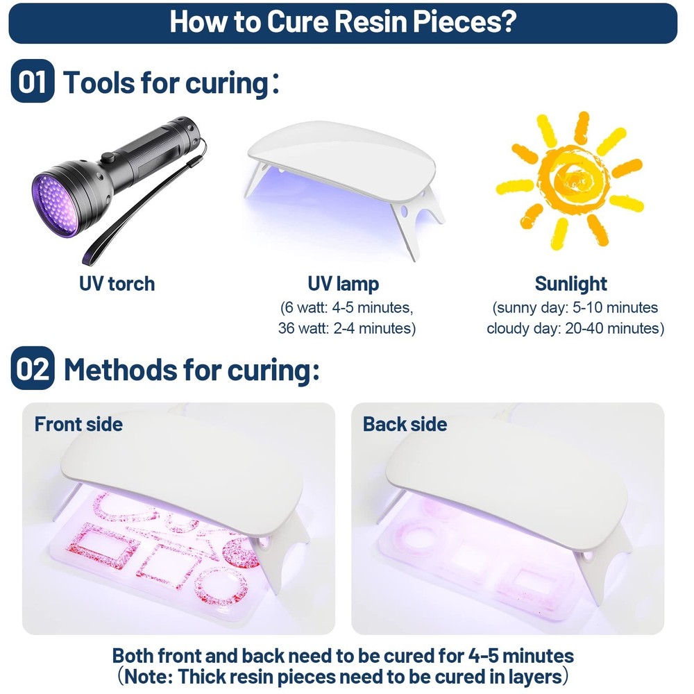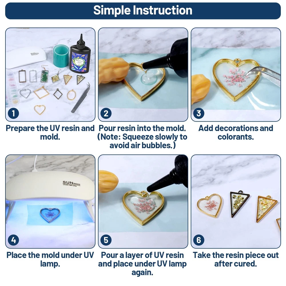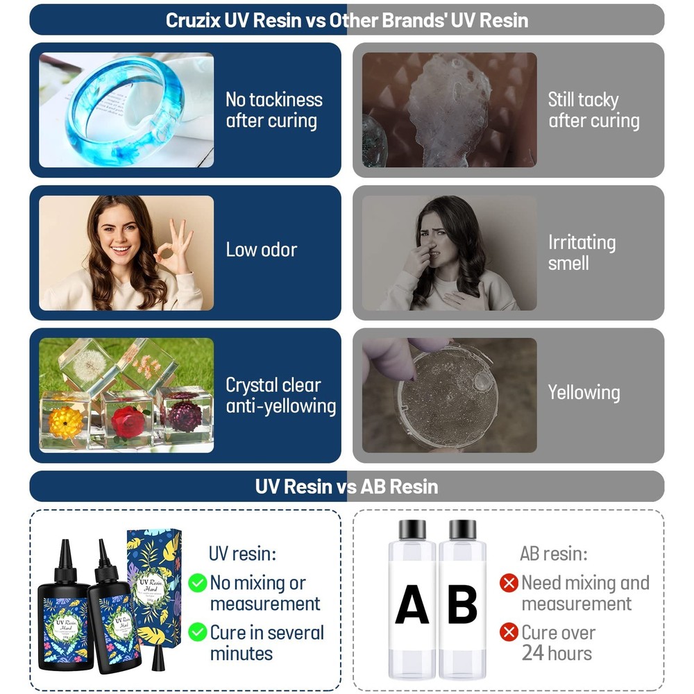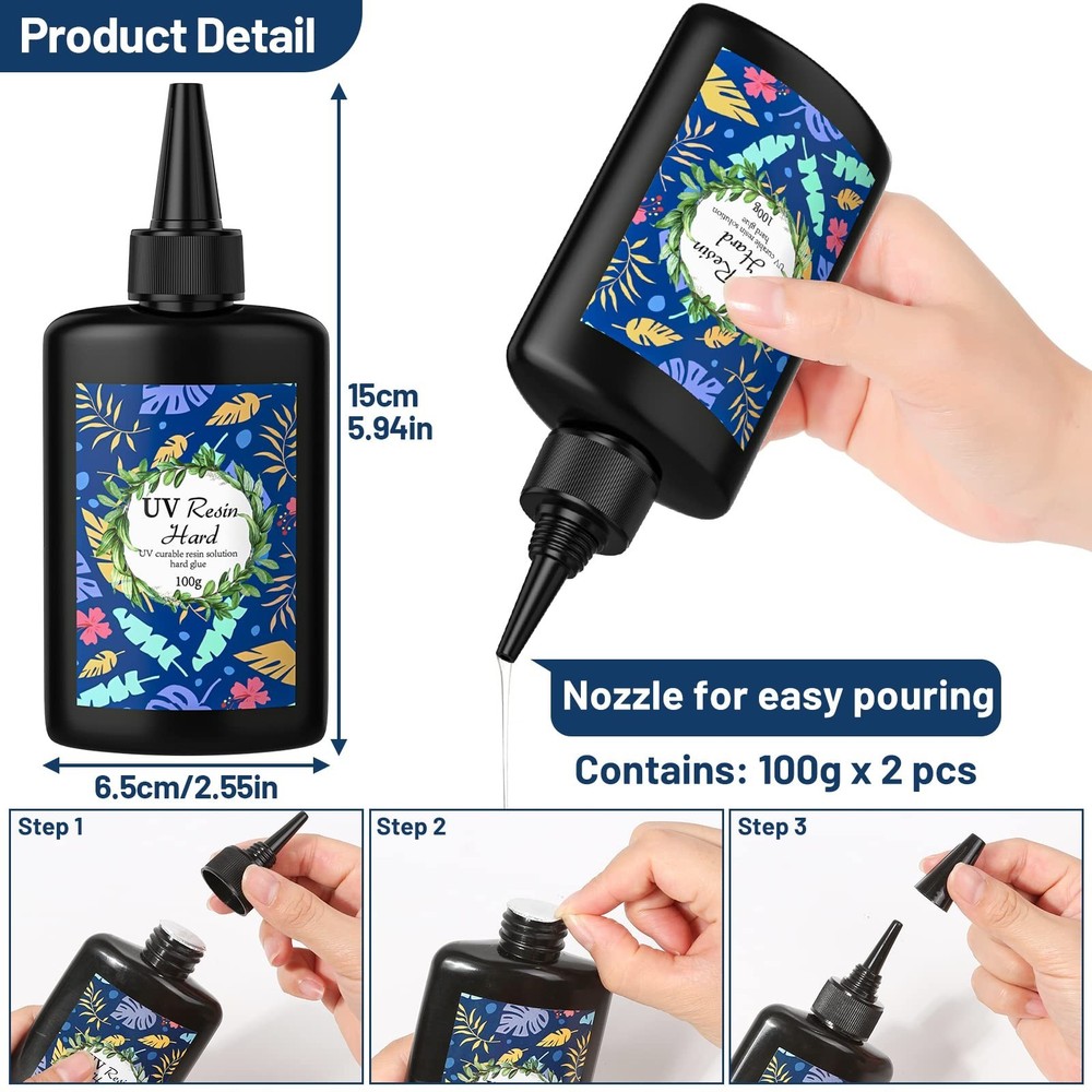 UV Resin Clear Crystal, 2 PCS 100g Upgraded UV Epoxy Resin Glue Hard Type Ultraviolet Fast Curing Solar Cure Sunlight Activated for DIY Jewelry Making Craft Casting Supplies Decoration Product Details Brand: Cruzix Specific Uses For Product: Casting, Craft, Jewelry Material: Epoxy Resin, Resin Compatible Material: Gemstone, Glass, Plastic, Metal Item Form: Liquid Product Dimensions : 4 x 2 x 1 inches; 1 Pounds Item model number : UV Cure Resin Date First Available : April 20, 2022 Manufacturer : Cruzix Best Sellers Rank: #468,081 in Industrial & Scientific (See Top 100 in Industrial & Scientific) #2,498 in Art Glues & Pastes #22,061 in Industrial Adhesives, Sealants & Lubricants #2,498 in Art Glues & Pastes #22,061 in Industrial Adhesives, Sealants & Lubricants Customer Reviews: 4.1 4.1 out of 5 stars 76 ratings What You Get Cruzix resin UV set contains 2 bottles of 100g UV resin glue, which can fully meet your needs for DIY resin projects. Ideal for all resin crafts beginners and lovers. Start enjoying the pleasure of resin glue DIY and share your creative works with us Premium The UV resin clear made of non-toxic materials,self-leveling and self-degassing characteristics, which will help you DIY with UV resin molds more easily. Before curing, the up resin has a slight but non-toxic odor; while after curing, the odor disappears completely, and the UV resin hard doesn't stick or shrink. Your creative resin work would be with a high-gloss glass-like surface that prevents yellowing, scratches, and staining. High Efficiency Design Most importantly, Cruzix UV epoxy resin can be used directly without being measured and mixed in proportion as AB resin; the curing time is shorter, and it only takes 2-4 minutes to cure with the help of 6 watts UV light for resin. Next, its nozzle design is beneficial to squeeze and inject resin rockers UV resin. Third, the flat bottle design is easier to squeeze and use the remaining resin at the bottom of the bottle than a round bottle. Multi-purpose Jewelry Resin It can be widely used in jewelry making (shaker charms, pendants, brooches, earrings, bracelets, etc.), keychains, wings, badge reels, coasters, phone cases, craft decorations, casting and coating, miniatures, resin paintings, etc. It's a good choice as glaze for polymer clay pieces. What's more, it can be mixed with mica powder, colorants, glitter or added dried flowers or small objects to enrich the layering of crafts. Finally, you will get a unique resin craft. Reliable After-sales Service Cruzix is committed to providing you with high-quality crystal clear epoxy resin UV. If you have any questions or problems about our products, please contact us immediately, we promise to provide you with the best solution within 24 hours. Premium Crystal-Clear Fast Curing UV Epoxy Resin Start your extraordinary resin project creation! Why Choose Cruzix Resin UV? It is made of non-toxic materials and will not cause harm to the human body. It is a ready-to-use UV glue, which does not require tedious steps such as measuring and mixing. The self-leveling property of the UV resin clear makes it easier to work with UV resin molds, and its self-degassing property makes the smell disappear completely after curing. It can be cured quickly within 2-4 minutes under a 6-watt UV resin light curing for epoxy, which greatly saves your precious time and improves efficiency. The cured resin craft has a smooth and crystal-clear glass-like finish, which is anti-scratch, anti-staining, and anti-yellowing. Fast Curing under UV Lamp 6W UV resin light: 2-4 minutes Direct Sun (Sunny Day): 5-10 minutes Direct Sun (Cloudy Day): 20-40 minutes Note: 1. UV resin must be used with clear molds, otherwise UV light will not penetrate and the parts will not be cured. 2. The curing time is based on the thickness of your resin project. The thicker your resin project is, the longer the curing time it requires. Package Includes: 2 bottles of 100g UV resin hard Tips: Please keep the resin glue out of the reach of children to prevent them from accidentally using or eating. In addition, children need to be accompanied by an adult to use it