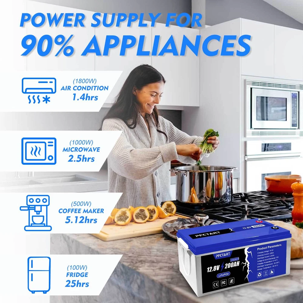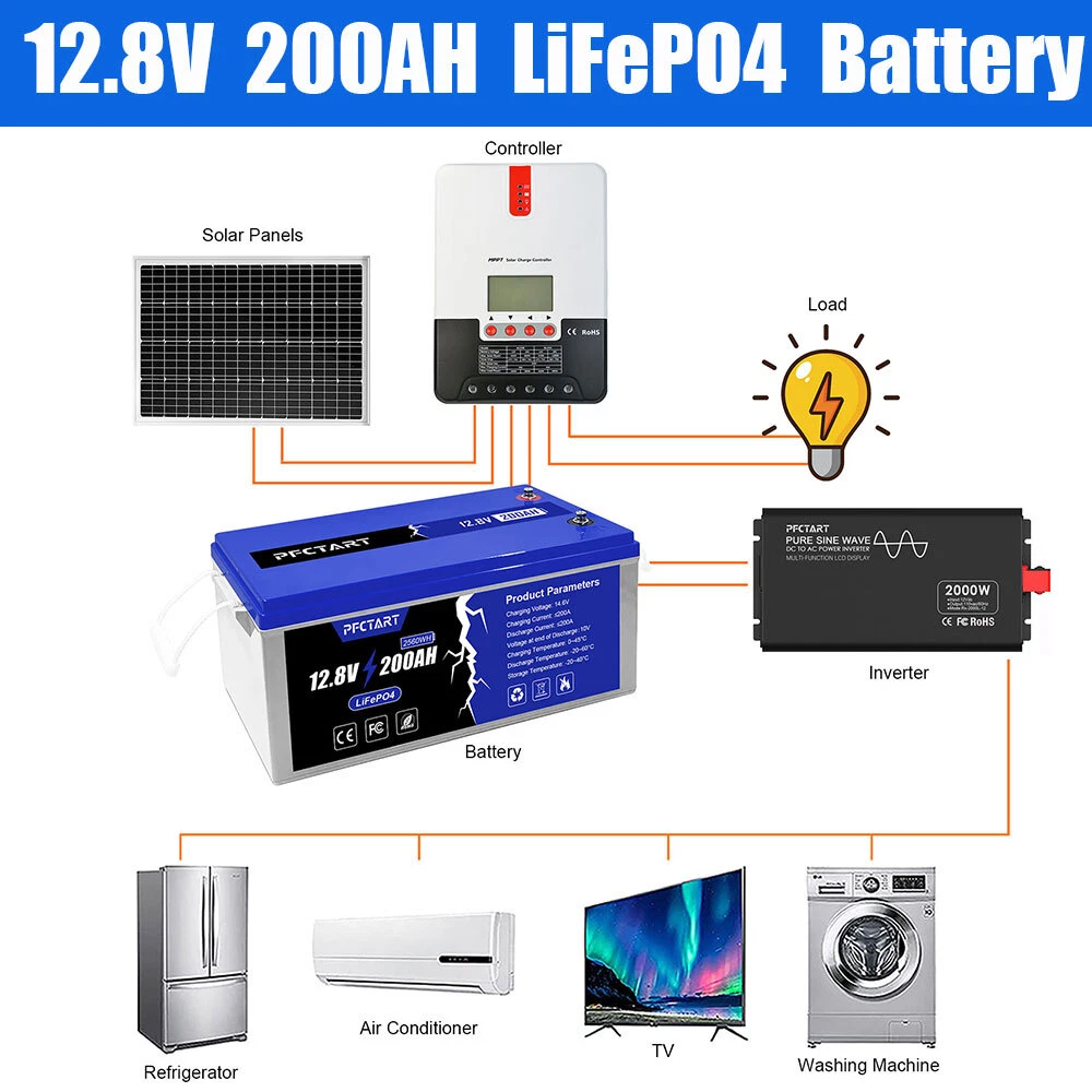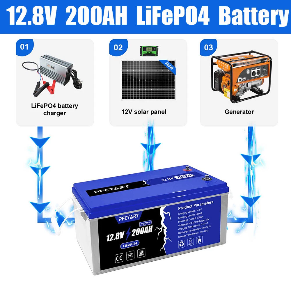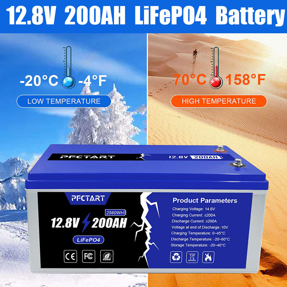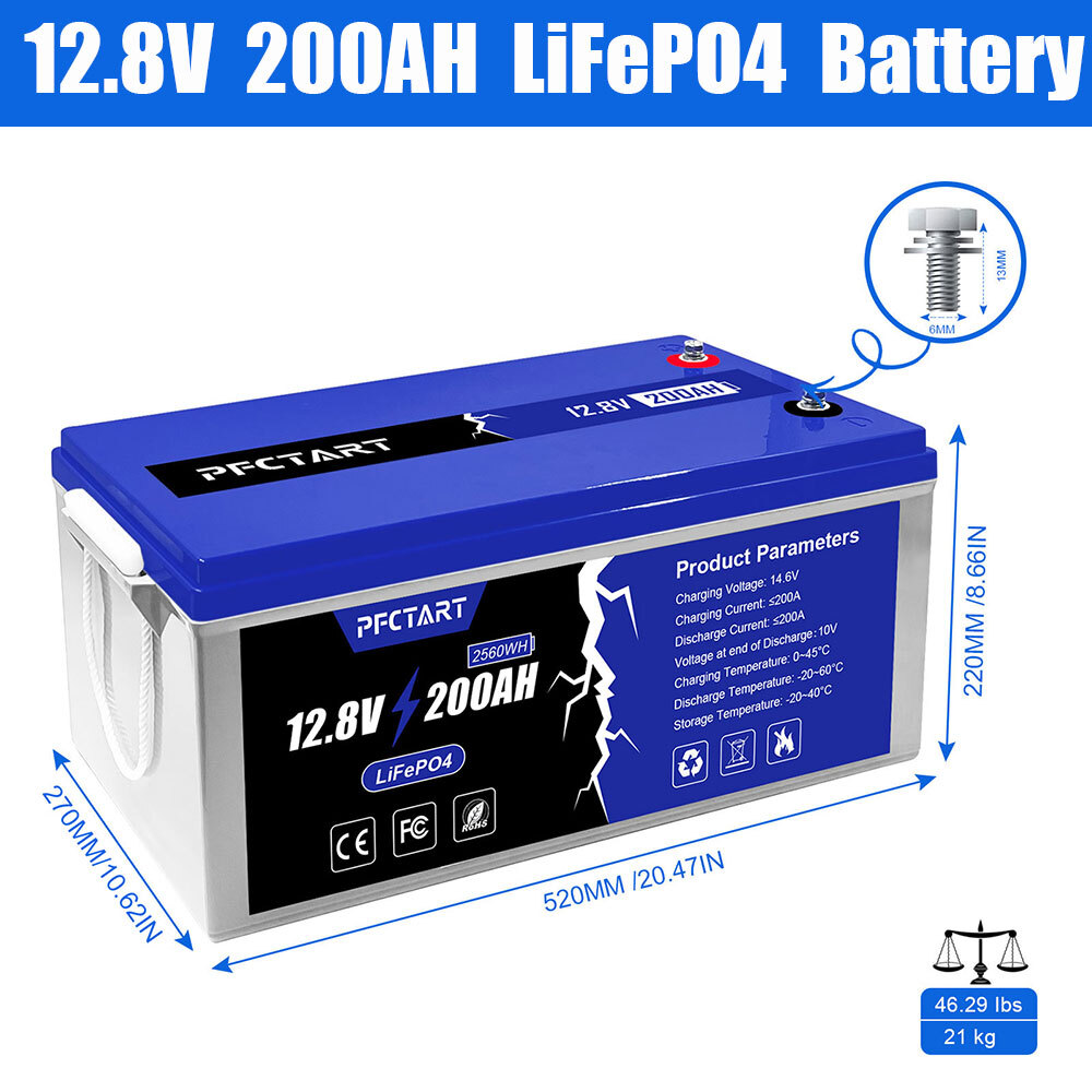 Brand: PFCTART UPC: Does not apply gtin13: Does not apply Application: Camping/Hiking, Home/Garden, Marine, On/Off Grid Solar System, RV Battery Type: Lithium Battery Chemical Composition: Lithium Iron Phosphate (LiFePO4) Amp Hours: 200 Ah Manufacturer Warranty: 10 Years Voltage: 12.8V Battery Size: 520*270*220mm