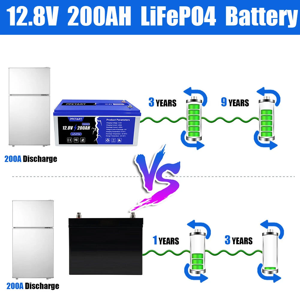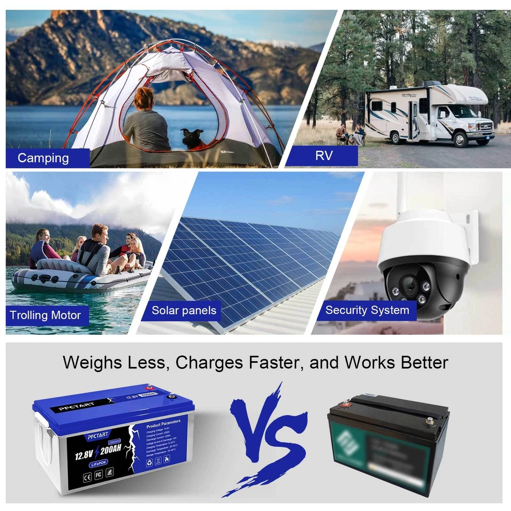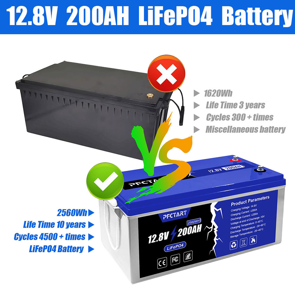 [Automotive Grade Lithium Battery] PFCTART lithium iron batteries have exceptional quality since they are manufactured by Automotive Grade LiFePO4 Cells with higher energy density, more stable performance & greater power. Highest-level safety based on UL Testing Certificate for the cell inside the battery. With no acid in the battery, you're able to safely mount in any position. This makes li-iron batteries perfect for solar home, RV, campers, motor homes, off-grid applications. [10 Years lifetime] PFCTART LiFePO4 battery provides 4500+ cycles (10 times longer) & a 10-year lifetime compared to 200~500 cycles & a 3-year lifetime in lead acid battery. [1/3* Lightweight] PFCTART LiFePO4 Battery Weighting only 25.57 lbs for one module, it’s weighs only 1/3* the weight of lead acid batteries. LiFePO4 battery is 50% lighter than lead acid battery with the same capacity. [95%* Efficiency] PFCTART LiFePO4 battery’s flat discharge curve holds above 12.8V for up to 95%* of its capacity usage, providing astronomical boosts in run-time compared to only 50% in Lead Acid. This product is your best choice for outdoor camping power and indoor easy installation. Without memory effect, no matter what state the battery is, it can be used as soon as it is charged. [100% Protection & Delivery] PFCTART LiFePO4 battery has built-in BMS to protect it from overcharge, over-discharge, overcurrent, and short circuit with excellent self-discharge rate. Operating Temp: Charge: 0°C~50°C; Discharge: -20°C~60°C. Our battery is IP65 waterproof, setting you free from worrying to install indoors or outdoors. The batteries will be shipped from our warehouse in Los Angeles, CA or Dallas, TX according to the inventory and order address to shorten the delivery time [For Trolling Motor] This 12V 100Ah battery is suitable for energy storage rather than start-up and supports a max. discharge current of 1C. Recommended: 12V 100Ah battery for 30~70lbs thrust trolling motor. (For recommendation on other models of trolling motors or starter batteries coming later this year, please feel free to contact us.) Specification Battery type: LIFEPO4 MODEL: 200Ah 12.8V(4S2P) Rated capacity: 200Ah(2560WH) Normal voltage: 12.8V Discharge termination voltage: 10.0V Charging voltage: 14.6V Internal resistance: ≤180mΩ Single cell: IFR 3.2V 100Ah Standard charging. Continuous current: 0.2C5A Continuous voltage: 14.6V Cut-off current: 0.01 C Standard discharge: Constant current 0.2C5A end voltage 10.0V Max. charging continuous current: 100A Maximum discharge continuous current: 100A Operating temperature range. Charge: 0~60℃ Discharge: -20~70℃ Product size: 520*270*220mm Weight : 21 kg BMS protection Cell overcharge detection voltage : 3.90V±50mV Cell overcharge recovery voltage : 3.80V±100mV Cell over-discharge detection voltage : 2.00V±100mV Cell over-discharge recovery voltage : 2.30V±100mV Rated operational charge current : 100A Over current detection : 150±30A PCM impedance : ≤50mΩ Please note : The BMS it supports up to 51.2V series or 16 parallel installations of the same voltage and same capacity (4S4P), please fully charge the batteries before series/parallel installation to ensure that each battery is at the same voltage and same capacity. Q&A Q: Can the battery be installed horizontally? A: Yes, the PFCTART lithium battery is free from lead-acid battery safety problems such as battery leakage and battery corrosion, so it is perfectly okay to place the lithium batteries in any position. Q: When I receive this lithium battery, will it have enough power to use it directly? A: Our lithium battery has a factory capacity of 65%-70%, which can guarantee your basic usage at the moment. If you run out of 65% to 70% of electricity, you can charge your lithium battery with solar panels or grid power. Q: PFCTART batteries waterproof? A: All of our PFCTART LiFePO4 battery has an IP65 protection class, which sets you free from worrying to install it indoors or outdoors. But when charging or discharging the battery, please be careful not to let the post bolts or terminals come into contact with water, as this may damage the battery. Q:Can PFCTART batteries replace my lead-acid batteries? A: PFCTART LiFePO4 battery is considered the perfect replacement battery for the AGM battery. The LiFePO4 battery will become the majority used in the future as it has superior performance compared with other AGM batteries. You can use it to replace your lead-acid batteries and start to enjoy a free & fruitful life. Q:Can I connect PFCTART batteries with AGM batteries? A: We do not suggest you connect PFCTART lithium iron phosphate (LiFePO4) batteries with AGM batteries, as they are two different types of batteries and their charging and discharging are very different.