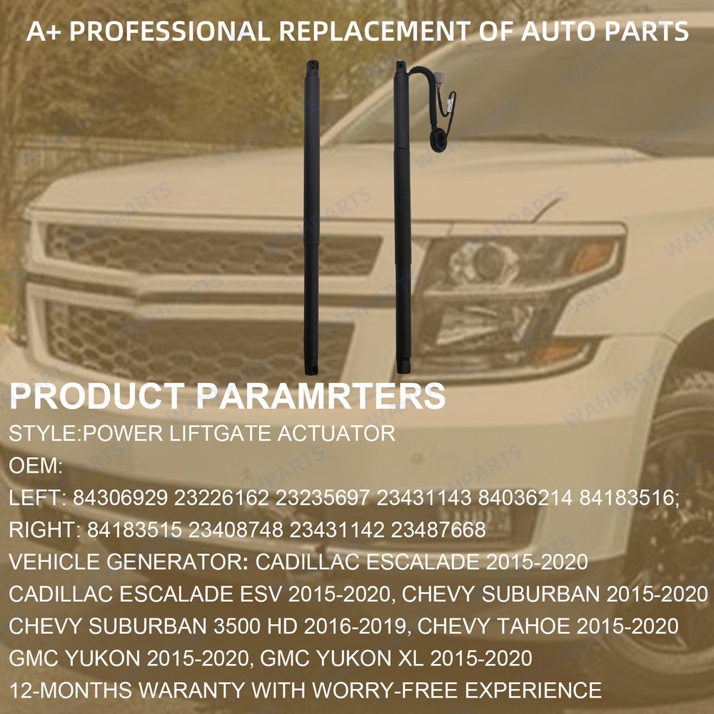 Features & details 【 Compatible with 】 2015-2020 Cadillac Escalade 2015-2020 Cadillac Escalade ESV 2015-2020 Chevy Suburban 2016-2019 Chevrolet Suburban 3500 HD 2015-2020 Chevy Tahoe 2015-2020 GMC Yukon 2015-2020 GMC Yukon XL 【 Replacement OE Number 】 Left: 84306929, 84036214, 84183516 23431143, 23226162, 23235697 Right: 84183515, 23408748 23431142, 23487668 【 Product Advantages 】 Tailgate lift support uses gas springs to easily open and close the tailgate .(Using High Pressure Nitrogen Gas And Silicone Oil As Damper) Made of high-quality Steel material,Strong and durable,and exact equivalent part meets the original manufacturer's specifications and features. 【 Installation Method 】OEM standard, easy to install, direct replacement,if your Lift Supports can not be used flexibly, our products will be your best choice. 【 Warranty & Service 】 Purchase from WAHPARTS, enjoy 1 year no worries-warranty, whenever you met issue when installing or using, please contact us via eBay Message, and we will reply within 24 hours and help solve the problem. Compatible with: Cadillac Escalade 2015-2020 Cadillac Escalade ESV 2015-2020 Compatible with: Chevy Suburban 2015-2020 Chevy Suburban 3500 HD 2016-2019 Chevy Tahoe 2015-2020 Compatible with: GMC Yukon 2015-2020 GMC Yukon XL 2015-2020 Customer Question & Answers Q1: Will This Part Fit My Vehicle? We list all the compatiblity, if your vehicle does not show up on the compatibility table at the top of our listings, welcome you to contact us for free consulation before purchasing a product. Q2: Does they come with warranty? All of our product comes with 1-year warranty, but some times you need to pay the shipping fee. Q3: How to use it? If you don't know how to install this accessory, welcome to contact us, we will provide you with a video guide. Payment Shipping Warranty & Service Returns/Exchanges Contact us Payment Most of the payment methods are available, such as Paypal, Payoneer, Credit Card. Within 1 day of receiving your payment, we will start processing your order. Shipping All Items Will Be Ship Within 1working Days, and We Will Ship out All Orders As Soon As Possible After Payment Verified, Please Allow up to 1-6 Business Days for Delivery. Why Choose the Us Stock? 1. Us Local Shipping, No Extra Customs Cost. 2. Fast Delivery: 1-6 Working Days Delivery. Warranty & Service All the product in our store come with a 1-year-warranty. If there is a problem with the product you purchased within 1 year, please contact us, we will provide you with after-sale protection. Our job is not complete until each customer is satisfied! Receiving positive feedback is extremely important to us. We give all our buyers positive feedback as soon as payment is received Negative feedback and bad ratings do not solve the problem! If you contact us via eBay, we will be more than happy to work with you! Returns/Exchanges If you received an incorrect, damaged, defective, or item not as described , contact us for a partial/full refund or replacement on our costs. If we shipped you the wrong part, we pay for the return shipment and send you the correct part. If you ordered the wrong part, contact us for a return address and simply return it,give us a tracking number. We will send you the new item as soon as the returned package is received; If you simply don't want the part, ship it back and give us a tracking number. After we receive the item, we will refund the item price minus shipping costs. All returns must be done within 30 days after receiving the package. Parts must be new and unused in the original condition: including box, packaging and all other accessories,or we will charge you a partial costs. Contact us If you encounter any problems during purchase or use, please contact us via eBay message directly. On Mar 19, 2025 at 20:13:49 PDT, seller added the following information: