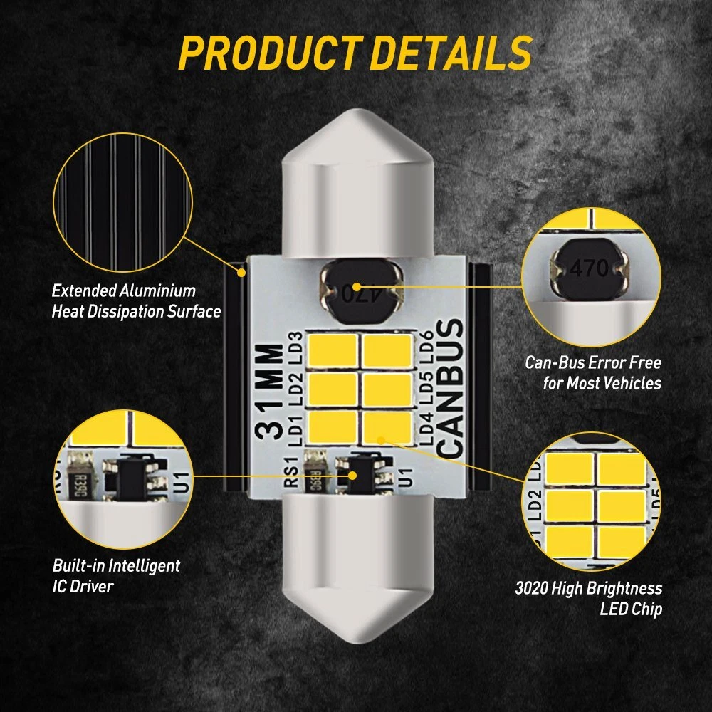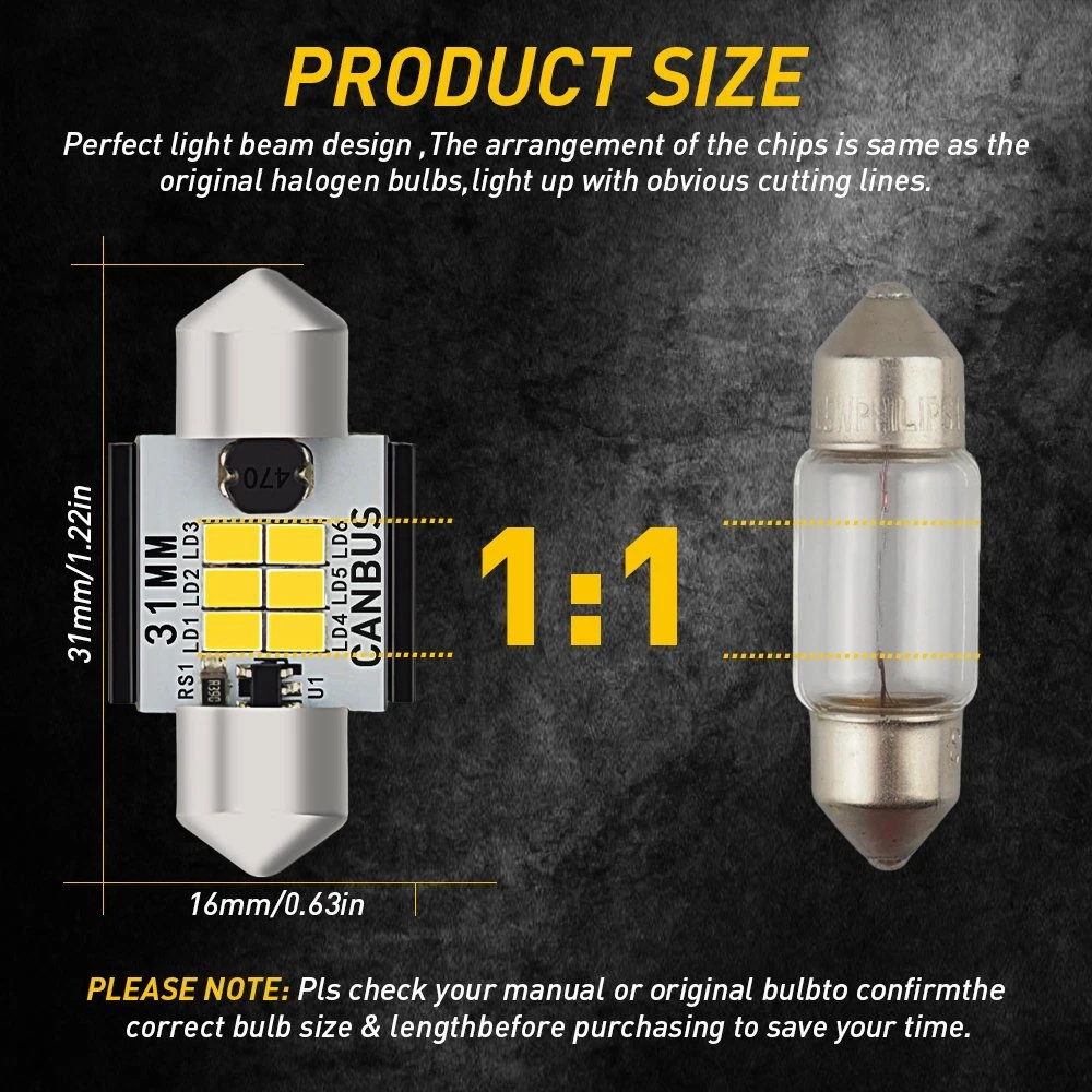 This listing features pair super bright de3175 31 mm white high power 3020-SMD led bulbs, specially designed to replace the interior dome light bulbs, Caubus build in.,Easy installation, just direct plug and play. Specification Canbus: YES, just plug and play, no worries about the error, about Package: including 2X de3175 3020 super white Error free LED bulbs Chips: 6piecese high power & high illumination 3020 LED chips per bulb. Warranty: Full ONE Year guaranteed for manufacturer quality. Color: 6000K xenon white; Length: 31mm (1.25 inch) 2PCS 31MM DE3175 LED Interior Dome Ceiling Read Light Bulb White 6000K Plug Play This listing features pair super bright de3175 31 mm white high power 3020-SMD led bulbs, specially designed to replace the interior dome light bulbs, Caubus build in.,Easy installation, just direct plug and play. Specification Canbus: YES, just plug and play, no worries about the error, about Package: including 2X de3175 3020 super white Error free LED bulbs Chips: 6piecese high power & high illumination 3020 LED chips per bulb. Warranty: Full ONE Year guaranteed for manufacturer quality. Color: 6000K xenon white; Length: 31mm (1.25 inch) Cross Reference: 3021 3022 3175 6428 6430 DE3175 DE3021 DE3023 7065,etc Application: used for side door courtesy lights, interior map lights, interior dome lights, parking lights, city lights, cargo lights, glove box lights, corner lights, trunk area / room lights, step well lights, interior door lights, luggage compartment light for car, truck, scooter, trailer, rv, boat Marine, etc. Voltage: 12V ~ 18V, bulit in IC driver, much more stable current than normal LED bulbs in the marker, long life span. Please Note: Please check your car manual or original bulb to confirm the bulb size, length is correc or not before purchasing to save your time. Item Specifics Brand AUXITO Manufacturer Part Number EXA-31mm-de3175-6p LED Interchange Part Number Interior map dome trunk cargo area step courtesy Other Part Number Bright replace halogen incandescent glove box lamp Placement on Vehicle Front Rear Left Right Upper Lower Manufacturer Warranty 1 Year Type LED To Fit Interior Bulb Fitment Code 31mm Number of Bulbs 2 Light Color Clear Color Temperature 6000K Wattage 5w Payment We only accept PayPal payment, should be received within 3 days from the date of purchase. Please keep the consistency of Paypal address and ebay address. Payment should be made within 4 days once you won a item ,or ebay will launch Unpaid Reminder agaist you and there will be bad record on your ebay account . Buyers are responsible for import duties, custom fees and taxes.Please check with your country's custom office to determine the additional costs before you finally make the purchase Shipping All items will be shipped in 48 hours after receiving your payment . We ship this item to US only via USPS first class mail. It usually takes 3-6 working days to deliver. Returns We offer 30 days return policy. Please contact us within 30 days t from the date you receive your order if you have any issues with the product or want return .Refund will be send after we got your resend package. All returned items should be in the original packaging , return tracking information should be provided .. Buyer is responsible for return shipping cost due to the problem not caused by item quality itself . Contact Us Our office hours are MONDAY - FRIDAY 9:00PM - 6:00PM PST, but we will response you once we get your message .There will be some delay on response if you send message or E-Mail on weekend. FAQ Q1: Will this bulb fit my vehicle? A: We can match almost any vehicle to one of our bulb sizes. eBay only lets us include partial vehicle fitments per listing, but if your vehicle does not show up on the compatibility table at the top of our listings, welcome you to contact us for free consulation before purchasing a product. Q2: My item has not arrived, what's taking so long? A: Sometimes items take longer than expected, especially if it’s going far or to rural area. Check with your post office to see if your item has been held up. Sometimes USPS will not update a tracking number until it has arrived at its destination. If your item still has not arrived after a few days, let us know so we can double check for you and help solve it asap. Q3: Do I need to mention the Year, Make and Model in the notes when place order? A: YES. Please include the Year, Make, and Model in the notes section during checkout to ensure you receive everything needed for your kit! Q4: My bulbs won't fit, help! A: Special bulb holder may be required. See if you can take the holder from the stock bulb. If not, let us know. The bulb size may be wrong, double check the item you received with the item you ordered. Do you have an aftermarket lighting housing? These may not be perfectly fitted for aftermarket bulbs and will require some manual modifications. Q5: Neither side lighting up? Both sides flicker, flash, or work inconsistantly. A:Check the headlight fuses, and then check the ballast plugs to insure correct installation. If this doesn't work, there may be a voltage problem with the vehicle. You probably just need a relay or capacitor. Q6: WARNING ABOUT POLARITY Unlike halogen bulbs, LED are polarity sensitive. BEFORE you start your LED kit installation, verify the polarity on your vehicle by simply plugging the LED bulb into your vehicle socket. - if your light turns on, please proceed to install both bulbs onto your vehicle. - if your light DOES NOT turn on, disconnect the bulb and flip the socket in order to reverse the polarity (this will not damage your vehicle electrical system in any way). Once you made sure the LED bulb turns on, please proceed to install both bulbs onto your vehicle. Note: There is no convention when it comes to polarity. Different car manufactures have different polarity setup, even within the car model the polarity setup on your low beams and high beams might be different. DESCRIPTION PAYMEN