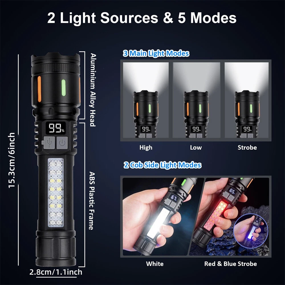 Electric Callus Remover Foot Sander Rough Feet Rechargeable Dead Skin Tools USA 11.98 USD 12.99 USD Free shipping 8% off Super Bright 990000LM Rechargeable LED Headlamp Head Light Torch Flashlight Lamp 12.98 USD Free shipping 19"Men Laptop Backpack Bag Anti-Theft Extra Large Travel School Waterproof Bag 25.59 USD Free shipping Hair Curling iron Short And Long Hair Ceramic Coating Two-Temperature Control 13.99 USD 0.99 USD Cordless Massage Belt Electric Heated with Back Support Waist Vibration Massager 29.59 USD Free shipping Concealed Carry Fanny Holster Tactical Military Pistol Waist Pouch Gun Bag 12.33 USD 12.98 USD Free shipping 5% off Rechargeable Spotlight,Spot Lights Hand Held Large Flashlight 1000,000 Lumens 27.98 USD 2.66 USD Solar Portable LED Flashlight USB Rechargeable Camping Tent Light Lantern Lamps 10.99 USD Free shipping Portable Plasma Pen Mole Removal Dark Spot Remover Skin Wart Tag Tattoo Beauty 16.5 USD Free shipping 36"in Tactical For Gun Bag Gun Padded Soft Case Carbine Hunting Black Backpack 24.29 USD 26.99 USD 0.99 USD 10% off 50PCS GOLF Shoe Spikes Replacement Studs Soft Fast Twist Cleat For Footjoy USA 10.99 USD 0.99 USD TWS Audifonos inalambricos 5.3 Bluetooth Auriculares For iPhone Samsung Android 9.99 USD Free shipping Solar Power 300W LED Torch USB Rechargeable Light Outdoor Camping Tent Lamp Bulb 12.99 USD Free shipping Tactical Helmet Cover for Fast MH PJ BJ Helmet For Airsoft Paintball Helmet Cove 4.99 USD Free shipping Bicycle Motorcycle Mount Invisible Selfie Stick For Gopro Insta360 X3 X4 Max 20.99 USD Free shipping 1000 Lumens Premium Rechargeable LED Flashlight Stainless Steel Pen Light 6.99 USD Free shipping Product Description Description : Super Bright Rechargeable Flashlight: Equipped with upgraded efficient Chip LED chips, the rechargeable flashlight emits a stable and super bright lighting. Since the light penetration is stronger than other same-level lamp beads', its beam can pass through dust and fog well, especially suitable for foggy and rainy days with low visibility. 5 Light Modes & Zoomable Focus: There are 5 modes of the rechargeable flashlight: High / Low / Strobe for the main light, and White / Red&Blue Strobe for the COB side light. Equipped with zoomable head, the small rechargeable flashlight high lumens can emit a powerful focused lighting and an extensive extended lighting by adjusting the light head. Fast Charging & Power Indicator: Built-in a rechargeable lithium-ion battery and equipped with more energy-efficient chips, the rechargeable flashlight battery powered working time is up to 7 hours with the low mode. The USB C fast charging input achieves 30% reduction in charging time. It can be charged by power bank, USB plug, etc, with the USB C charging cable. You can clearly see the remaining power at the digital power indicator. IPX6 Waterproof: This flashlight head adopts the high grade black aluminium alloy, and the frame adopts the ABS plastic. The waterproof grade of this flash light reaches IPX6 Waterproof. This rechargeable flashlight is non-slip, shockproof, waterproof, rainproof, dustproof. It can work well in severe outdoor weather conditions, such as rain and snow. It is an ideal outdoor handheld flashlight for working, hiking, camping, repairing, hunting, and Sogidon fishing. Easy to Carry: Led flashlight is equipped with lanyard and pocket clip, which can be hung on your wrist or attach to your pocket , backpack shoulder strap, hat and belt. As its compact design, you carry this small handheld flashlight in your pocket or the car glove compartment. Specification : Product Type: Flashlight Color: Black Weight: 180g Waterproof: IPX6 Working Time: 4-7hrs Charging Time: 3.5-5hrs Material: Aluminum, Plastic Battery Capacity: 3000mAh Power Source: Battery Powered Charging Method: Type-C Charging Size: 15.3*3.5*2.8cm / 6.02*1.38*1.1inch Lighting Mode: 5 Modes(High / Low / Strobe for the main light; White / Red&Blue Strobe for the COB Side Light) Package Included: 1 x Flashlight 1 x USB Cable Note: Due to the different monitor and light effect, the actual color of the item might be slightly different from the color showed on the pictures. Thank you! Please allow 1-2cm measuring deviation due to manual measurement. Payment Shipping Returns Contact Us 1. This is the payment method we can accept: Paypal 2. You can checkout and pay immediately after the auction ends or you complete the purchases. If you need an eBay invoice sent to you by Email, please contact us before making payments. 3.Once the checkout is completed, you will not be able to include any additional purchases. We start to process and fulfill your order once payment is received. New purchases after the checkout will be processed separately. 4. Payments are expected within 4 days after the order is confirmed. Unpaid item (UPI) strike may be filed with eBay upon non-receipt of payment. 1. How much is the shipping & handling (S&H)? Our shipping and handling charges are clearly stated in the Shipping and Payments section of the item page, and we provide Free Shipping for most items. 2. For multiple purchases, the combine shipping discount will be automatically calculated when you check out and pay all of your purchases together. Items checked out separately may not be combined and the combine shipping discount will not be offered automatically. 3. Please make sure the correct Ship-To address is entered before checking out. Once the payment is completed, you may not be able to change the shipping address. We shall not be held responsible for any wrong or undeliverable addresses. 4. We usually ship within 1-2 business days of receiving cleared payment. 1. We put buyer's satisfaction at top priority. If you're not pleased with your purchases, we'll be happy to make an exchange or refund the item total price less Shipping and Handling (S&H) charges within 30 days of your purchases. 2. For any Exchange, Refund or Return, the item must be in its original condition, includ