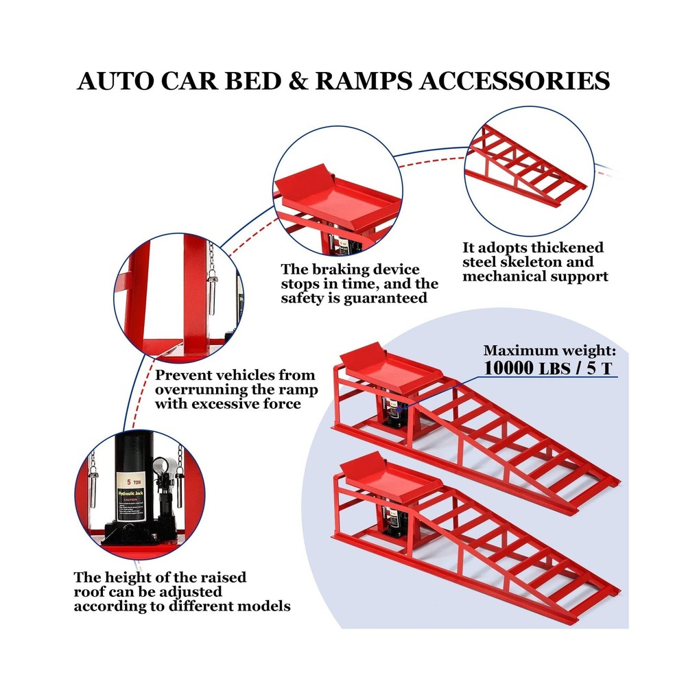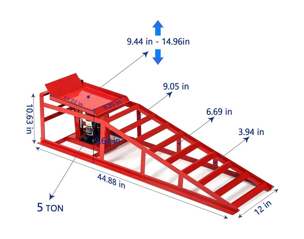2PCS 5T 11070lbs Hydraulic Car Ramps, Heavy Duty Hydraulic Vehicle Ramps Lift Ramp, Portable Car Ramps for Oil Changes, Car Lifts for Home Garage Description 2PCS 5T 11070lbs Hydraulic Car Ramps, Heavy Duty Hydraulic Vehicle Ramps Lift Ramp, Portable Car Ramps for Oil Changes, Car Lifts for Home Garage Features: Adjustable: Hydraulic car ramp lifts 11,070 lbs; height of hydraulic sectionadjustable from 9.84-14.96 in Dimensions: Base plate length: 47.27 inches Base plate width: 10.83 inches Platform length: 15.3 inches Platform width: 9.4 inches High Quality: This heavy-duty automotive repair ramp is constructed with a robust steel frame and features a spray-painted finish for corrosion resistance. Offering exceptional durability and strength, it ensures long-term reliable performance. Suitable for all types of chassis maintenance and inspection tasks. Easy Installation: This heavy-duty hydraulic lift is simple to install, operate, and maintain, making it an ideal choice for repair work and a favorite among automotive technicians. Premium After-Sales Service: Our hydraulic car repair ramps are suitable for professional repair shops and home garages. We take pride in delivering high-quality products. Should you have any questions about our car ramps, please feel free to contact us. Product Details: Brand: Worcest Material: Alloy Steel Color: Flame Item Weight: 83.8 Pounds Product Dimensions: 14.57"L x 10.83"W x 45.27"H Brand: Worcest Material: Alloy Steel Color: Flame Item Weight: 83.8 Pounds Product Dimensions: 14.57"L x 10.83"W x 45.27"H Load Capacity: 1.107E+4 Pounds Is Foldable: No UPC: 717067763280 Item Weight: 83.8 pounds Manufacturer: Worcest Item model number: 001 Date First Available: November 7, 2025 Delivery We Do Not Ship Outside of the Continental US. Return Policy All items qualify for returns within 30 days of receipt. Seller is responsible for return shipping on any item that is not damaged. Feedback We take our reputation seriously, we buy and sell online, so we understand the value of trust. If you are unsatisfied with your order, please contact us and we will work with you to resolve it to your satisfaction.