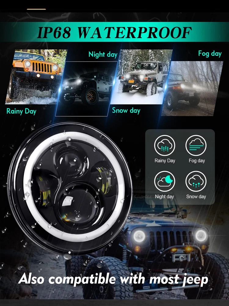 2PCS 7" Inch Round LED HEADLIGHTS Hi/Lo Beam Sealed Fit For 1965 -1973 Ford Mustang Features: * Chrome 7" Round LED Headlight with high low beam. Easy Install: 30 Minutes or Less. With a pair H4 - H13 wire adapter, fit varies vehicle with different plug. * High-Quality LED Chips:Upgrade High Power LED Source: 400% brighter than original halogen and HID factory headlight. The halo lights made with advanced LED chips to give out bright and white rays for clear visibility and broader illumination range, making your driving safe. * Excellent Heat Dissipation & Waterproof The housing of the led headlight is made with Die-cast aluminum and has high heat dissipation performance. This product is weatherproof, waterproof, energy efficient, durable and long-lasting. It can be effective against rain, snow, and heavy fog weather. Die-cast aluminum alloy heat sinks effectively extend the lifespan of the headlight to over 80,000 hours. * Main LED headlight provide cool 6000K white bright light to improve driving conditions drastically. * Low Voltage Protection, High precision Constant Current Driver Chip. * Built in Internal Fan and Integrated Cooling system Specification: Size: 7 inch Housing Color: Chrome Lighting Mode: High Beam + Low Beam Wattage: 120W/PC LED: High Intensity LEDs Voltage: DC 10-30V(fit 12V 24V vehicles) Lumens Output: 13000 LM ( High Beam), 6500 LM ( Low Beam) Waterproof Rate: IP68 Housing Material: Aluminum Color Temperature: 6000K Low Power Consumption, Life Span: 80,000Hrs. Certifications: DOT, SAE Warranty: 5 Years Package Included: 2 x Chrome 7" Round LED Headlight 2 x H4 to H13 Wire Adapters (install instruction is not included) Application: For Any Vehicle models with 7 inch Round headlight,such as: For Jeep Wagoneer (1963-1978) For Jeep CJ-7 (1976-1986) For Jeep CJ-8 Scrambler (1981-1985) For Jeep Wrangler TJ 2 Door (1997~2006) For Jeep Wrangler LJ unlimited (4 Door) (2004~2006) For Jeep Wrangler JK 2 Door (2007~2018) For Jeep Wrangler Unlimited JK 4 Door (2007~2018) For Chevy Camaro (1969-1981) For Mazda Miata MX5 MX-5 (1990-1997) For Honda Civic (1976-1981) For Ford Custom 500 (1971/1976) For Ford F100 Pikcup (1969-1974) For Ford F150 (1975-1979) For Toyota Corolla (1969-1980) For Toyota LandCruiser (1979-1987) For Toyota Pickup (1979-1981) For Oldsmobile Omega (1974-1979) For Plymouth Barracuda (1964-1974) For Plymouth Valiant (1963-1976) For Land Rover Defender 90 (1997) For Land Rover Defender 90 (1995) For Land RoverRange Rover County Classic Sport Utility 4-Door 1995 For Land Rover Range Rover (1987-1995) For Jeep Wrangler (1997-2015) For Land Rover 90/110 1983 to 1991 (including 2.5N/A, 2.5 Turbo, V8) For Land Rover 90/110 Defender 200 Tdi For Land Rover 90/110 Defender 300 Tdi For Land Rover 90/110 Defender Td5 For Land Rover 90/110 Tdci For Hummer H1 H2 (2003~2009) (H2 needs 9007 male to H4 female adapter, package not included) For Lada 4x4 urban Niva For UAZ Hunter For Suzuki Samurai For Kenworth T-2000 1998-2010(Buyer Note, Our Headlight plug is H4,H4-H13) For Puch G and Mercedes G models For 1990-1997 Mazda Miata For 1976-1977 Mazda Mizer For 1979-1985 Mazda RX-7 For 1976-1977 Mazda 808
