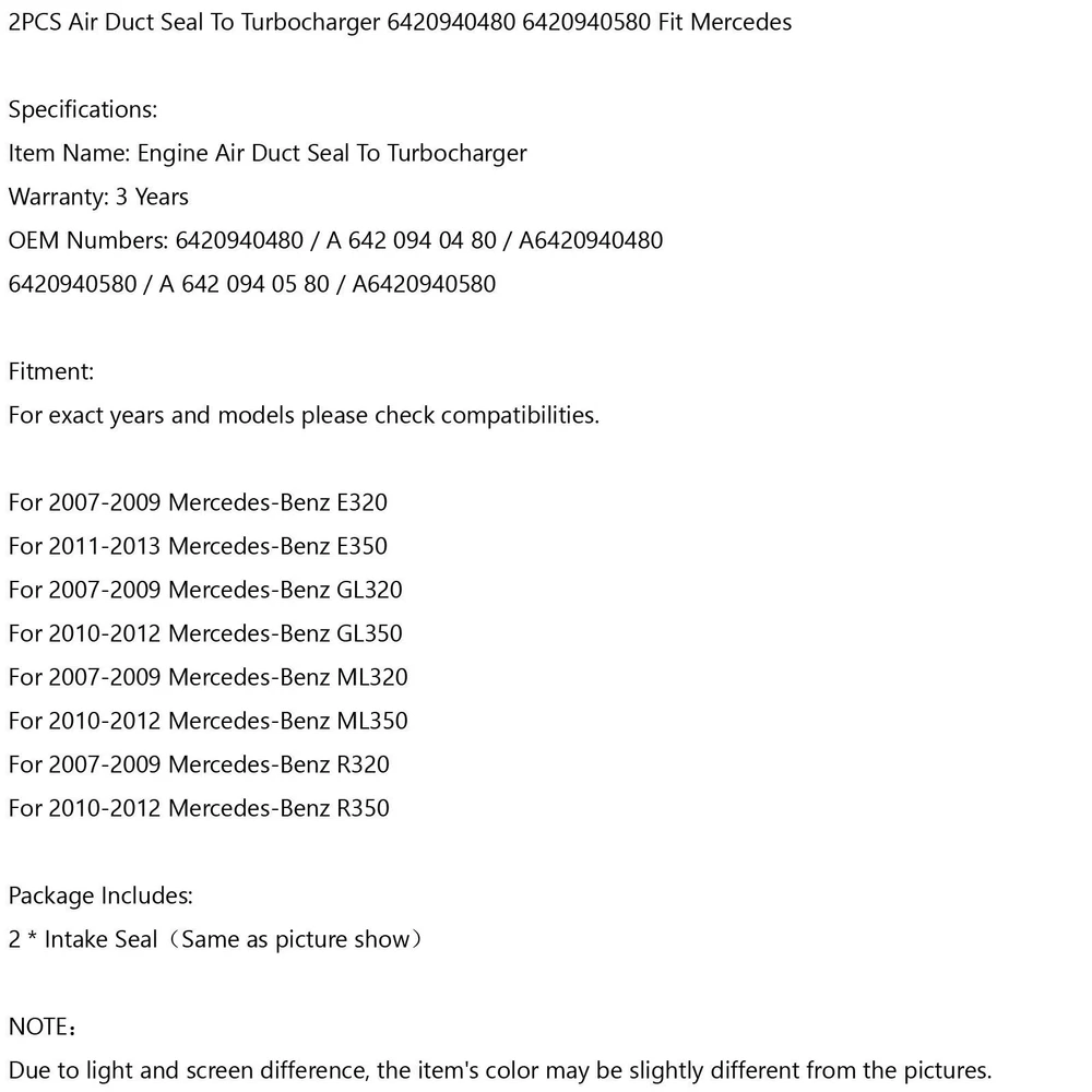 SAFE & SECURE SHOPPING 100% SATISFACTION GUARANTEED FAST SHIPPING Store Categories Store Categories Other eBay Motors Grille You may also like Rear Left/Right ABS Speed Sensor 34526752683 For BMW 3 Series E46 330CI SG U4 16.65 USD Free shipping 2x Tailgate Cable M159508 For John Deere Gator HPX615E HPX815E U4 16.14 USD 16.99 USD Free shipping 5% off 2× Windshield Wiper Arm Nut Cover 55155765AA For Jeep Wrangler 2018 8.64 USD Free shipping Clear lens Side Marker Light For 99-04 VW Golf Jetta Mk4/98-04 Passat B5 B5.5 U4 8.65 USD Free shipping Right Side Car Rearview Mirror Cover Matte Black For Ford Fiesta 2009-2015 U4 16.77 USD 17.65 USD Free shipping 5% off 2PCS New Vintage Style California License Plate Year & Month Tag Holder !! 15.99 USD Free shipping 2PCS Air Duct Seal To Turbocharger 6420940480 6420940580 Fit Mercedes U1 U4 Product Description 2PCS Air Duct Seal To Turbocharger 6420940480 6420940580 Fit for Mercedes Specifications: Item Name: Engine Air Duct Seal To Turbocharger Warranty: 3 Years OEM Numbers: 6420940480 / A 642 094 04 80 / A6420940480 6420940580 / A 642 094 05 80 / A6420940580 Fitment: For exact years and models please check compatibilities. For 2007-2009 for Mercedes-Benz E320 For 2011-2013 for Mercedes-Benz E350 For 2007-2009 for Mercedes-Benz GL320 For 2010-2012 for Mercedes-Benz GL350 For 2007-2009 for Mercedes-Benz ML320 For 2010-2012 for Mercedes-Benz ML350 For 2007-2009 for Mercedes-Benz R320 For 2010-2012 for Mercedes-Benz R350 Package Includes: 2 * Intake Seal(Same as picture show) NOTE: Due to light and screen difference, the item's color may be slightly different from the pictures. About Us Shipping Terms Contact Us About Us Bruce & Shark is a company Focus on Motorcycle parts more than 11 years. The design inspiration comes from the awe of the vast sea and worship of the fighting sharks, therefore Bruce & Shark takes a shark as brand logo. Since its inception, we have always put the "customer first" and "top quality" as our principle. We specialized in selling Motorcycle parts and providing customers with various types of high-quality products. Our brand Bruce & Shark has enjoyed good reputation in America, Europe, Japan, Canada and Africa, covering more than 30 countries. Our vision is to deliver high-quality Motorcycle parts products and sincere services to the world. Our main products are motorcycle mounted, fuel pump, stator, windshield, Seat Cover, motorcycle fairing. Welcome to our shop to choose products that are worth more for your Motorcycle! Please Add me to your list of favorite sellers and visit often. Thank you for your business. Shipping Shipping Terms International Buyers – Please Note: 1. Import duties, taxes and charges are not included in the item price or shipping charges. These charges are the buyer’s responsibility. 2. Please check with your country’s customs office to determine what these additional costs will be prior to bidding/buying. 3.Buyers' Information: We strive our best to provide you the most reliable, affordable way of shipping service. But sometimes international delivery is highly depended on the courier company and local customs/duties. If you do not receive your item on time, please sent us ebay message immediately for further assistance. Thank you for your understanding. Terms We stand behind everything that we sell and will do everything possible to assure you are satisfied. When you receive your purchase if you are not 100% satisfied, please sent me ebay message and we will do our best to make you happy. If you still want to return your purchase, simply ship the item(s) back to us and we will refund your original purchase price and the original shipping charge. Buyers are responsible for the postal cost of returning the items. We must be notified of the intent to return your item within 30 days of receiving the item. Items returned must be in the same condition that they were received. How to return 1,Please ask us for return address . 2,Shipping back the package . The RMA#(Return Merchant Authorization Number = Your ebay ID) must be clearly written on the return package ,Otherwise the package will be refused. 3,Sent us the return tracking number. 4,All returns will be inspected prior to a credit being issued. Contact Us Sent ebay message in English If you have any questions, our Customer Service staffs welcome you to sent me ebay message. We strive to answer all questions and resolve any problems as quickly as possible. Business Hours: HongKong Time GMT+8:00 Monday-Saturday 9:00-17:00 Copyright © Bruce&Shark All rights reserved