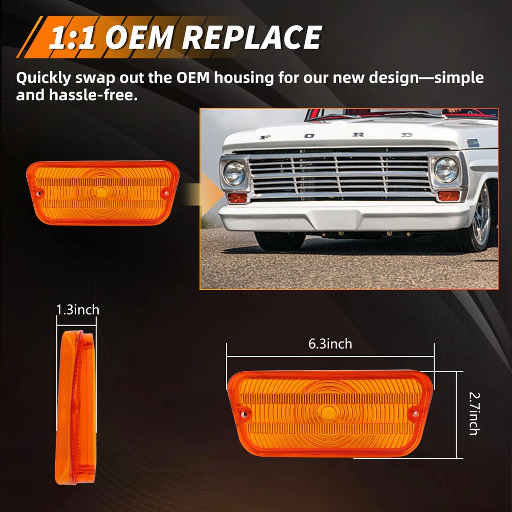 Product Detail Copyright©MotoringPlus Details This page features One Pair (2 Pieces) OEM-Spec Amber Front Bumper Turn Signal Lights Lenses For For 1967-1971 Ford F100 F-100 Truck These lenses are made with high-quality Polymethy l Methacrylate (PMMA) and Polycarbonate (PC) plastics No modification required! Each piece is easy to install with an OEM fit, Instantly transform your car and give it a modern and trendy appearance and feel! Note: Bulbs, Housings & socket adapters are NOT included Specifications: 100% Brand new and quality Lens Color: Amber A complete set of two lenses, replacement for the driver side & passenger sides Compatible With 1967-1971 Ford F100 F-100 Directly replace or repair your car's front bumper turn signal lamp lenses CE DOT SAE approved Application: For 1967 1968 1969 1970 1971 Ford F100 F-100 Please make sure you have available space in your car for these lenses to fit before placing or der. Package include: 2PCS Driver & Passenger side Front Bumper Turn Signal Light Lenses (Amber Lens) Installation: Direct replacement the OEM parts without any modification needed Note: Professional installation is highly recommended! Returns Policy Shipping Policy Payment Method About US Contact Us Returns Policy Please check actual stock bulb model & housing size before purchasing replacement bulbs. Compatibility list on eBay listing is not a complete list and it is a known issue that there are errors on it. Half year warranty from the purchased date. Please contact us via ebay message before returning the defectived item. Our warranty does not extended to any products that are physically damaged or that are not under normal operating conditions as a result of misuse or improper installation on the buyers/user's part. Return items should include the original packaging and all accessories. Buyers MUST contact us for the returning address. In all cases, buyers pay shipping fees at their own cost to return products for exchange or refund. We will be responsible for the postage of replacements. Refund will be made upon receipt of the returned item. Our goal is to make sure you are a happy buyer and pleasant shopping with us. If you have any problems, please contact us immediately before leaving us any negative or neutral feedback. We understand the concerns and frustrations you might have, and will do our endeavor to resolve the issues. Please give us the opportunity to resolve any problem. Shipping Policy Item will be shipped from China / Hongkong Post by Standard International Post. All orders will be shipped to buyer's paypal shipping address within 24 hours after receiving your verified payment (Excluding Weekends and Public Holidays) International order may takes about 15-25 business day delivery time for most countries. Transactions on weekends or public holidays,item will be sent later on work time. Payment Method We accept Paypal ONLY. Unpaid transaction will be cancelled after 8 days About US Contact Us We are dedicated to providing you the best shopping experience and high quality items at a very low price. If you are satisfied with our service,Please remember to leave us 5 STAR for All Detailed Seller Ratings If you found any problem/issue of our merchandise/service,please let us know before leaving any negative feedback! Please feel free to contact us if you have any question. Any message will be replied within 24 hours. We will try our best to help! Home Payment Shipping About us Contact us Copyright©MotoringPlus Home Payment Shipping About us Contact us Store Categories Store Categories SIDE MARKER LIGHT TURN SIGNAL LIGHT TAIL BRAKE LIGHT LICENSE PLATE LIGHT DECODER OTHERS Other Product Detail Copyright©OFFKAT Why Buy From Us Why Buy From Us Details This page features One Pair (2 Pieces) OEM-Spec Amber Front Bumper Turn Signal Lights Lenses For For 1967-1971 Ford F100 F-100 Truck These lenses are made with high-quality Polymethy l Methacrylate (PMMA) and Polycarbonate (PC) plastics No modification required! Each piece is easy to install with an OEM fit, Instantly transform your car and give it a modern and trendy appearance and feel! Note: Bulbs, Housings & socket adapters are NOT included Specifications: 100% Brand new and quality Lens Color: Amber A complete set of two lenses, replacement for the driver side & passenger sides Compatible With 1967-1971 Ford F100 F-100 Directly replace or repair your car's front bumper turn signal lamp lenses CE DOT SAE approved Application: For 1967 1968 1969 1970 1971 Ford F100 F-100 Please make sure you have available space in your car for these lenses to fit before placing or der. Package include: 2PCS Driver & Passenger side Front Bumper Turn Signal Light Lenses (Amber Lens) Installation: Direct replacement the OEM parts without any modification needed Note: Professional installation is highly recommended! Returns Policy Shipping Policy Payment Method About US Contact Us Returns Policy Our 60-day Satisfaction Guarantee assures our customers that they will receive all orders promptly and exactly as described. In addition, it allows customers to return new and unused products in their original factory condition for any reason within 60 days from the date of purchase. Buyers are responsible for appropriate packing, returning shipping cost, insurance and returning the item in "new" condition. Used items will not be accepted for return. We will replace the returning item with an identical item, issue a full store credit or a full refund. Our goal is to make sure you are a happy buyer and pleasant shopping with us. If you have any problems, please contact us immediately before leaving us any negative or neutral feedback. We understand the concerns and frustrations you might have, and will do our endeavor to resolve the issues. Please give us the opportunity to resolve any problem. Shipping Policy We only ship to paypal confirmed address. Item will be sent within 24 hours after payment received We will ship all orders asap. from ou
