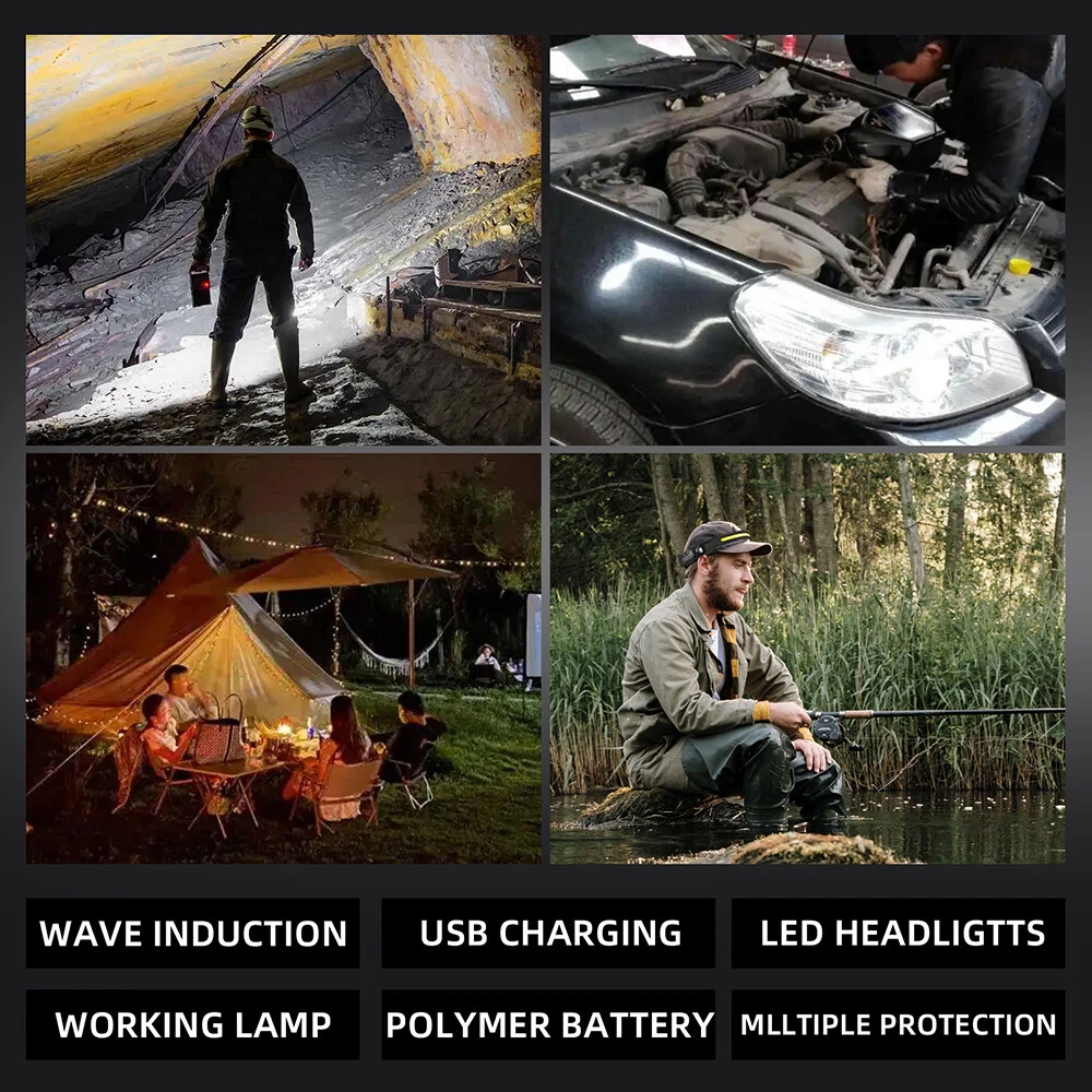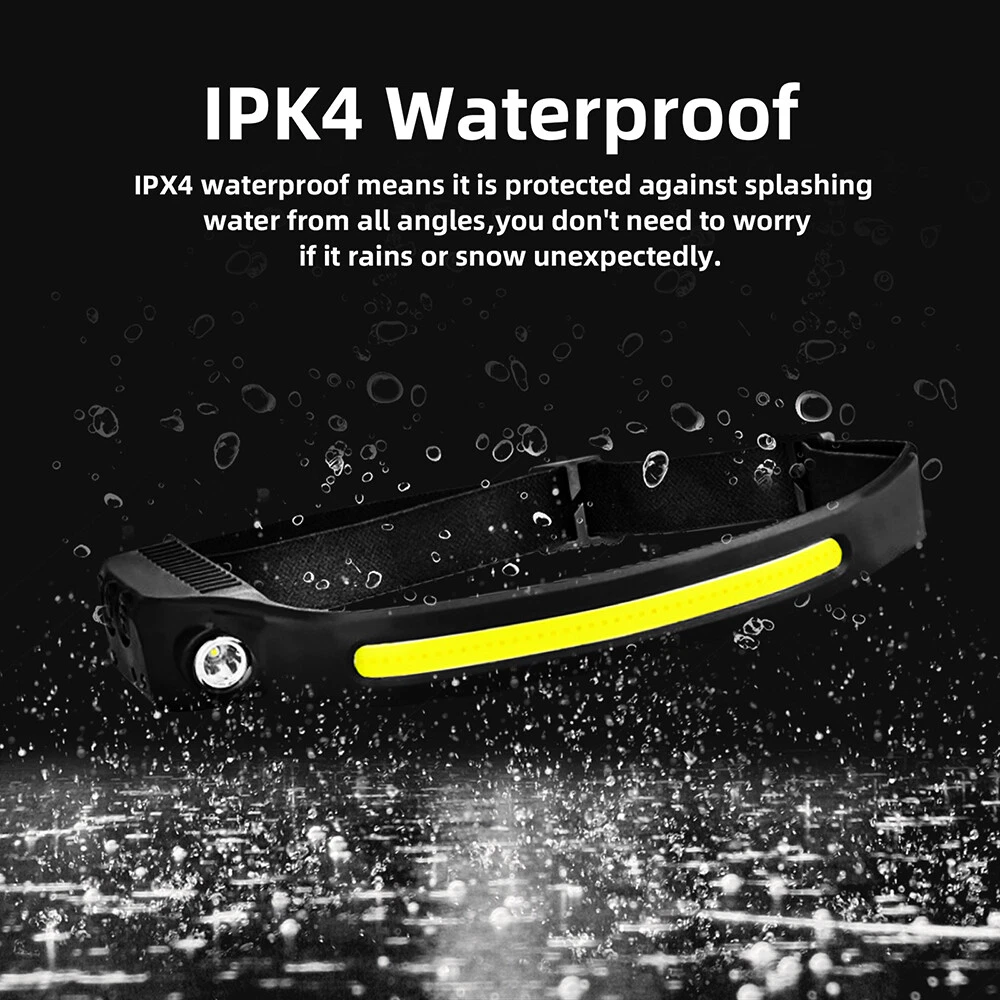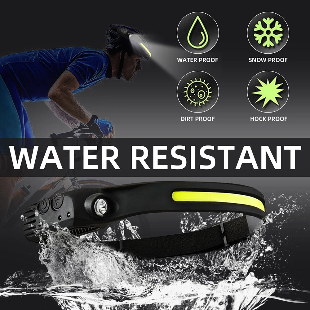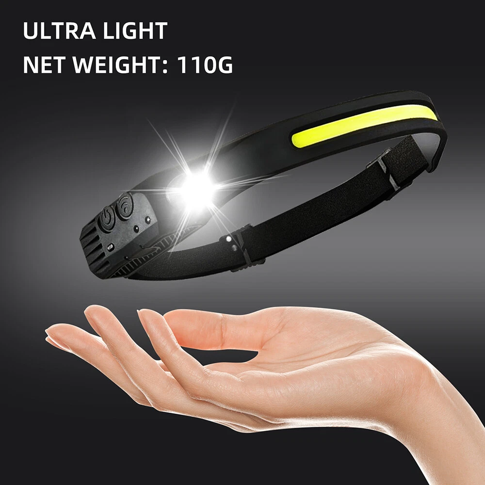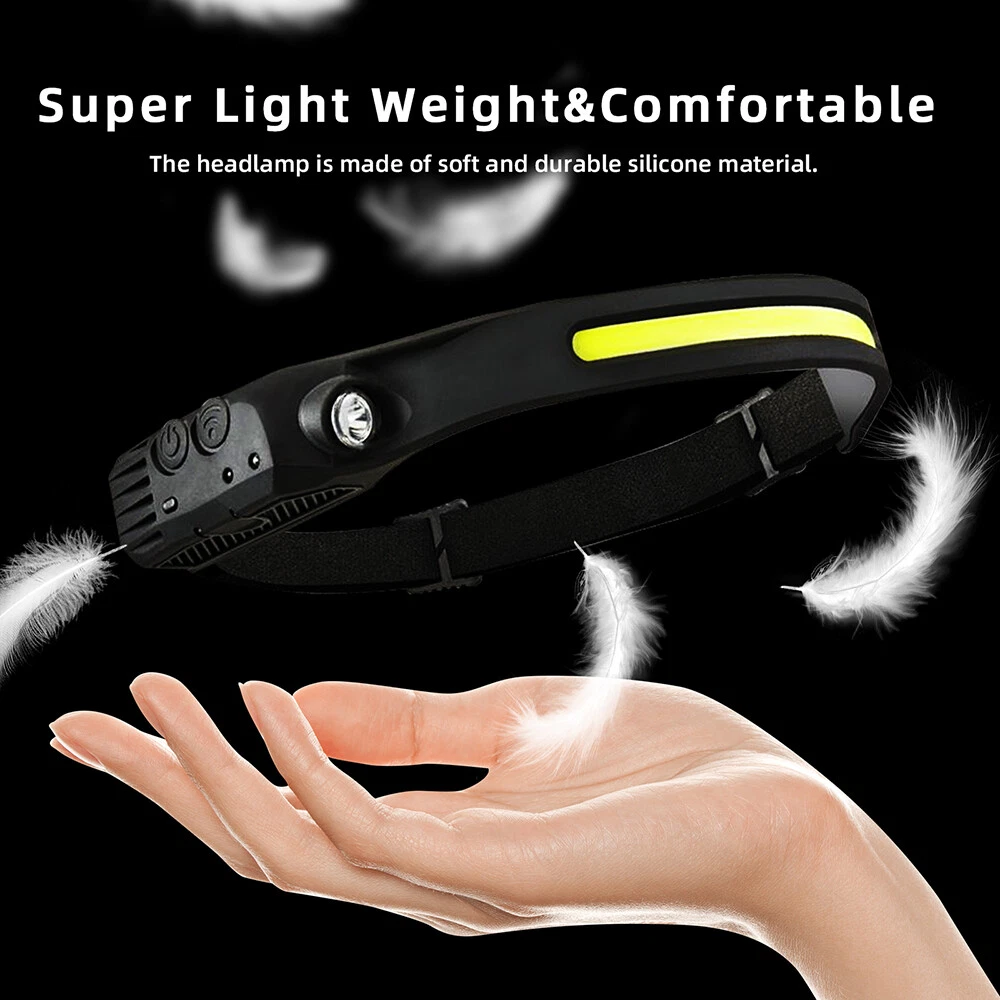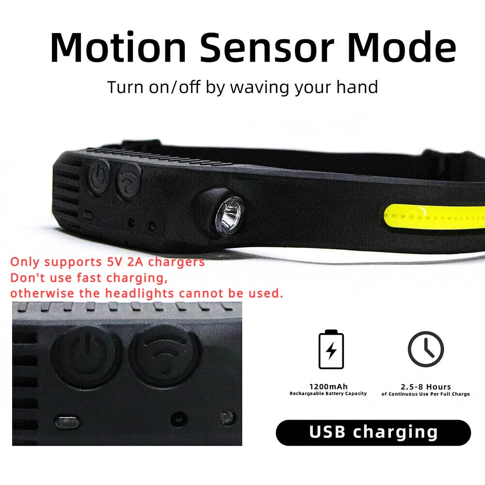 Not e : Only supports 5V 2A chargers. Do not use fast charging, as it may damage the battery of the headlights, leading to inability to charge or use. Description : Hands Free: Thanks to the built-in motion sensor, our rechargeable headlight can be easily turned on/off by waving your hand by running the side of the headlight. First turn on the main switch, adjust to the light you need, then turn on the sensor switch for a few seconds to activate the motion detection mode. When your hands are oily or dirty or you are wearing gloves, the sensor mode will perfectly solve the trouble of needing to touch the button for you. Built-in Battery: The headlamp built-in 1200mAh rechargeable lithium battery, Type-C USB charging cable included. Fully charged the rechargeable LED head torch for 2.5 hours and use up to 6-8 hours(depends on the light mode you use). Comfortable and lightweight: The weight of the headlight is only 100 grams, so you can easily wear it on your head without pressure. Adjustable bands to satisfy people from different head circumference, it will provide the maximum comfort. Different modes of flashlights can meet the light needs of different scenes, which is one of the must -have tools for the family. Multifunctional Usages: Head Torches LED Super bright Rechargeable extremely suitable for jogging , cycling , camping,fishing head torch and other long time night activities. Only supports 5V 2A chargers. Package included: 2x COB headlamps