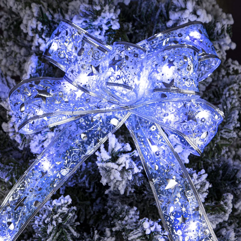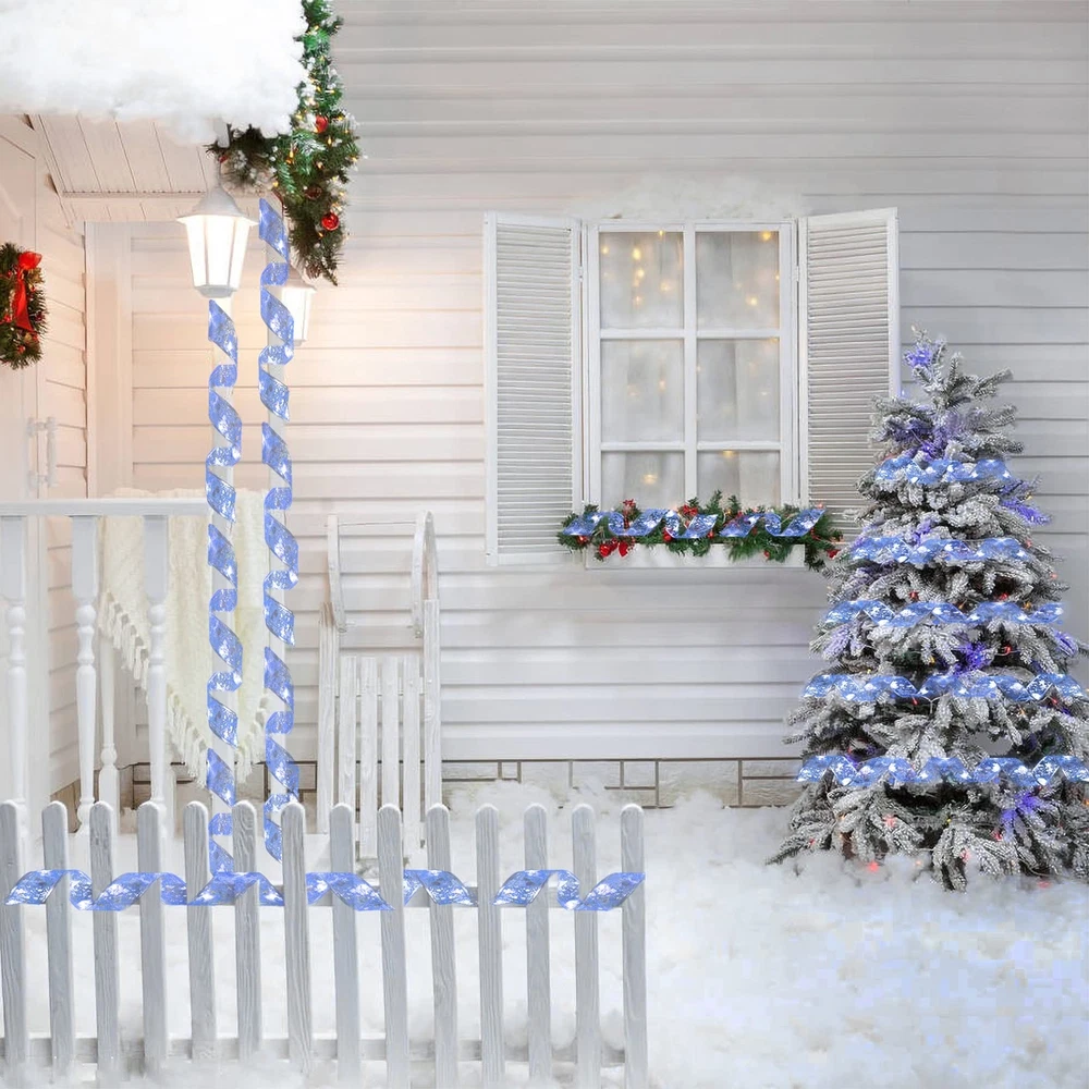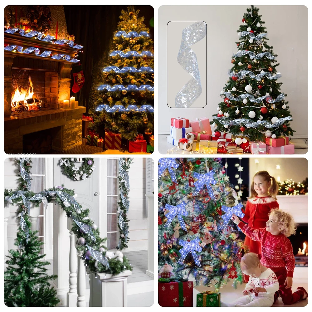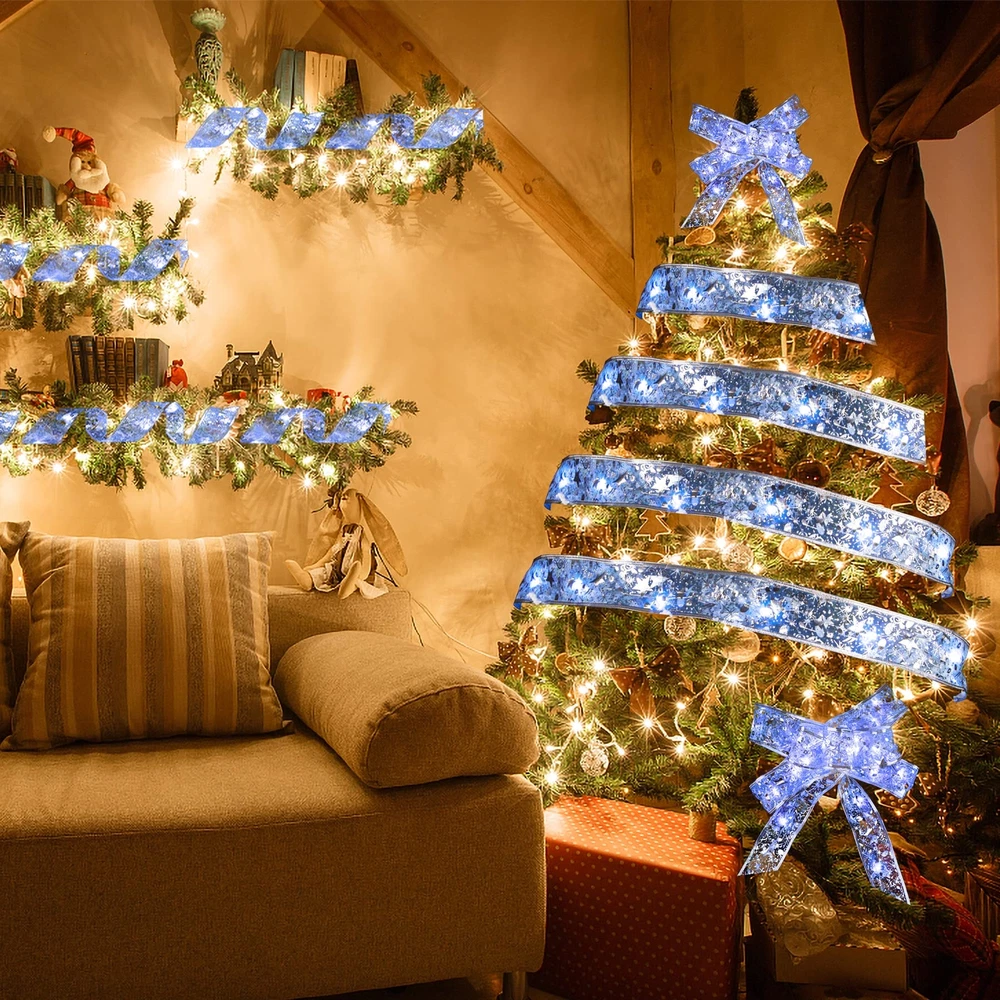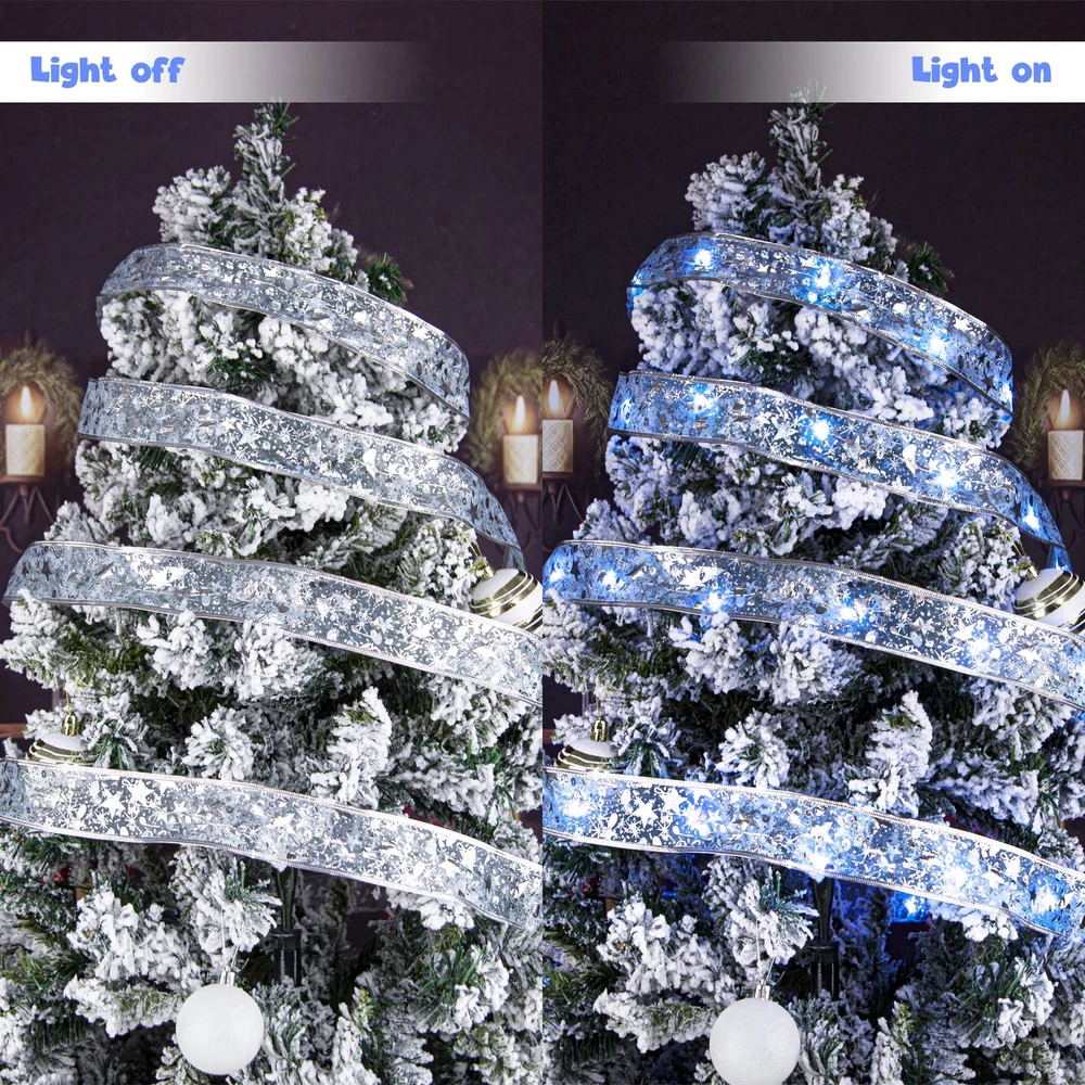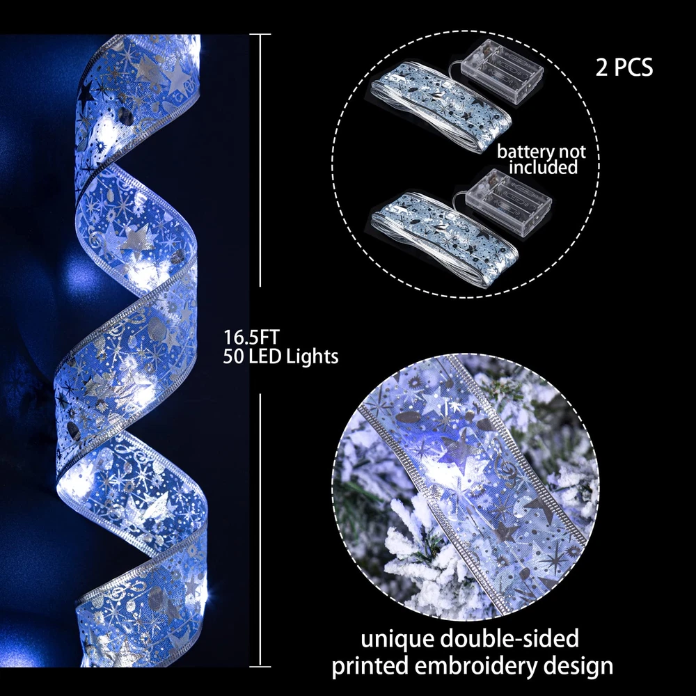 Specification: ♢Total length: 2*16.5ft(5m) ♢ Color:Blue White ♢ Total number of LED lights: 2*50 ♢ Battery: 3 AA batteries (battery not included) ♢Package includes: 2PCS Christmas Ribbon Lights(16.5ft/5m) Add Christmas Atmosphere The high-quality christmas ribbon lights are made of waterproof ribbons, and the excellent weaving technology makes the ribbons not easy to fall off and deform. Decorated with 50 LED lights that light up the lights, warm and charming, it creates a warm and happy atmosphere. Make your Christmas time unforgettable and fun, it is an indispensable choice for decorating your Christmas party. Safe and reliable The light strip is powered by 3 AA batteries (batteries not included), safe low voltage, durable and will not overheat for long-term use. Environmental protection and energy saving, high safety, can be used with confidence. The light strip is made of waterproof material, so you can decorate our ribbon light with confidence both indoors and outdoors, in sunny or rainy days (note: the battery box is not waterproof). Suitable scene These LED fairy lights are suitable for decorating any occasion and are the best choice for Christmas tree, bedroom, living room, farmhouse garden, patio, path, restaurant, hotel, cafe, wedding, christmas party, birthday party and many other occasions. It is also ideal for wrapping Christmas gifts, Christmas wreaths and other holiday decorations, and it is also the best gift for your family and friends. DIY: The light strip is 16.5 feet long, and the built-in copper wire is very thin, which can be bent and folded. You can DIY it into your favorite shape, such as a bow. 【DIY】The light strip is 16.5 feet long, and the built-in copper wire is very thin, which can be bent and folded. You can DIY it into your favorite shape, such as a bow. It can also be used to wrap christmas gifts, christmas wreaths and other holiday decorations. 【Exquisite Decorative Design】Christmas decorative ribbon lights are made of high-quality ribbons, with a unique double-sided printed embroidery design, with a smooth and delicate surface.With copper wire 50 LED lights,turn on the lights to create a warm and romantic atmosphere, which is the perfect decoration for the Christmas tree. 【Premium Material】The light strip is made of waterproof material, so you can use this ribbon light with confidence whether it is sunny or rainy, indoors and outdoors. The high-quality material is not easy to tear and is strong and durable, which can ensure long-term use and long service life. 【Wide range of application】Ribbon lights are the first choice for decorating christmas event scenes.Can be used to decorate Christmas party, farmhouse garden, living room,bedroom, wedding, anniversaries, and can also be used as a gift, a great gift for family and friends. 【Battery Powered】The light strip is powered by 3 AA batteries (battery not included), turn on the switch to turn on the light, safe and low voltage, and will not overheat after long-term use. Eco-friendly and energy-saving, the battery box can be hidden in the Christmas tree.