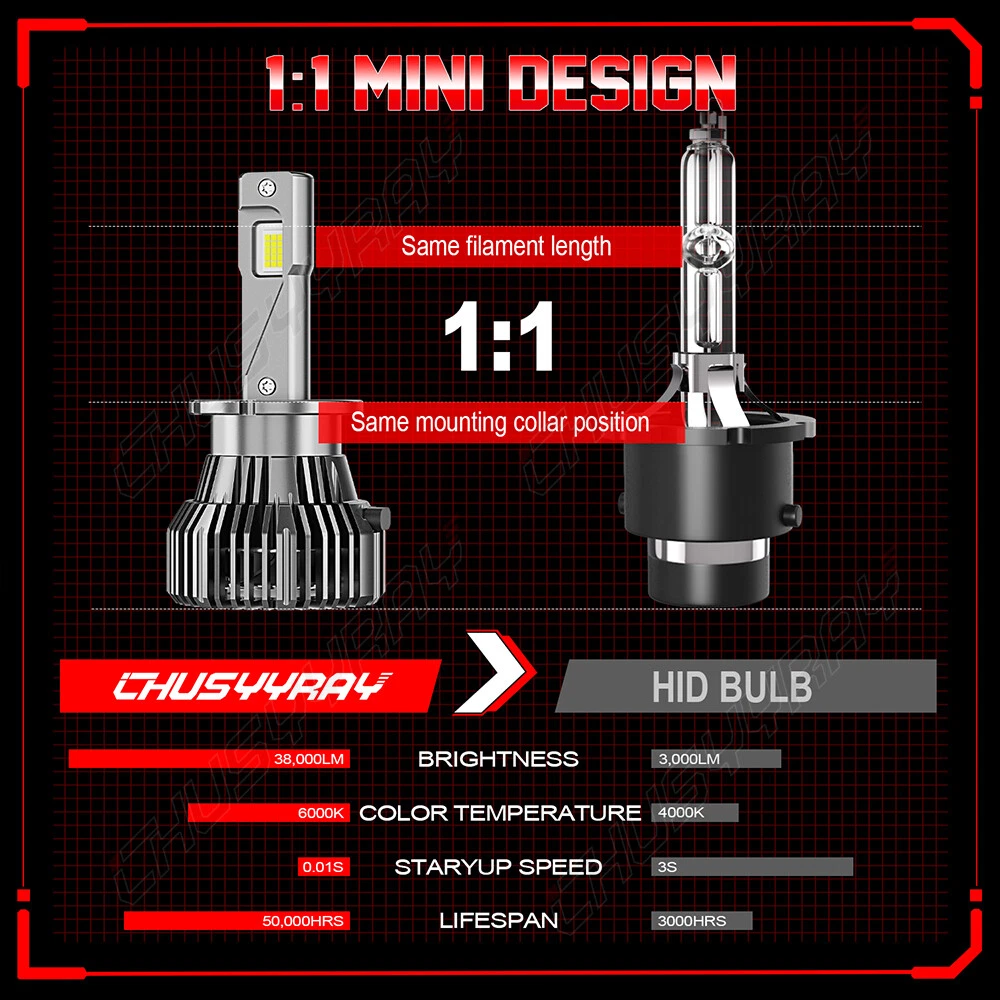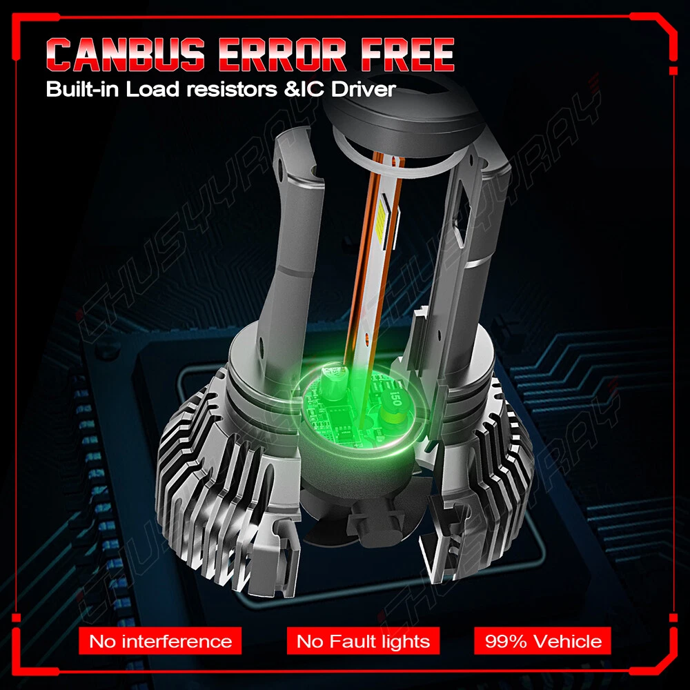 The compatible vehicle list shows only partial cars due to the ebay limits, if your car plug is same with D4S/D4R , the item will fit your car. Features: 1. Designed to enhance your visibility and driving safety at night and bad weather. 2. LED light source, super bright without blind zone. 3. Efficient cooling system ensures maximum headlight performance and appropriate working temperature. 4. Built-in smart IC chip & Cooling fan speed up heat transfer provides intelligent temperature control and allows for instant start. 5. IP67 waterproof and high temperature resistant, withstand extreme weather conditions. 6. Easy installation without any modification or additional wiring, plug and play. Specifications: * Brand: CHUSYYRAY * Condition: 100% Brand New * Light Source: LED Chips * Material: Aviation Aluminum + ABS * Color Temperature: 6000K White * Working Voltage: DC 12V * Output Power: 100W/Bulb,200W/Set * Number of Bulbs: 2 * Waterproof Rate: IP67 * Luminous Flux: 20000lm/ Bulb,40000lm/Set * Working Temperature: -40℃ - +80℃ * Bulb Type: D4S/D4R * Beam Type: High Beam/ Low Beam * Beam Angle: 360 Degrees * Lifespan: Over 50,000 hours * Heat Dissipation Principle: Aluminum Radiator+Cooling Fan * Fitment Type: Direct Replacement * Placement on Vehicle: Front, Left, Right * Application:HID modification for D4S models only Package Included: 2x D4S LED Headlight Bulbs Two-way heat dissipation channel: 1. All-in-one aluminum profile as heat conduction system, 360 degree heat radiating. 2. High speed mute Cooling fan (12000R/Min),high Air flow for faster cooling rate.
