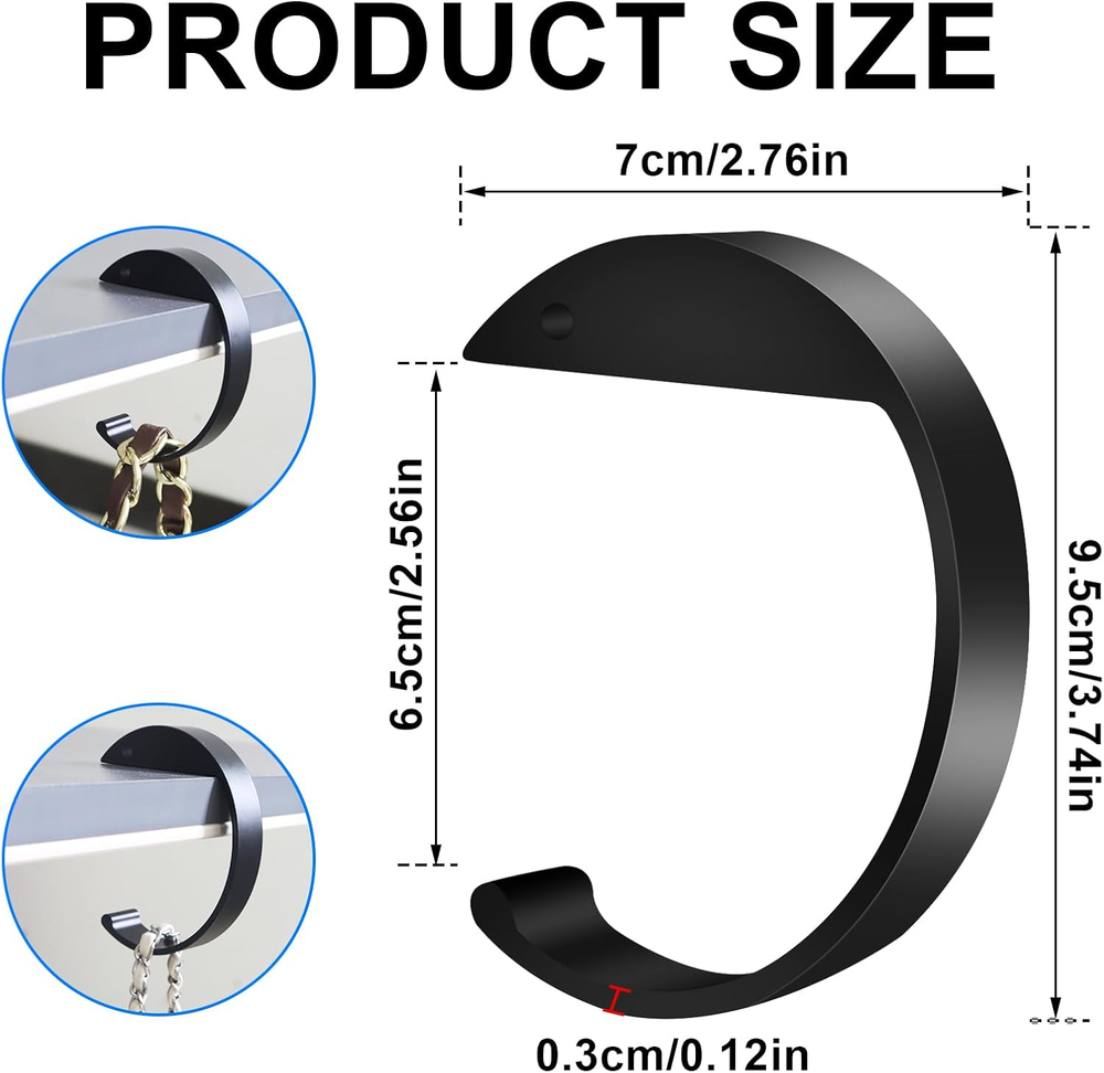 【High Quality Materials】: C Shape Purse Hook from high-strength aluminum alloy, these purse hooks are durable and sturdy, capable of securely holding your bag or purse without bending or breaking. 【Portable Design】: Keep your purse hook for table, or backpack organized with this foldable purse hook. Easily attach it to any table, desk, to save space and protect your items from the floor. 【Versatile & Multifunctional】: Purse hook for desk Not just for purses, these hooks are suitable for holding a variety of small items such as keys, umbrellas, headphones, or even lightweight coats, offering convenience and organization in any workspace. 【Elegant & Stylish】: With a sleek, modern design, this desk purse hook adds an elegant touch to your office or home decor.it’s the perfect addition to your office desk accessories. 【Perfect Gift】: A thoughtful and practical gift, this table hook is perfect for birthdays, holidays, or office events. Your friends, ladies will love this compact, portable solution for keeping their bags organized. Packing list: 2 pcs purse hook for table, 2 adhesive strips.