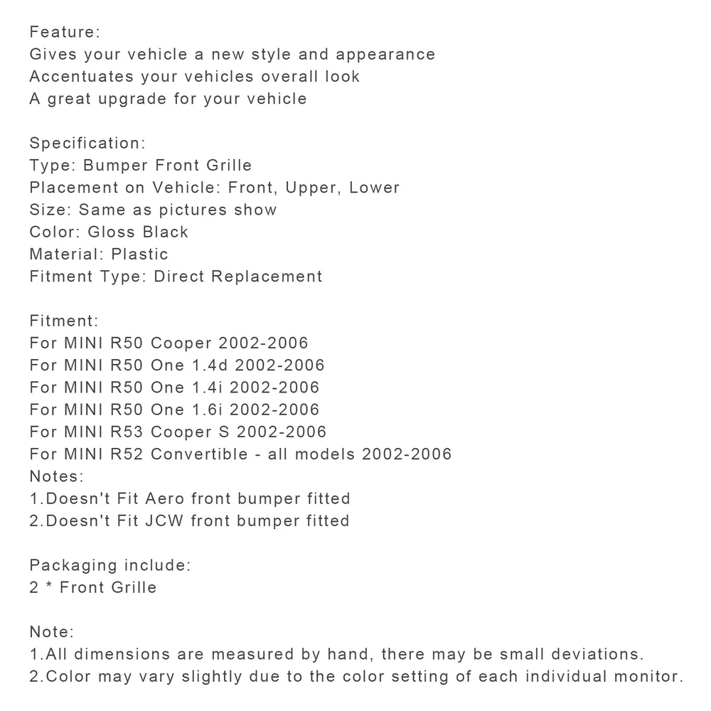 SAFE & SECURE SHOPPING 100% SATISFACTION GUARANTEED FAST SHIPPING Store Categories Store Categories Other eBay Motors Grille You may also like Left Inner Trunk LED Tail Light Lamp For AUDI A6 C7 2012-2015 U4 123.64 USD Free shipping 4pcs Outside Door Weatherstrip Belt 822102L000 For Hyundai i30 2008-11 U4 85.64 USD Free shipping Carburetor Electric Choke 2Barrel For Holley 0-80350 2300 350CFM U1 247.65 USD Free shipping NEW MDS Lifters Timing Chain Kit Camshaft Kit for Dodge Ram 1500 5.7L Hemi 09-19 689.99 USD Free shipping NEW Front Right Indicator Light Lamp Flasher Clear Lens Fit for Mini Cooper 46.64 USD Free shipping Weatherstrip Door Belt Set 5727A005 5727A006 For MITSUBISHI LANCER 2008-2017 !! 100.65 USD Free shipping 2PCS Honeycomb Mesh Front Grill Grille Fit Mini Cooper R50 R52 R53 2002-2006 !! Product Description Feature: Gives your vehicle a new style and appearance Accentuates your vehicles overall look A great upgrade for your vehicle Specification: Type: Bumper Front Grille Placement on Vehicle: Front, Upper, Lower Size: Same as pictures show Color: Gloss Black Material: Plastic Fitment Type: Direct Replacement Fitment: For MINI R50 Cooper 2002-2006 For MINI R50 One 1.4d 2002-2006 For MINI R50 One 1.4i 2002-2006 For MINI R50 One 1.6i 2002-2006 For MINI R53 Cooper S 2002-2006 For MINI R52 Convertible - all models 2002-2006 Notes: 1.Doesn't Fit Aero front bumper fitted 2.Doesn't Fit JCW front bumper fitted Packaging include: 2 * Front Grille Note: 1.All dimensions are measured by hand, there may be small deviations. 2.Color may vary slightly due to the color setting of each individual monitor. About Us Shipping Terms Contact Us About Us Bruce & Shark is a company Focus on Motorcycle parts more than 11 years. The design inspiration comes from the awe of the vast sea and worship of the fighting sharks, therefore Bruce & Shark takes a shark as brand logo. Since its inception, we have always put the "customer first" and "top quality" as our principle. We specialized in selling Motorcycle parts and providing customers with various types of high-quality products. Our brand Bruce & Shark has enjoyed good reputation in America, Europe, Japan, Canada and Africa, covering more than 30 countries. Our vision is to deliver high-quality Motorcycle parts products and sincere services to the world. Our main products are motorcycle mounted, fuel pump, stator, windshield, Seat Cover, motorcycle fairing. Welcome to our shop to choose products that are worth more for your Motorcycle! Please Add me to your list of favorite sellers and visit often. Thank you for your business. Shipping Shipping Terms International Buyers – Please Note: 1. Import duties, taxes and charges are not included in the item price or shipping charges. These charges are the buyer’s responsibility. 2. Please check with your country’s customs office to determine what these additional costs will be prior to bidding/buying. 3.Buyers' Information: We strive our best to provide you the most reliable, affordable way of shipping service. But sometimes international delivery is highly depended on the courier company and local customs/duties. If you do not receive your item on time, please sent us ebay message immediately for further assistance. Thank you for your understanding. Terms We stand behind everything that we sell and will do everything possible to assure you are satisfied. When you receive your purchase if you are not 100% satisfied, please sent me ebay message and we will do our best to make you happy. If you still want to return your purchase, simply ship the item(s) back to us and we will refund your original purchase price and the original shipping charge. Buyers are responsible for the postal cost of returning the items. We must be notified of the intent to return your item within 30 days of receiving the item. Items returned must be in the same condition that they were received. How to return 1,Please ask us for return address . 2,Shipping back the package . The RMA#(Return Merchant Authorization Number = Your ebay ID) must be clearly written on the return package ,Otherwise the package will be refused. 3,Sent us the return tracking number. 4,All returns will be inspected prior to a credit being issued. Contact Us Sent ebay message in English If you have any questions, our Customer Service staffs welcome you to sent me ebay message. We strive to answer all questions and resolve any problems as quickly as possible. Business Hours: HongKong Time GMT+8:00 Monday-Saturday 9:00-17:00 Copyright © 2022 Tongtool