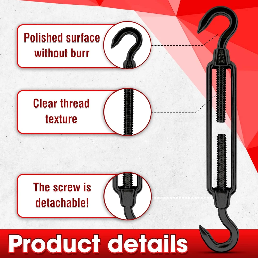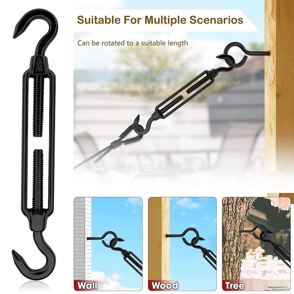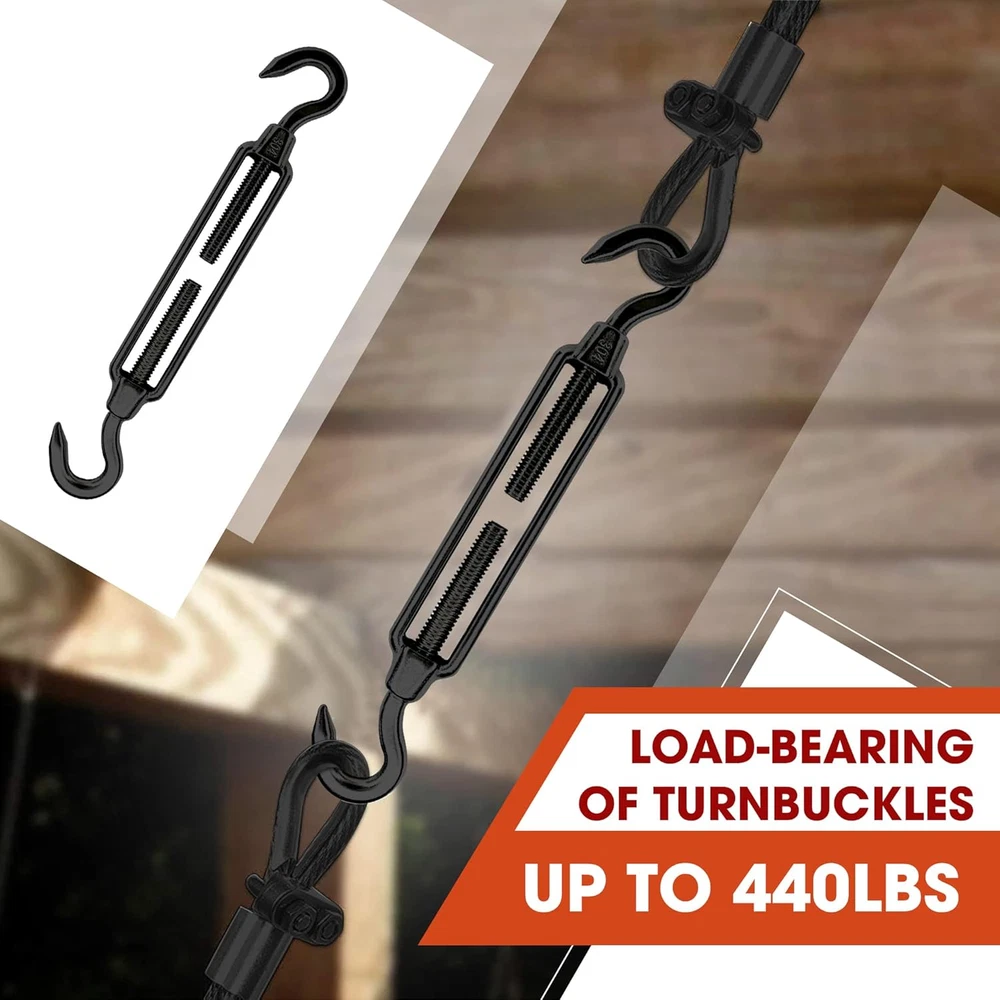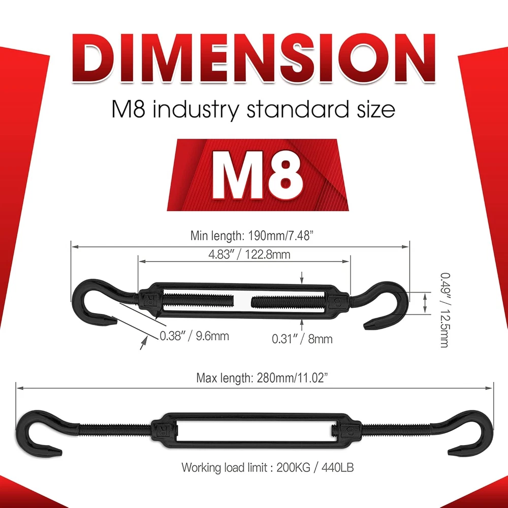 🔨DURABLE ANTI_RUST MATERIAL: M8 turnbuckle hook is made of high quality 304 stainless steel with a black coating for tightening up cable & wire rope. These turnbuckles have good load capacity with excellent rust resistance and can use in any weather and anywhere for a long time. Our turnbuckle wire tensioner kit is more durable and stronger, easy to install, and provides enough support to connecting cable wire. 🔨ADJUSTABLE SCREWS: Our turnbuckle length can be freely adjusted between 7.48In and 11.4In. Both sides of turnbuckle hooks have adjustable screw buckles that can be adjusted according to the requirements of different items. It is easy to use with a simple twist to increase or reduce tension and allows for tensioning the cable for a tight and tidy look. 🔨GREAT LOAD CAPACITY: The M8 turnbuckle hook and hook is mainly used to tighten the rope and adjust the elasticity. Generally, it is used to connect items such as wire rope, antenna, chains, and clotheslines because it has a strong load-bearing capacity, up to 440Ib. This load capacity allows these turnbuckle hooks to be widely used in various heavy industry fields. 🔨MULTI_FUNCTION KIT: Our M8 stainless steel turnbuckle cable tensioner gets a wide-range heavy-duty hanging task done, including garden wire for climbing plants, outdoor cable railing kit, shade sail fixings, catenary wire, and the fence wire. Moreover, adjustable turnbuckle strainers are a perfect DIY hanging accessory, often used in forestry, mining, bundling machines, and tightening wires for electricity. Particularly suitable for limited space. 🔨WHAT YOU GET: Come with a set of 2 pieces heavy-duty adjustable turnbuckles for cables wire. Our stainless steel turnbuckle is always produced with the most exceptional quality and checked carefully before packaging in the box. If there are ever any issues when receiving, please contact us, and we will refund you within 30days. Product Description Specifications Material: Black 304 Stainless Steel Bearing capacity: 440lbs Features: Solid and durable, high hardness, rust-proof, corrosion resistant, and waterproof for a long time use. Wide usage: Climbing plants, shade sail fixings, fence wire, cable railing kit, heavy-duty hanging task done, hanging accessories. Package includes: 2x Turnbuckle hook & hook M8 Premium Quality Material Our turnbuckle hook & hook are made from 304 stainless steel,a high-grade steel. It has superior waterproof, good wear resistant, anti-corrosion, and high hardness. Especially, each piece is electrophoretic painted which makes it more durable, extremely good for heavy-duty applications. Easy to Use Adjust screw buckles according to your requirements of different items. Use with a simple twist to increase or reduce tension. Easy to assemble and install by hand Hold up to 440lbs Safe Workload Our turnbuckle hook and hook is mainly used to tighten the rop and adjust the elasticity because it has a strong load-bearing capacity up to 440lbs. Great for attaching and heavy-duty applications, help you solve many problems.