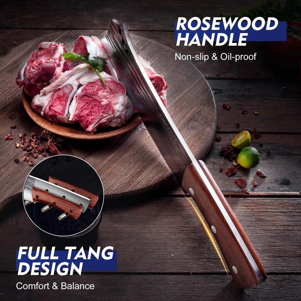 【Multifunctional Cleaver Knife Set】This butcher knife set is Include: 7.5" cleaver Knfe, 8.5“ Heavy duty Butcher Bone Knife. This kitchen knife set is the perfect tool for getting through tough meat and bone, making it a great addition to any kitchen. This chopping knife is perfect for cutting, slicing, and mincing. and this bone cutting knife cut through bone nearly as easily as it cut through the skin and muscle, great for professional and home kitchens. 【Hand Forged Meat Cleaver】These knives are hand forged by craftsmen with more than 50 years of experience. so that the chopping knife can be keeped the blade sharp for a long time, helping you cut food effortlessly. and this bone cutter is just 1.36 pounds and 5 mm thick. It provides enough weight to assist with chopping through bones, without being too heavy to use. Even ladies of have tiny hands and not a lot of strength can handle. 【Perfect Grip and Balance 】The ergonomic shape of the handle makes it comfortable and easy to use and helps reduce hand fatigue even when chopping the toughest of bones! The Rosewood handle is durable, comfortable,non-slip, and easy to clean.The Full tang design with three rivets offers s better durability and a seamless transition from blade to handle. and makes it super easy to maintain. 【Versatile & Easy to Maintain】Due to the forged knife has higher carbon content, please pay attention to clean the meat knife, and acidic or alkaline substances cannot stay on the blade for a long period. Such Butcher knife shall be wiped dry after cleaning. Some cooking oil may be applied on it if it is not used for a long time. And it shall be placed in a dry place for storage. 【Perfect Gift & Promise】Our kitchen knife is easy to maintain as it is stain and rust resistant. Made of high-grade black gift box, it is very suitable as a gift for parents, lovers and friends on various festivals such as Mother's Day, Father's Day, Thanksgiving, Wedding Anniversary, Birthday, Christmas, etc. Chef Knife with a 12-month guaranteed service. If you have any problems, please feel free to contact.