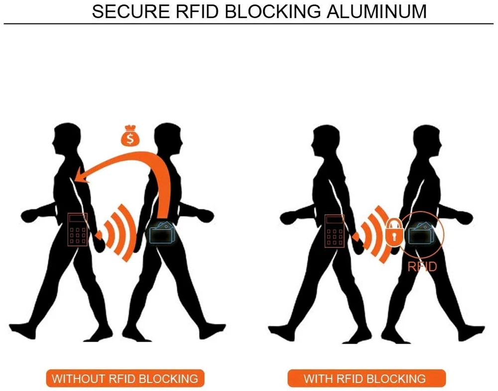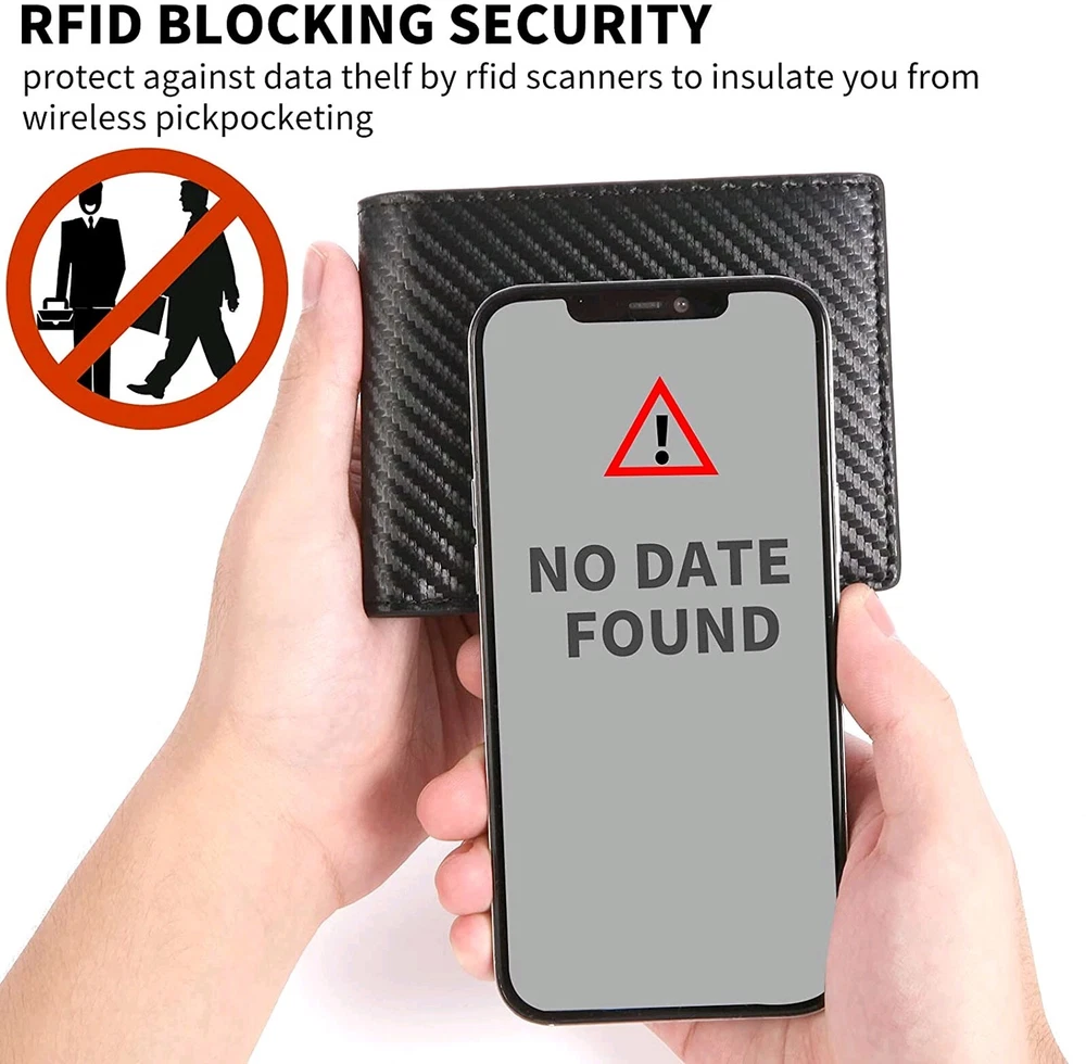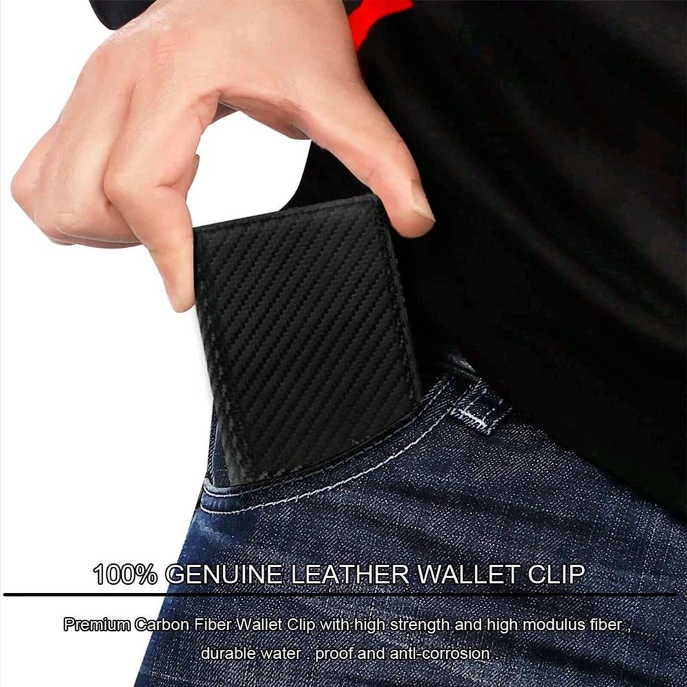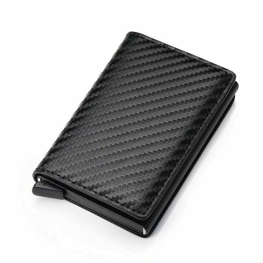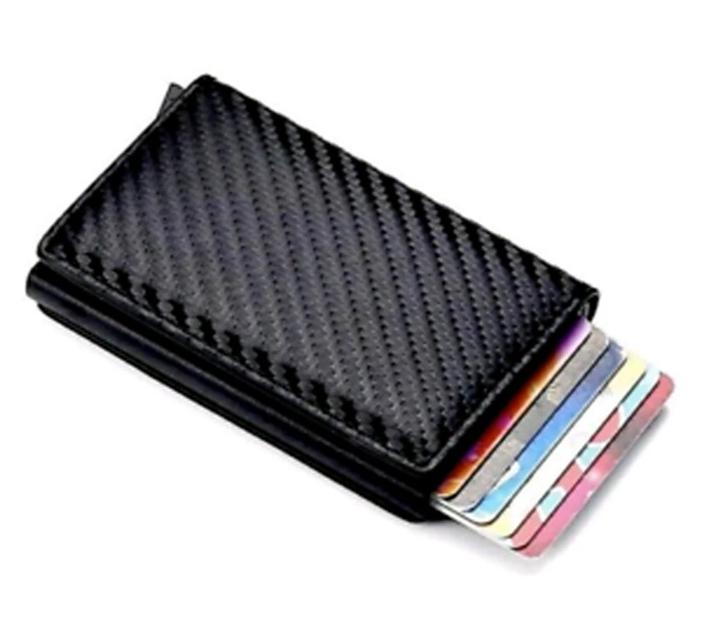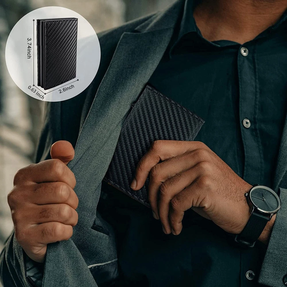 Specification: Material: PU Leather + Aluminum Color:as shown as the pictre Size: approx. 6.5 X 9.5 X 1.8 cm/2.6*3.74*0.7 inch Card Holder Composition: Aluminum Alloy Card Box (Can Hold 6-8 Credit Cards, Bank Cards), Cash Clip, Two Leather Card Slots Description: 1. High Quality Material: 100% Leather Surface Softer more Breathable and Glossier,and Perfect Size Aluminum Case Sturdy and , No breaking, No bending. 2. Humanized and easy-to-use design, Y shape month is convenient for you to put your credit cards, ID card into it, C shape month is for you to pull out the cards easily 3. Perfect men's wallet, slim credit card holder, small and convenient to use, easy to keep it in your back pocket. 4. Lightweight and slim body makes it is suitable to take out with you, you will never feel embarrassed any more for the bulge on the back pockets of your pants. 5. RFID blocking protection design, prevent your private credit card information from stealing by data thief, keep your private property in safety. 6. All cards slide out gradually with the automatic pop-up switch, stops the cards from damaging and falling out. Package Included: 2Pc Carbon Fiber Style Leather Wallet