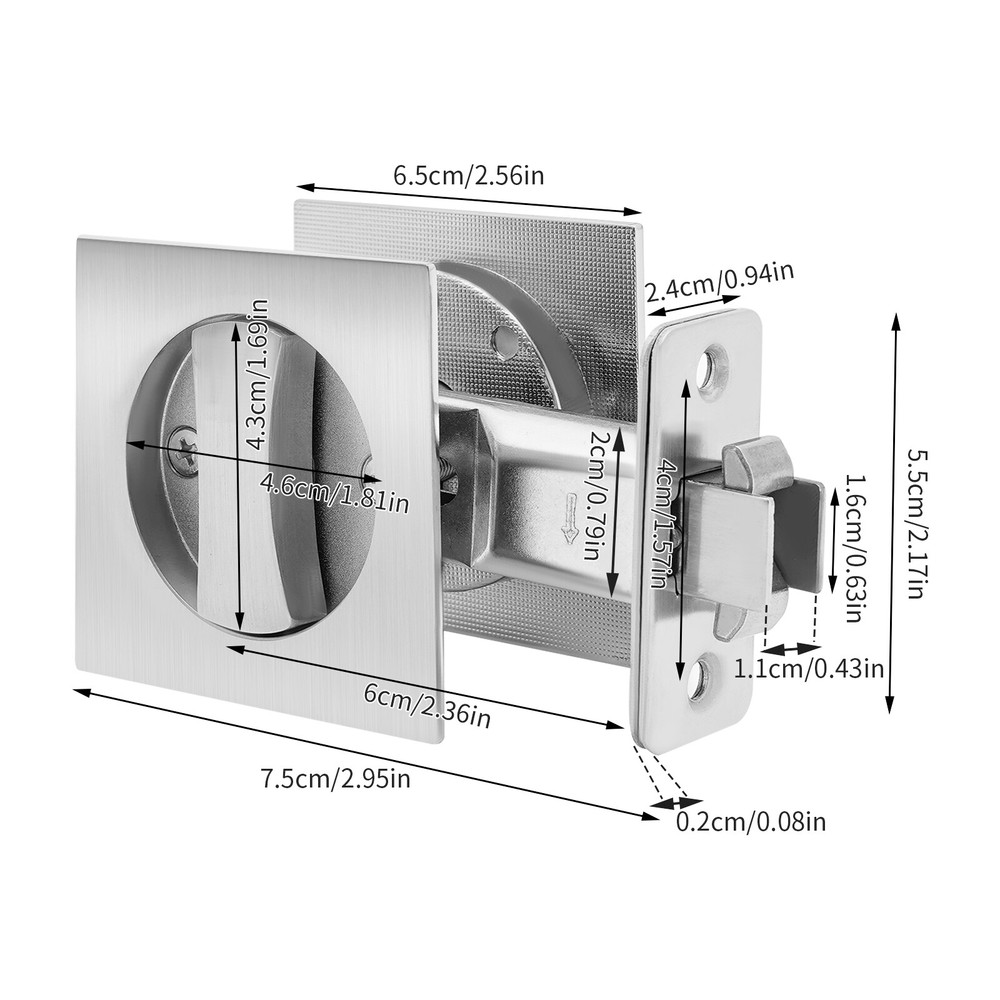 Specifications Color: Silver Material: Zinc Alloy, Copper, Stainless Steel Process: Electroplated, Wire Drawing Assembly Required: Yes Mounting Type: Door Mount Suitable Door Thickness: 30-50mm/1.18-1.97in Square Lock Panel Size: 65*65mm/2.56*2.56in Lock Panel Thickness: 2mm/0.08in Knob Handle Length: 43mm/1.69in Round Lock Diameter: 46mm/1.81in Center Distance: 60mm/2.36in Front Installation Hole Diameter: 53mm/2.08in Side Installation Hole Diameter: 25mm/0.98in Side Groove Size: 57*26mm/2.24*1.02in Packaging Size: 20*18*9cm/7.87*7.09*3.54in Gross Weight: 1.2kg/2.65lbs Package Included 2*Square Locks 1*English Installation Manual Other Needed Accessories 2PCS Pocket Door Square Lock Square Lock Kit Knobs Door Lock 2.56*2.56" Silver Specifications Color: Silver Material: Zinc Alloy, Copper, Stainless Steel Process: Electroplated, Wire Drawing Assembly Required: Yes Mounting Type: Door Mount Suitable Door Thickness: 30-50mm/1.18-1.97in Square Lock Panel Size: 65*65mm/2.56*2.56in Lock Panel Thickness: 2mm/0.08in Knob Handle Length: 43mm/1.69in Round Lock Diameter: 46mm/1.81in Center Distance: 60mm/2.36in Front Installation Hole Diameter: 53mm/2.08in Side Installation Hole Diameter: 25mm/0.98in Side Groove Size: 57*26mm/2.24*1.02in Packaging Size: 20*18*9cm/7.87*7.09*3.54in Gross Weight: 1.2kg/2.65lbs Package Included 2*Square Locks 1*English Installation Manual Other Needed Accessories Description Do you want a door lock that is easy to install, doesn't hurt the door frame, and looks great? This pocket door square lock will be your ideal choice. The unique design allows it to be embedded in the door body, hiding the inner metal structure, giving you a pure and coherent visual enjoyment of the space, and at the same time constructing an invisible but solid protective barrier for your private space. Key Features Build to Last: Made of zinc alloy, copper, and stainless steel and processed by electroplating and wire drawing, the product has high hardness, long service life, and good resistance to corrosion, wear, and deformation. High Security: The delicate structure and craftsmanship of the double hook door lock design greatly improve the sturdiness and anti-theft ability and make the lock tongue effective in preventing violent unlocking. User-friendly Design: You can use a flat object such as a coin to unlock it, which is very convenient and friendly to your family members. Simple Installation: With the English installation manual and needed accessories in the package, you can finish the installation with less effort. 2 Pieces One Set: The 2-lock set gives you the convenience to meet the usage of 2 doors in your room and saves you effort on reordering. Wide Compatibility: The product comes with a lock core insert that can be cut to fit doors with different thicknesses (1.18-1.97 inches). Good Appearance: Its latch part will be hidden inside the door, so that it can be harmoniously integrated with the door, making your space decoration more coherent and natural, giving you visual enjoyment. Customer Service: We aim to provide quality products and services. If you have any problems, please feel free to contact us. We will reply and solve the problem for you as soon as possible. Details Rounded Edges: They provide you with a smooth touch feeling and prevent your skin and finger from scratches during installation or daily use. Smooth Knob: The easy-grip knob ensures a more efficient turn, so you can open and close the door smoothly. Application The product can be installed on wooden doors, metal doors, etc., and is suitable for the bedroom, bathroom, study, kitchen, toilet, or other rooms. Notes Please check the size carefully before ordering. Please read the English manual carefully before installation. Please allow the slight color difference caused by the shooting light and 1-3cm error due to manual measurement, and make sure you do not mind before you order. Payment Delivery details Terms of sales About us Contact us Payment We accept ebay payment 。 Fees such as import duties, taxes are not included in the item price or shipping costs. These charges are the buyer's responsibility. Delivery details Shipping: 2-9 working days to: USA Terms of sales We maintain high standards of excellence and strive for hundred percent customer satisfaction. Feedback is very important to us. We hope that you contact us immediately before you give neutral or negative feedback, so that we can address your concerns. It is impossible to address issues if we do not know about them! About us Your satis faction is our ultimate goal. We work hard to earn your trust and future business. Our certified technicians have tested each item before shipping. The unit comes with 1 year limited warranty on all manufacturing defects. a) If you receive a defective item, you may return it or ask for a discount. Please contact us within 14 days after you receive the package. b) What you returned must be intact and in its original packaging as re? u. Customer is responsible for shipping costs of the returned item. c) We will cover the cost of shipping back t with the shipping rate indicated in the registration page. We will send you a new unit or refund the full payment you paid. Thank you. Contact us Business Hour Business Hour: Monday To Friday: 8:30 AM to 5:00 PM (Beijing China time) Due to time zones, our reply to your questions may not be immediately. But within above working time, we will reply your email within 24 hours. If it's non-workdays, please kindly be patient and wait till Monday. Please contact us with ebay message. Please feel free to contact us if you have any questions. Monday To Friday: 8:30 AM to 5:00 PM (Beijing China time) Due to time zones, our reply to your questions may not be immediately. But within above working time, we will reply your email within 24 hours. If it's non-workdays, please kindly be patient and wait till Monday. Please contact us with ebay message. Please feel free to contact us if you hav
