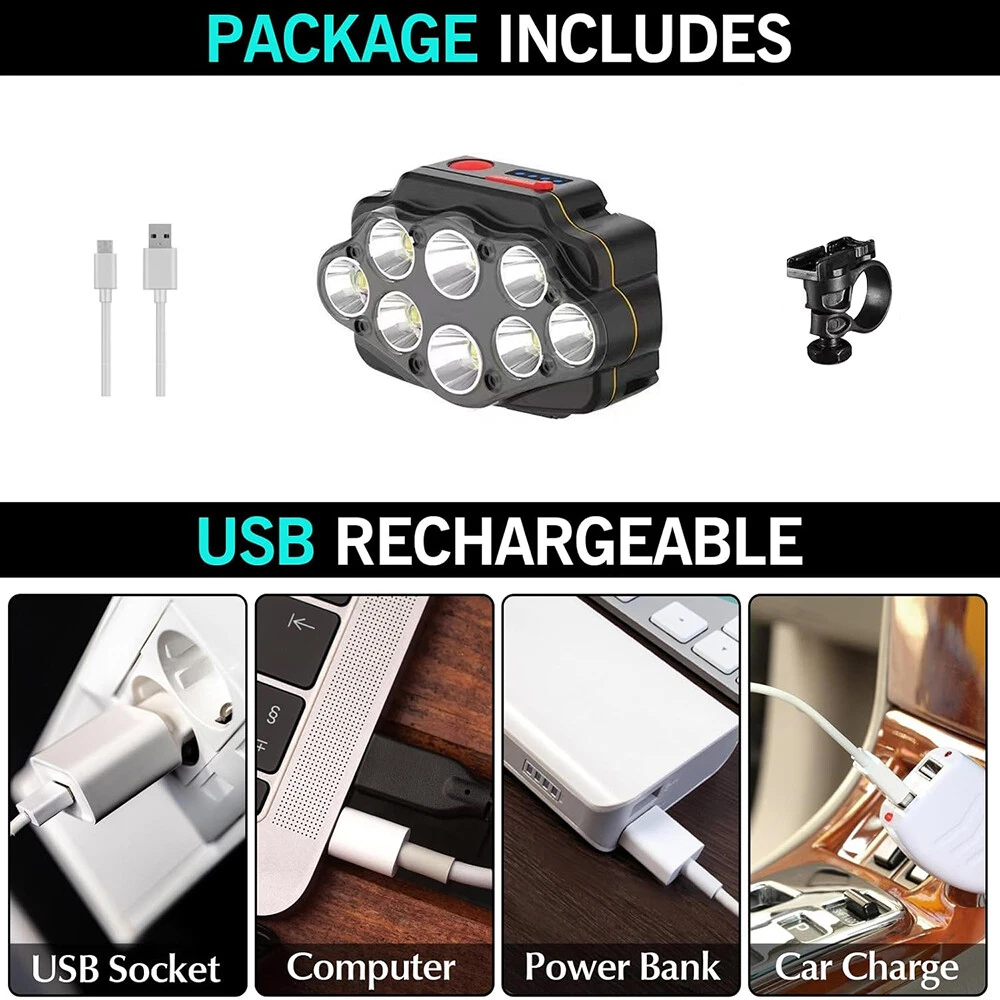 2PCS Super Bright 8 LED Bike Light USB Rechargeable Bicycle Front Headlight USA