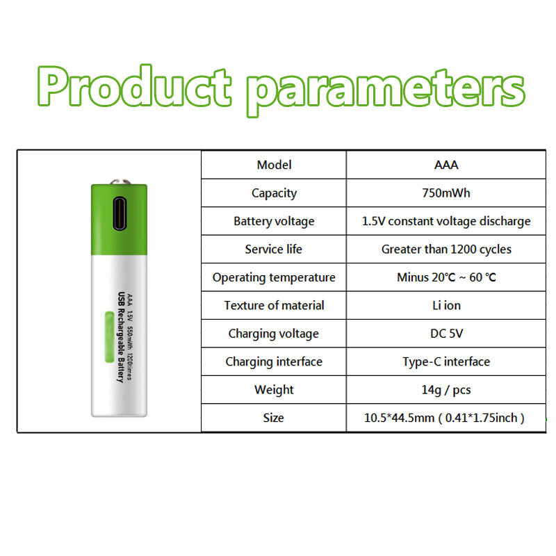2PCS USB-C Rechargeable AAA Lithium Batteries 1.5V with Fast Charging 750mWh
