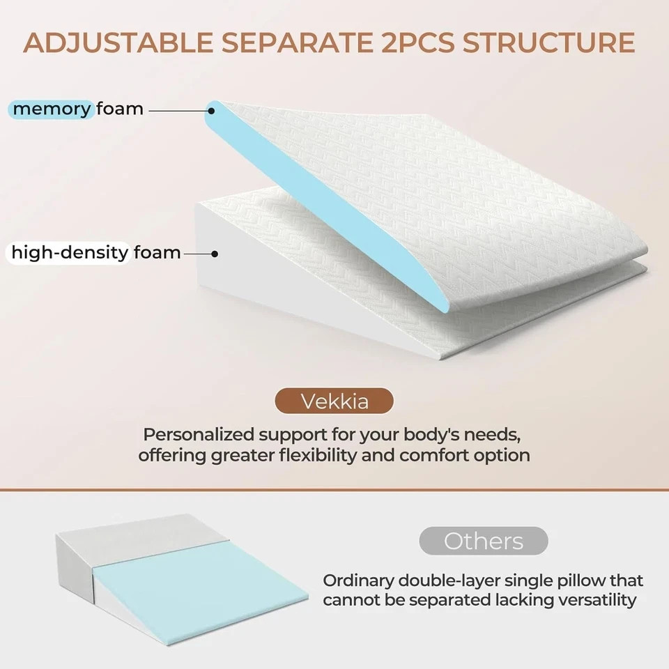 2 Heights & 2 Softness Adjustable: Compared to the double layer design wedge pillows on the market, our wedge pillow for sleeping is composed of 2 separate pillows with different heights and different firmness. You can adjust the height and firmness according to your own habits.Sleep wedges for adults. Comfort and Support Coexist: The bed wedge pillow main body is 5.7 inches of medical-grade high-density foam, which can provide great body support, and we also have a 1.8-inch independent memory foam wedge pillow composed of aviation-grade memory foam, which is an important guarantee of pillow comfort and a good night's sleep. Vintage Premium Patterned Fabric: Pillowcase is soft, breathable and skin-friendly, you can even use it without clothes.2 pillows have super long zippers, easily removable and machine washable. Multi-scene and Multi-function Use: Incline pillows for sleeping,can provide stable and comfortable support for your neck, back, legs and hip, for acid reflux, back pain, leg pain, abdominal pain and other physical discomfort.Suitable for bed, sofa, floor Sincere and Thoughtful Gift: Wedge Pillows for after surgery.Our pillows are especially suitable as gifts for yourself, your family and friends. It can carry your care and thoughts. And it is very useful for those who need to improve their sleep and recover from surgery. Vekkia never compromises on quality - if you have any problems, please don't hesitate to contact us and we will give you 100% satisfaction with our after-sales service!