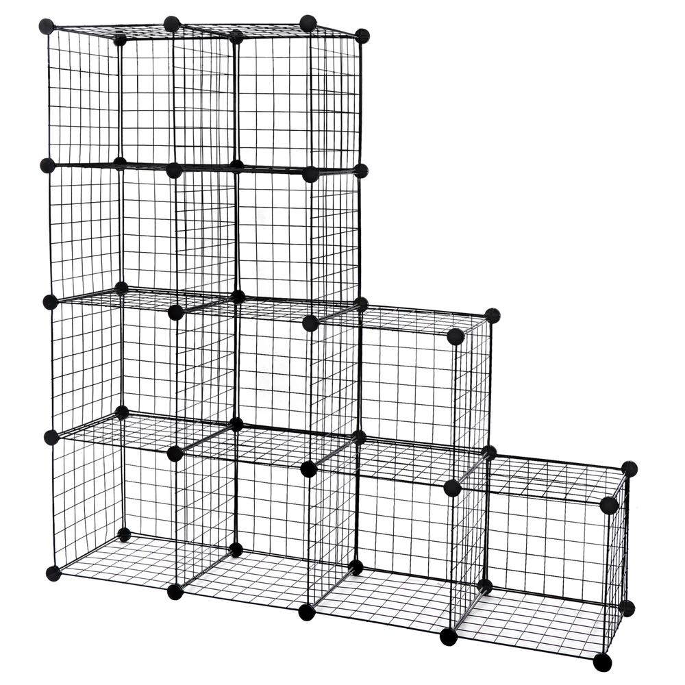 Specifications: Color:Black Item Weight:17.7lbs Material:ABS connectors,Metal Wire Panel and Rust-proof Metal Frame Product Size:93*123.5*31.5cm/36.6"L*48.6"H*12.4"W Size for Each Cube:30*30.5*30cm/11.8"L*12"W*11.8"H Each cube can hold up to 22 lbs weight Features: Excellent Stability: Constructed with PP plastic plates, ABS connectors and iron wire mesh shelves, this interlocking rack is sturdy and durable; Anti-toppling fittings are provided to fix it to the Wall for safety Multifunction Usage: This multifunctional metal wire cube storage has a modern industrial wire grid style for an ideal choice to your living room, bedroom, kid ’s room, corridor or kitchen etc. Perfect as a storage rack for clothes, books, shoes, toys, bags, artcrafts, potted plants and other necessities. Within the number of panels, you can also install a pet fence to give your pet a comfortable home Easy Assembly & Various Shapes: with its simple and light structure, it is easy to assemble; combine the unit into different shapes to fit your needs (refer to instructions for variations) Package Contents: 2 x 43 x Wire Panels 2 x 42 x Connectors 2 x 1x Wooden Malle 2 x 1x Instruction Manual