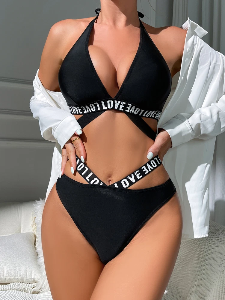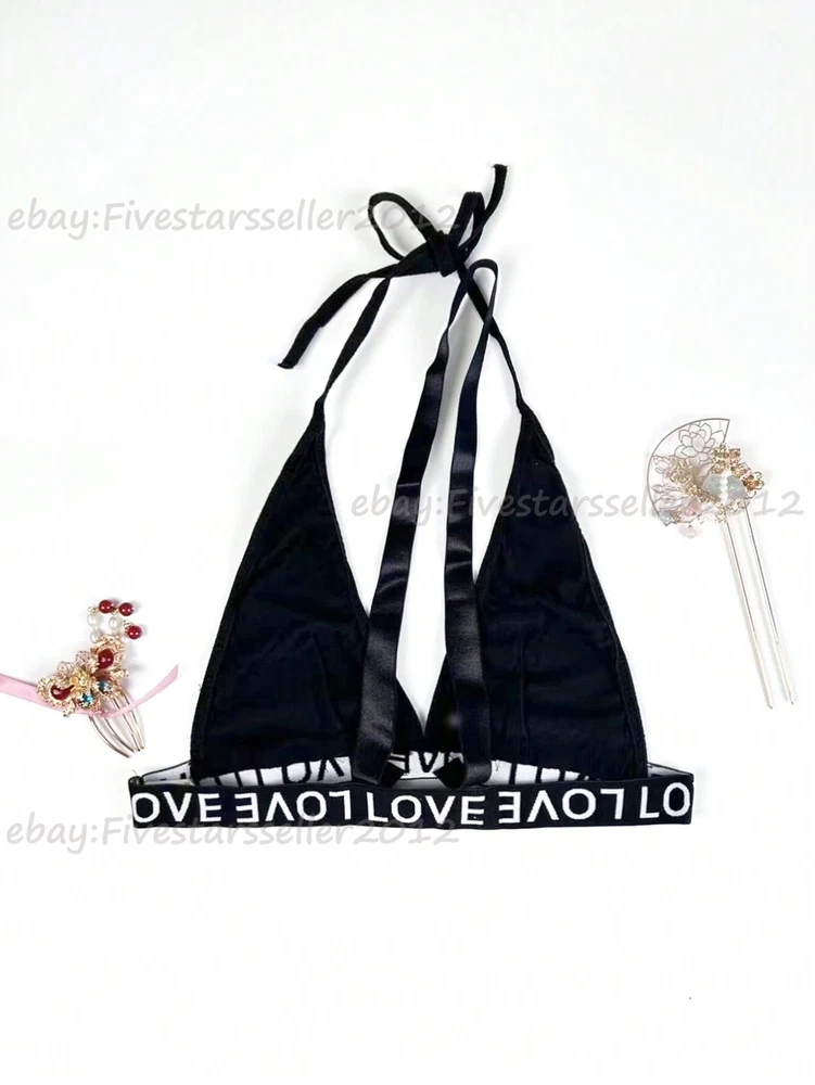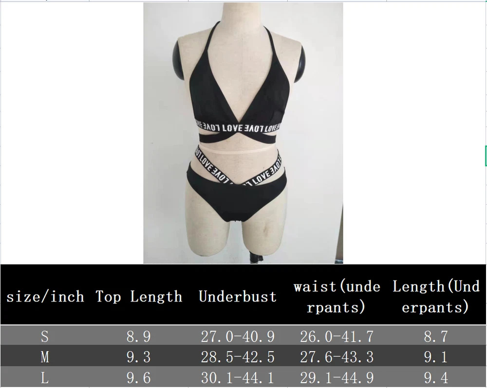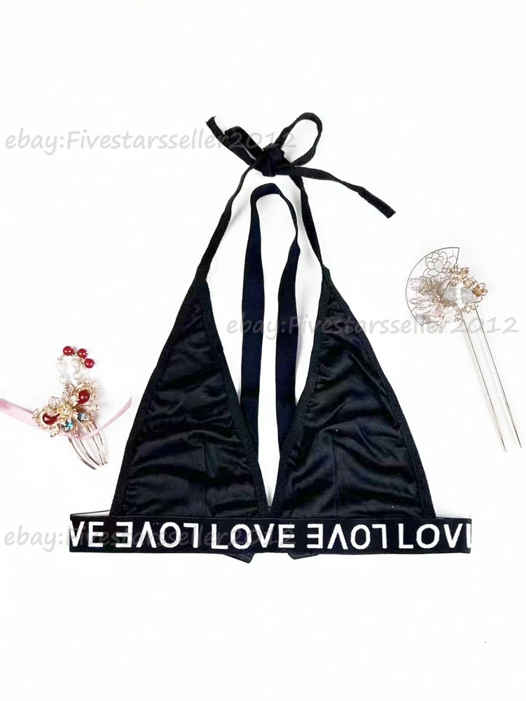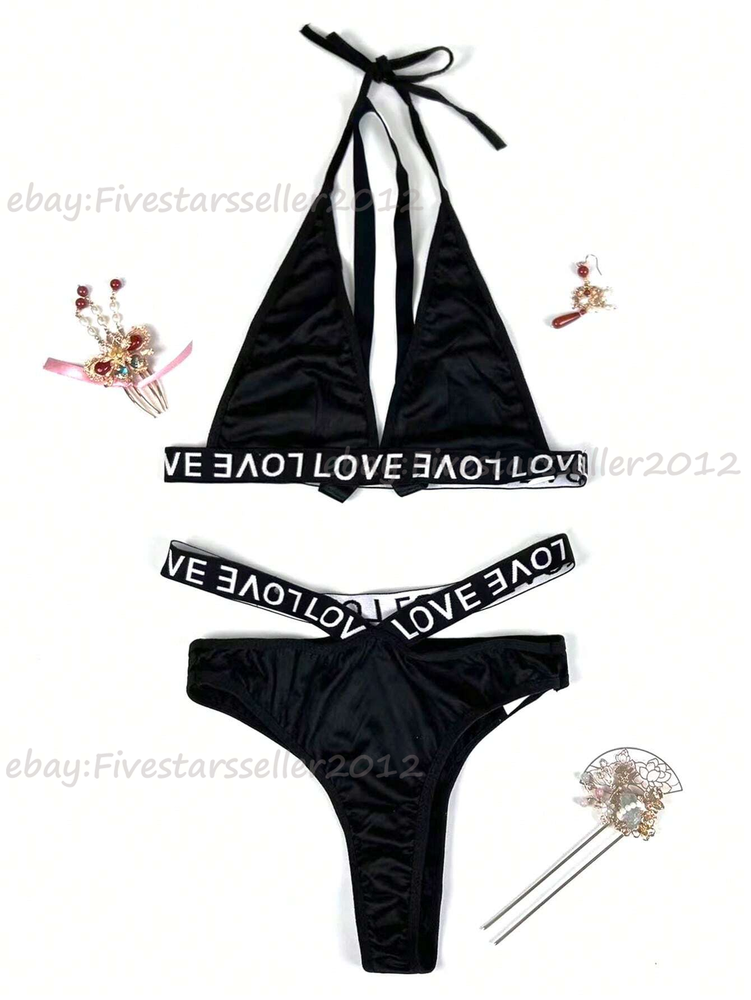 About this item: 2 piece letter tape lingerie set for women Fabric: Fabric is very stretch, and it's soft and comfortable Feature: 2 piece set, letter print, low rise, cheeky panty, womens lingerie, fashionable Occasion: Underwear, nightwear. Suit for wedding night, honeymoon, valentine's day, everyday, etc