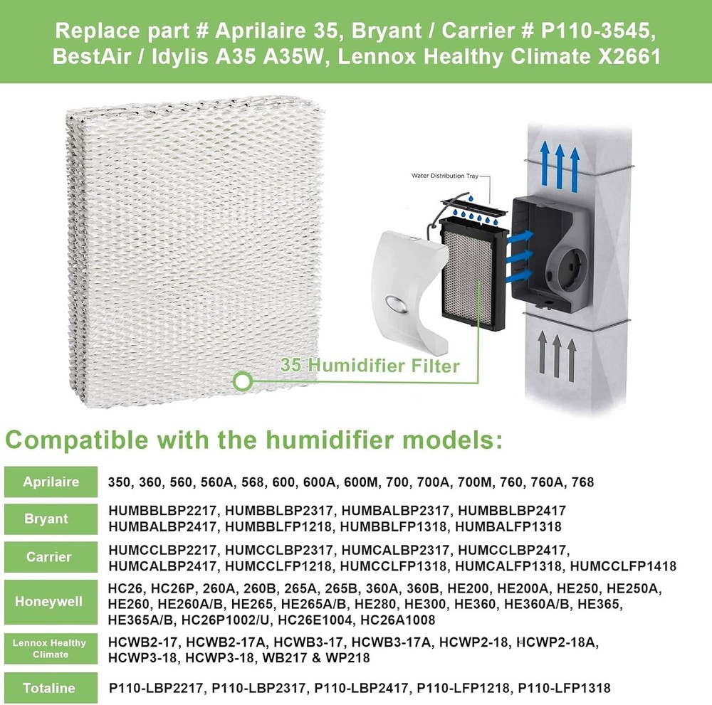 Product description : Package Contains : 2 x model 35 replacement water panel for April.aire whole-house humidifier. Measures 10" x 13" x 1.75". We recommend replacing it every 6 months Moist Air : An air humidity level of 40%-60% is most beneficial and helps prevent dry skin, static electricity and respiratory discomfort, reduces dust buildup, and prevents wood furniture from drying out and cracking Long-Lasting Part : 35 water panel uses multiple layers of thickened filtration paper to create the main body of the 35 water panel, and incorporates a double layer of aluminum mesh to ensure that it does not deform during use Fully Compatible : April.aire water panel 35 filter is compatible with april.aire 300, 350, 360, 560, 560A, 568, 600, 600A, 600M, 700, 700A, 700M, 760, 760A, 768 whole-house humidifier Easy to Replace : Replacing the April.aire 600 humidifier filter is a simple job that can be completed without any professional assistance. Simply remove the old April.aire 35 water panel and slide in the new one, saving your precious time Cost-Effective Option : By choosing , you will get 2 x April.aire 35 water panel, an affordable way to keep your humidifier performing. Our perfect after-sales policy also gives you an excellent shopping experience