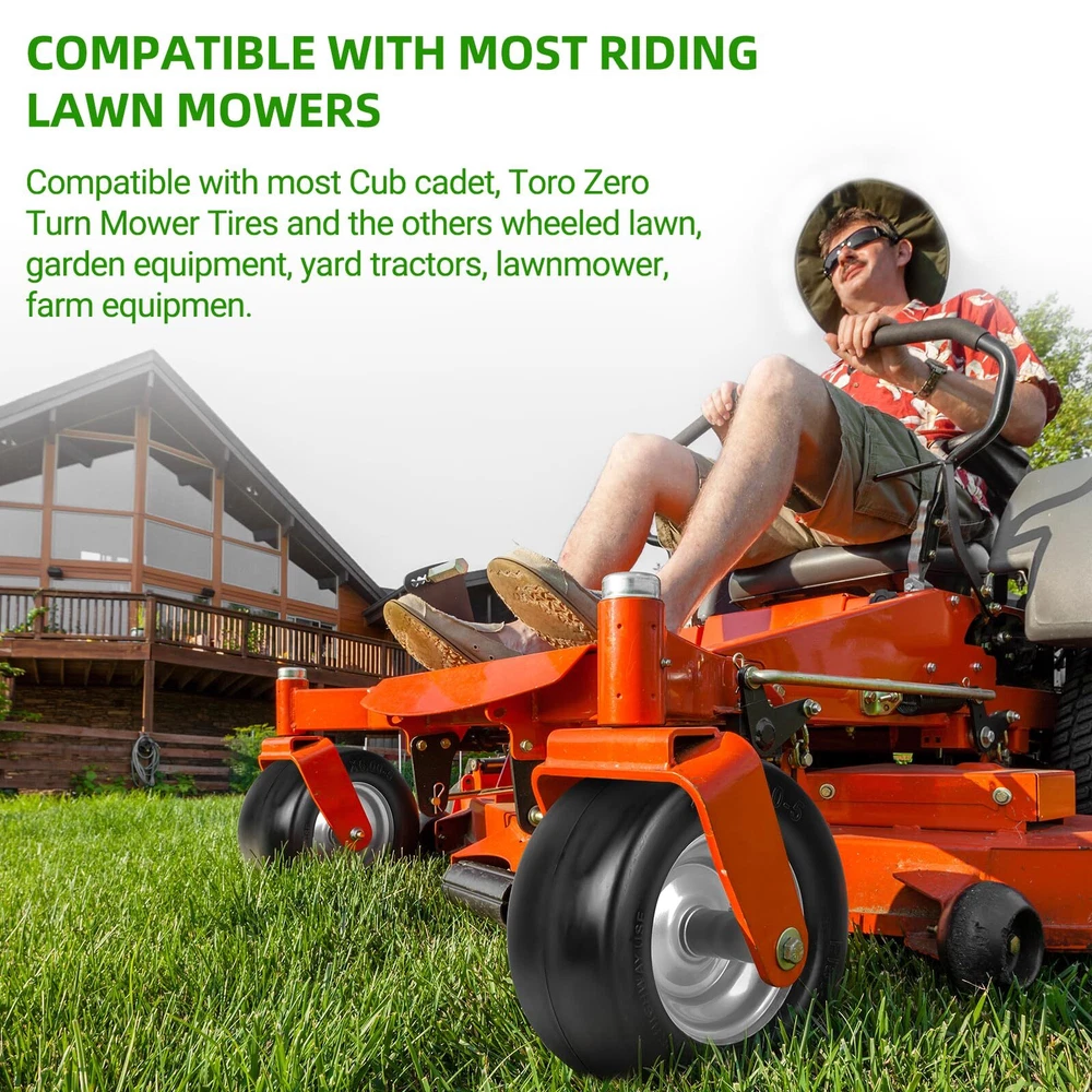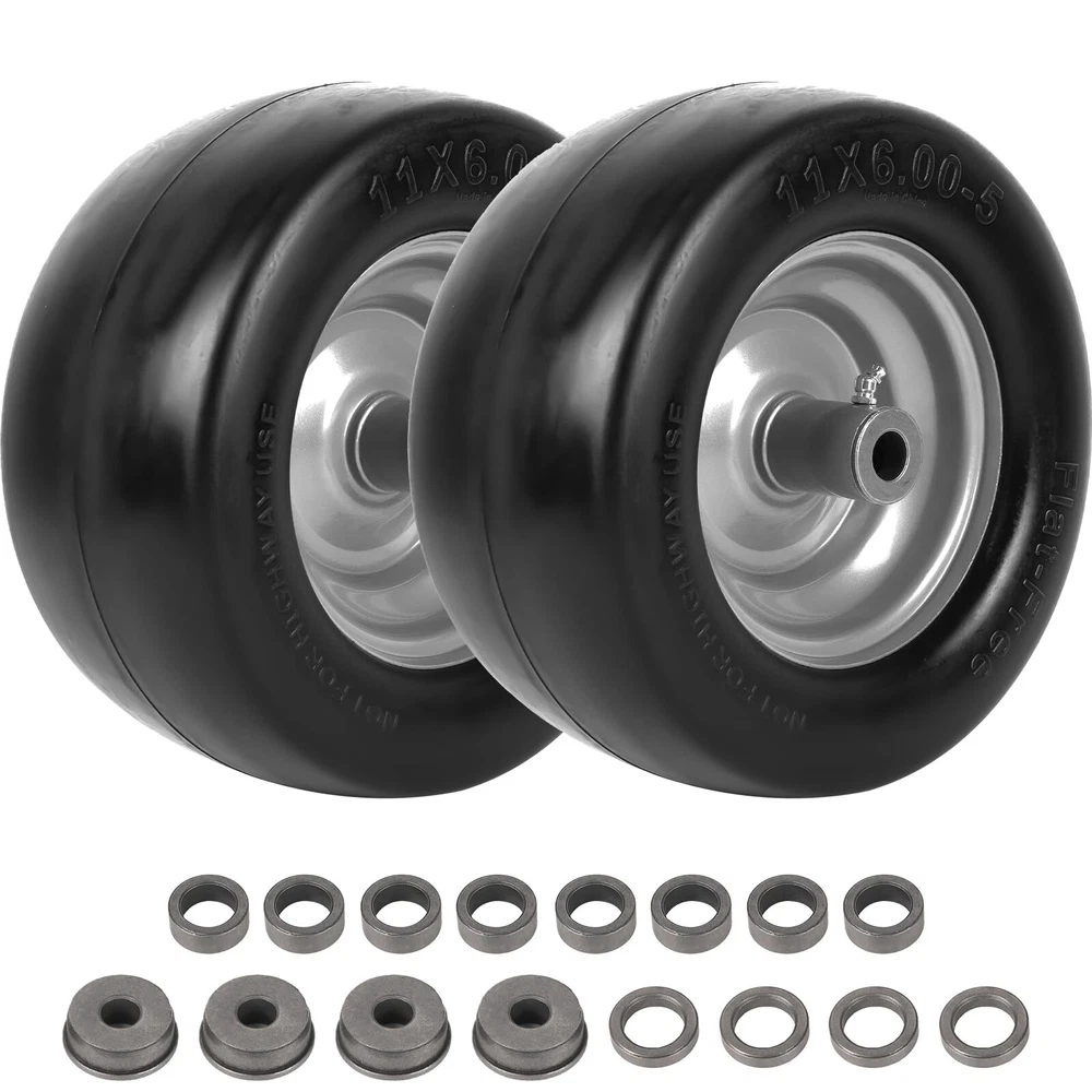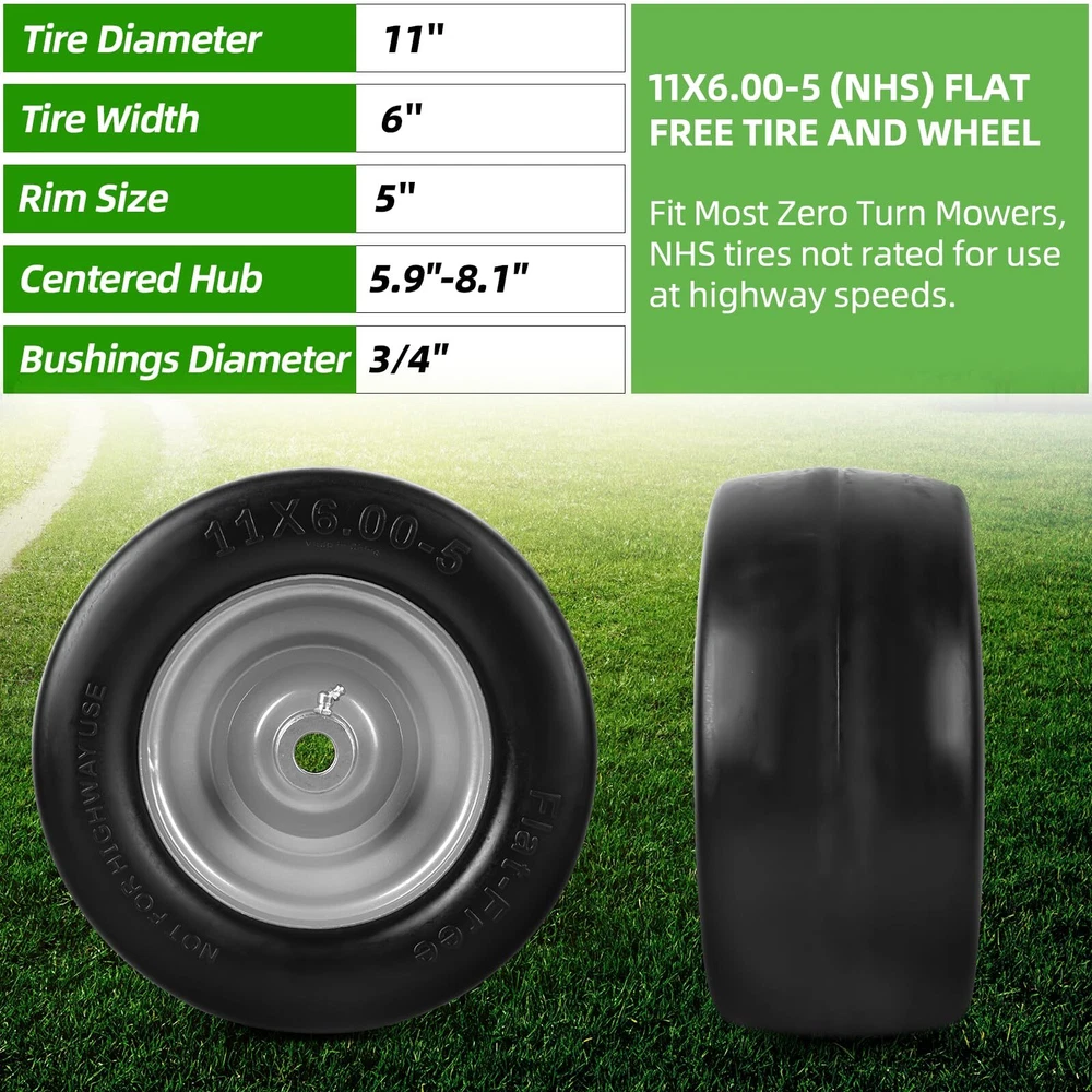 11X6.00-5 (nhs) FLAT FREE TIRE AND WHEEL: Tire and rim assembly with 11 inches tire diameter, 6.00 inches section width, and 5 inches rim size. The wheel bushing is 3/4 inches with a 5.9 inches centered hub. COMPATIBLE WITH MOST RIDING LAWN MOWERS: Compatible with most Cub cadet, Toro Zero Turn Mower Tires and the others wheeled lawn, garden equipment, yard tractors, lawnmower, farm equipmen. These are NHS tires not rated for use at highway speeds. FLAT-FREE SOLID RUBBER TIRES: Solid-core rubber tires with a maximum dynamic load capacity of 500 pounds. Can withstand multiple punctures without affecting riding comfort and safety. Solid rubber tires can better resist cuts, abrasion, and compression. SMOOTH TURF TREADS: Our 11x6.00-5 tire features a smooth tread design to minimize disruption to grass and delicate surfaces. Ideal for zero turn mowers and lawn mowers, this tire provides gentle traction without causing damage. WHAT'S INCLUDED: 2 Packs 11x6.00-5 flat free tires with rim assembly. Extra (per pack) 2PCS x 3/4" Bushings, 2PCS x 0.22" Spacers, 4PCS x 0.45" Spacers.