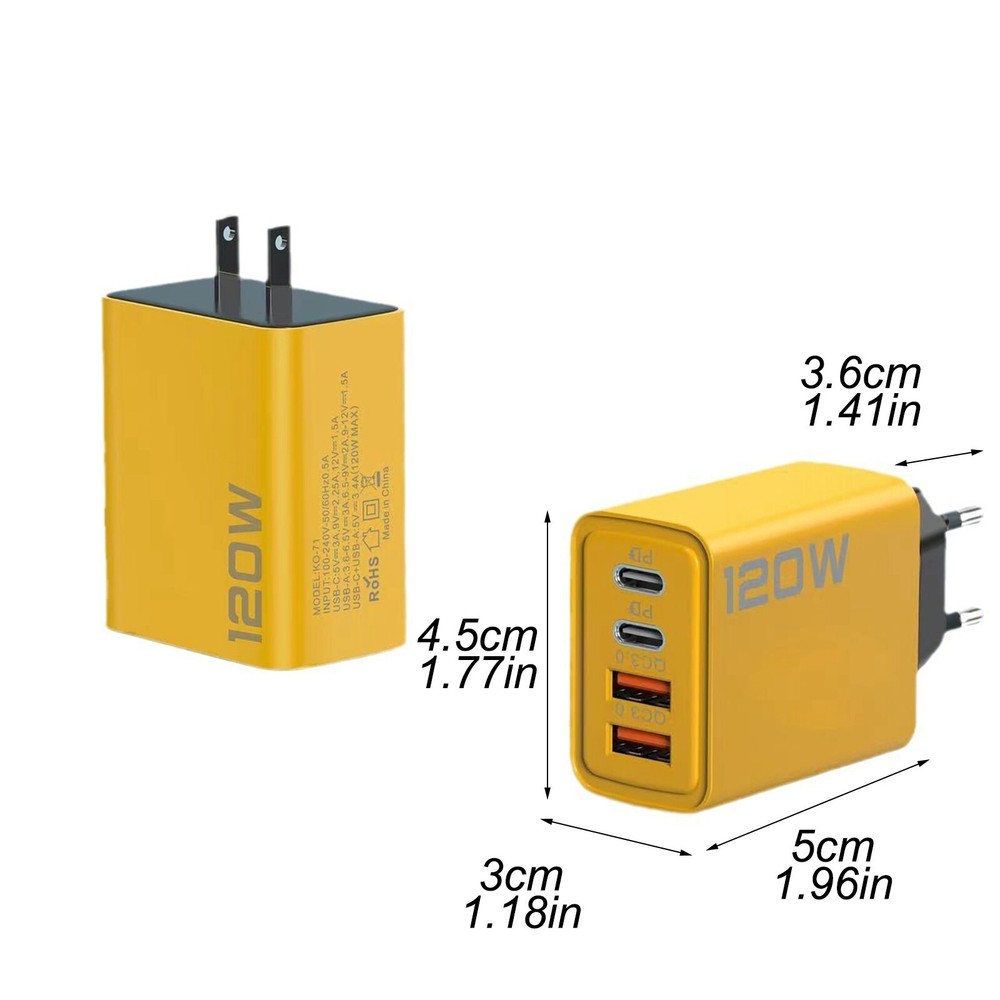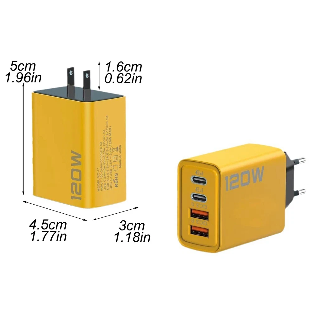 2 PACK 120W 4-Port USB C Wall Charger Block For All Cell Phone iPad Universal About this item: ❊Quick Battery Boost: Boost your device's battery with our USB Multiport Charger, supporting PD charging protocol for a super-fast charge of 0% to 60% in just 30 minutes. Enjoy excellent charging performance with every use. ❊Universal Compatibility: Effortlessly charge your smartphones, laptops, and tablets with our USB Multiport Charger designed to support most devices featuring Type C and USB ports. Ideal for wide applications. ❊Ideal Device Safety: Made with multiple protection systems, our USB Multiport Charger features short circuit protection and automatically stops charging when the battery is full thanks to its smart chip; the durable ABS shell ensures reliability for extended use. ❊Portable Charging: Never fear low-battery discomfort again. Our USB Multiport Charger is lightweight and compact, easily fitting in your bag to energize your devices wherever life takes you. ❊Charging Smartly: This USB multi-port charger features dual Type-C and USB-A ports, allowing you to charge up to four devices simultaneously. With four ports, you can charge your gadgets with ideal convenience. Product Specifications: 【Actual parameters】:5V2A 【Product color】 : Yellow 【Product material】:PC+ABS fire retardant material 【 Bare machine size 】:26*43*65mm 【 Bare weight 】:48.6g 【Input parameters】:AC100-240V 50-60Hz; 0.5 A 【 Fast charge parameter 】:5V2A