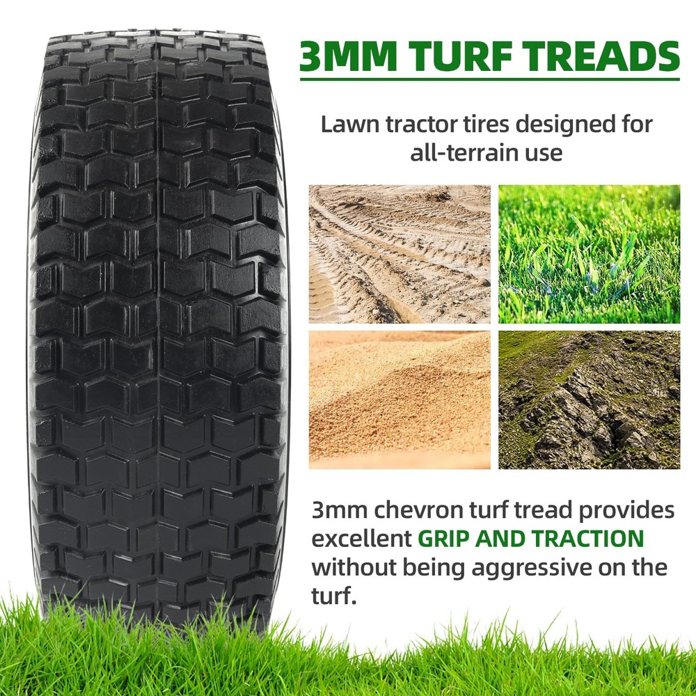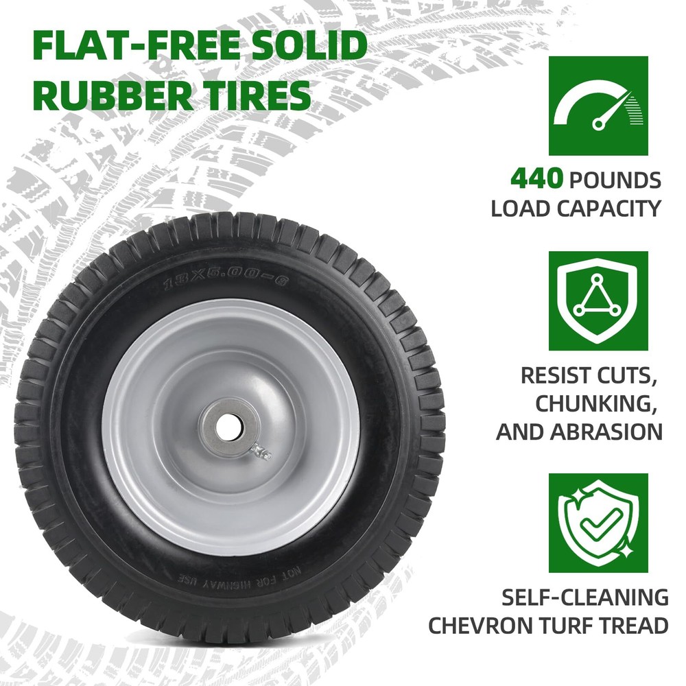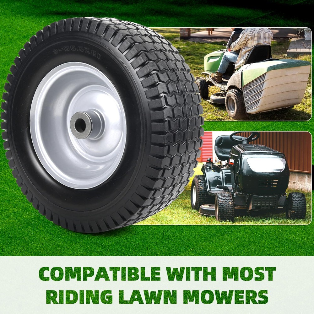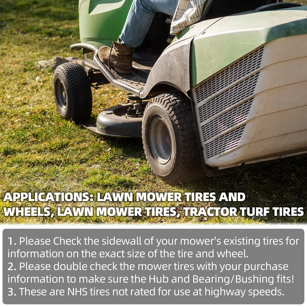 13X5.00-6 FLAT FREE TIRE AND WHEEL WITH 3" CENTERED HUB: Tire and rim assembly with 13 inches tire diameter, 4.50 inches tire width, and 6 inches rim size. The wheel bushing is 3/4 inches with a 3 inches centered hub. COMPATIBLE WITH MOST RIDING LAWN MOWERS: Compatible with select yard tractors, lawn mower tires, farm equipment, and other wheeled lawn and garden equipment. These are NHS tires not rated for use at highway speeds. FLAT-FREE SOLID RUBBER TIRES: Solid-core rubber tires with a maximum dynamic load capacity of 440 pounds. Can withstand multiple punctures without affecting riding comfort and safety. Solid rubber tires can better resist cuts, abrasion, and compression. 3MM TURF TREADS: Lawn tractor tires designed for all-terrain use. The 3mm chevron turf tread provides excellent grip and traction without being aggressive on the turf. With excellent water evacuation and self-cleaning properties to ensure better longevity and performance. WHAT’S INCLUDED: 2 pieces 13x5.00-6 flat free tires with rim assembly. Free 4pieces 5/8” bushings, 4pieces (3/4” bore) 1/4 inch long spacers, 10pieces (3/4” bore) 1/2 inch long spacers.