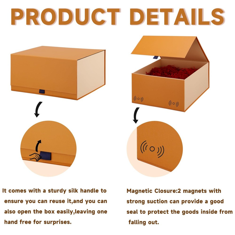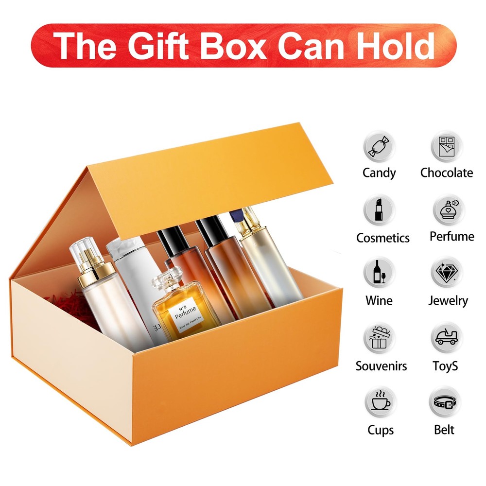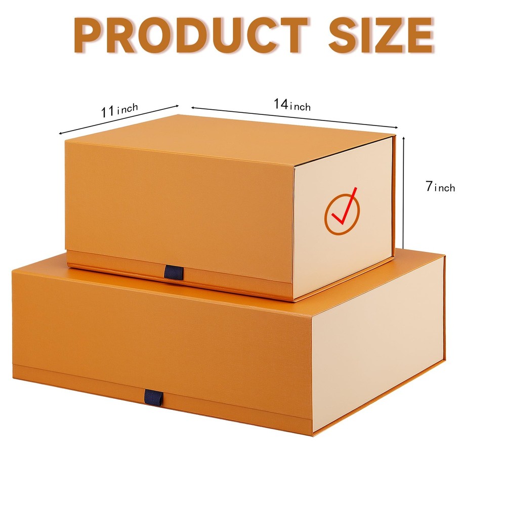 2 Pack Yellow Gift box,14x11x7 inch Packaging Gift Boxes with Lids for Valentines Day Flower Gift Boxes for Presents Birthday Christmas,Thanksgiving Day The package contains 2 packs of yellow gift boxes,and these gift boxes are shipped flat assembled boxes outside measure:14x11x7 inches.Heavy duty book board construction with matte paper over wrap inside and outside. The gift box can be recycled and is very environmentally friendly.Concealed magnetic closure design powerful magnet keeps lid closed even after repeated usage.No need to search wrapping paper, ribbon,or tape to wrap your gift. Exquisite gift boxes are elegant and easy way to wrap,contain,protect and present a special gift for birthdays,weddings,Holidays,Anniversaries,Graduations,Housewarmings and so on.This simple gift box enhances and transforms your gift into a unique presentation. Use all occasions great for bridesmaid,festival and everyday packaging for business gifts,Mother's Day,Valentine's Day,Father's Day,Thanksgiving gifts,Halloween gifts,Christmas presents,Birthday,party gifts,Wedding gifts and more. Please check the size whether it meet your needs or not before purchase.If you feel our magnetic gift box is not fit for your gift or you doesn't satisfied with our gift box after used,your any dissatisfied problems can be solved with in 24 hours.Contact us when you need.