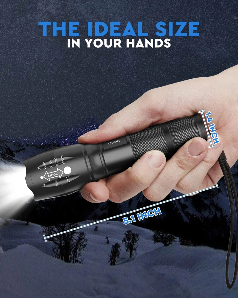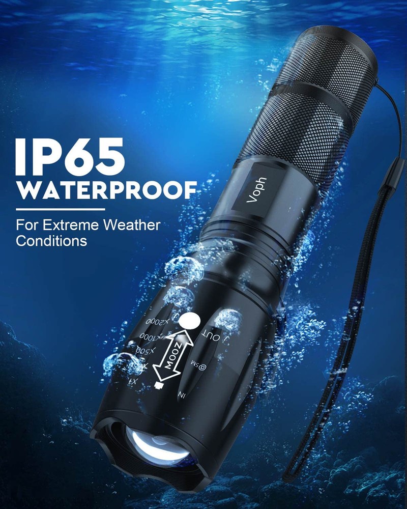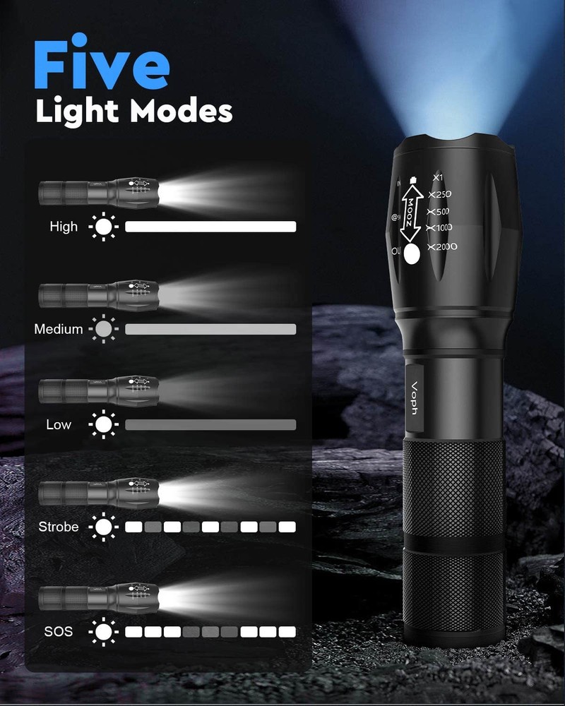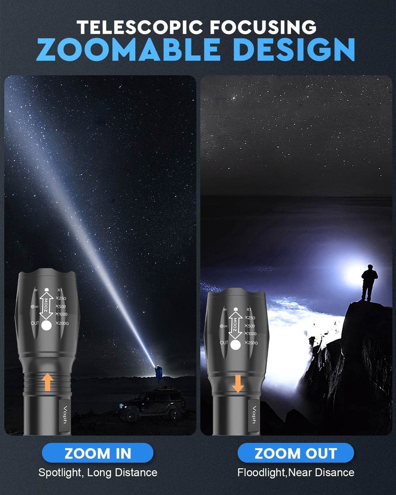 SUPER BRIGHT : Illuminate your path with this flash light boasting 2000 lumens of brightness, capable of reaching up to 656 feet. With a remarkable lifespan of over 50,000 hours, this flashlights high lumens will light your way through any adventure. Designed to withstand extreme weather conditions such as rain, sun, and freezing temperatures, it's an essential outdoor tool. 5 MODES & ZOOMABLE : Choose from five different modes of our led flashlight including low, medium, high, SOS, and strobe. Whether you're camping, hunting, hiking, biking, or experiencing a power outage, these modes have got you covered. The adjustable focus allows you to switch between a spot and flood beam, providing you with a clear view of your surroundings. AIRCRAFT-GRADE MATERIAL : This tactical flashlight is crafted from premium aircraft-grade alloy with a type 3 hard-anodized anti-abrasive coating, ensuring its durability, waterproof, dustproof, and wear-resistant properties. The ultra-dense fine-grained non-slip design offers a comfortable grip for a better user experience. BATTERY & CASE INCLUDED : Unlike other flashlights, we provide 6 AAA batteries for immediate use upon receiving this flashlights for emergencies. Additionally, we include a battery tube for rechargeable battery. This two-in-one design gives you more options and convenience. PERFECT GIFT CHOICE : Struggling to find the right gift? Look no further. Surprise your loved ones with this bright flashlight for Valentine's Day, Father's Day, Halloween, Thanksgiving, or Christmas. It's the ultimate gift for men, dad, parents, boyfriends, sons, neighbors, or anyone who loves the great outdoors. Get yours now and light up their world!