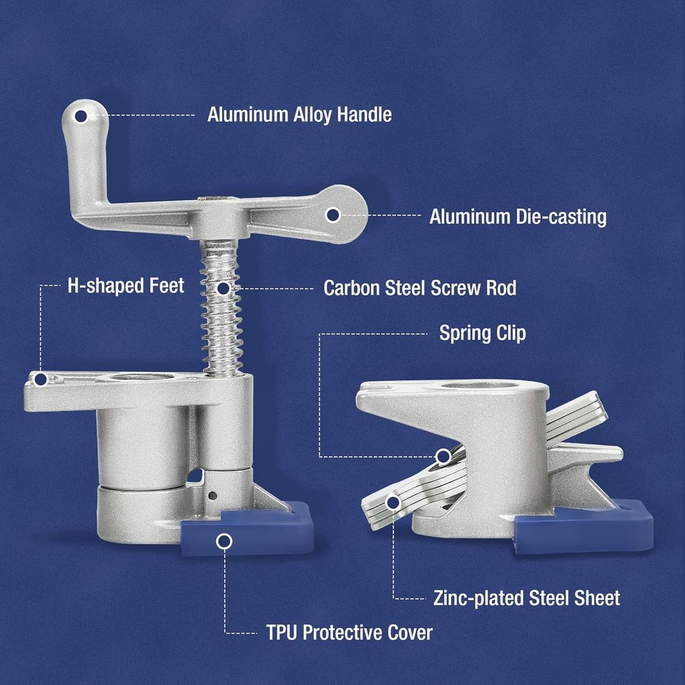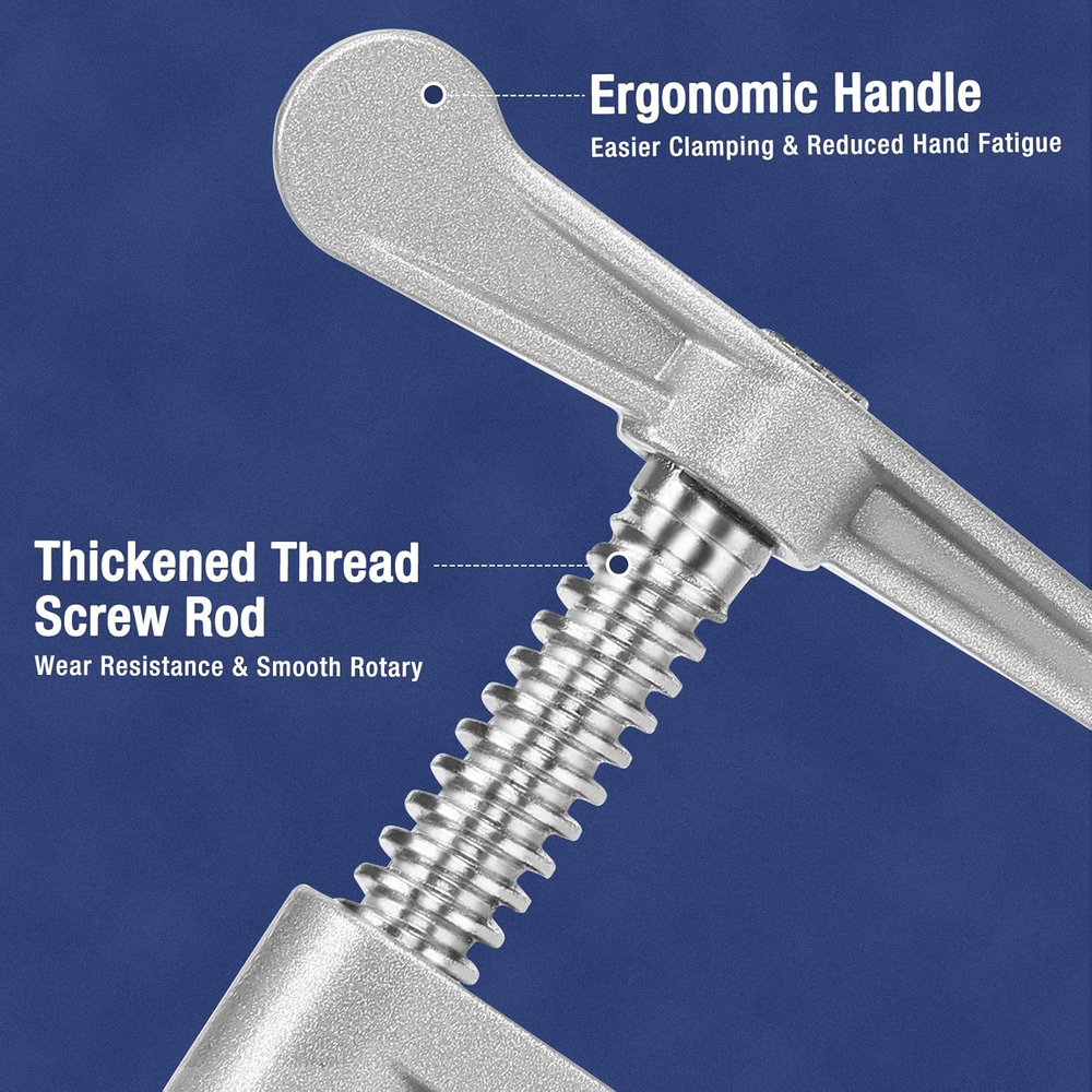Lightweight Construction: The pipe clamps feature lightweight construction by the application of high strength aluminium alloy, 50% lighter than conventional clamps made of die casting iron Firm & Stable Clamping: With a high-pressure spring and four carbon steel sheets, the clamp makes firm & stable clamping and can hold pipes tightly to fix them in place as you need Ergonomic Handle: The handle features ergonomic design providing smooth rotary, comfortable hand feeling, easier clamping and thus reduce hand fatique Long-lasting Life: The thickened thread screw rod made of carbon steel is wear-resistant and the TPU protective cover can lessen damage to the clamps, thus provides longer service life Practical Application: The tube clamp's outer diameter is 1.05 in, which is suitable for inner diameter 3/4 in balck pipes and work as an ideal helper in woodworking and metalworking projects. Just slide the pipe clamp through any length 3/4 in. pipe to hold wood in place for gluing and drilling NOTE: 2 rings are used on both ends of the tube to prevent clamps from slipping off. Product Description Ergonomic Handle & Thickened Screw Rod Provide smooth rotary, comfortable hand feeling, easier clamping and thus reduce hand fatique TPU Protective Cover & Larger Contact Area Lessen damage to the clamps, thus provides longer service life High-pressure Spring & Carbon Steel Sheets Make firm & stable clamping and can hold pipes tightly to fix them in place as you need