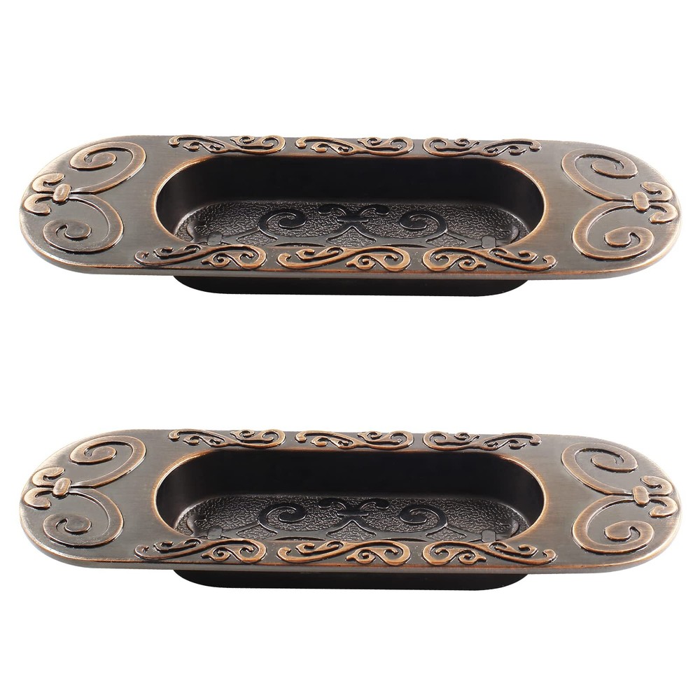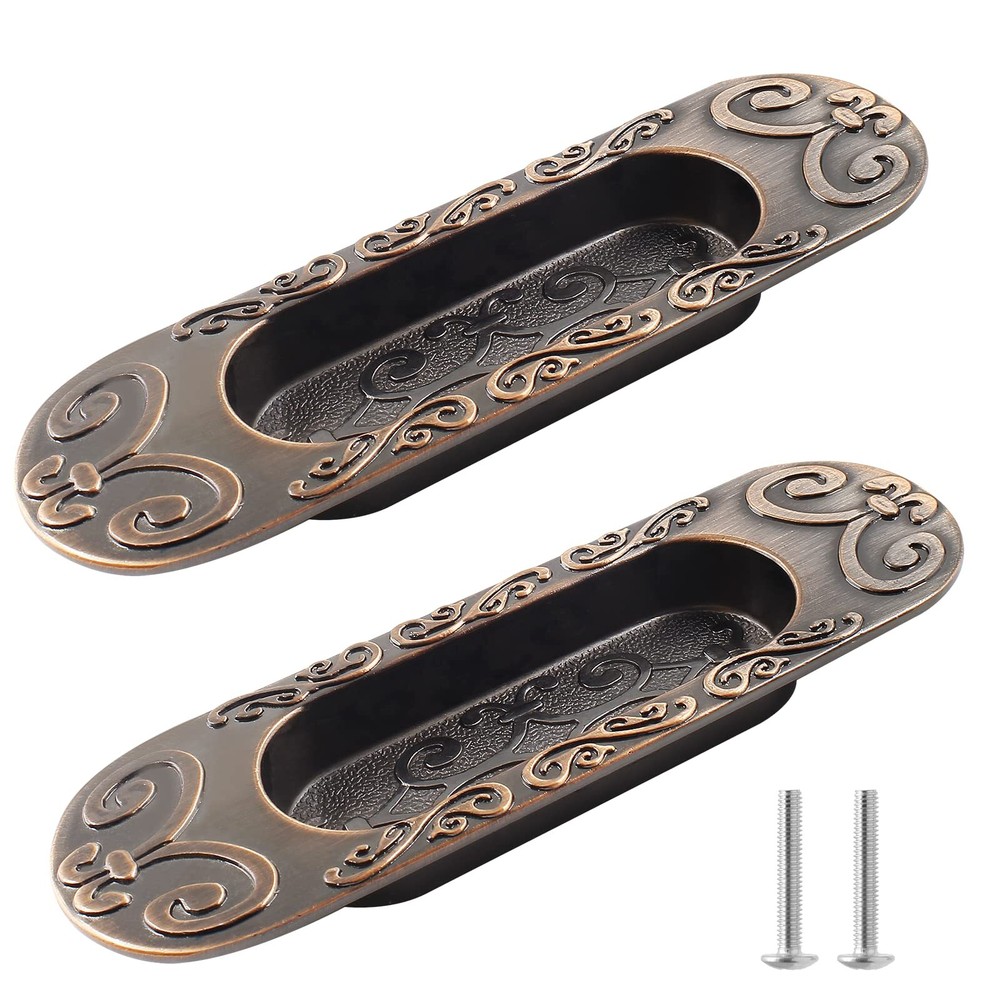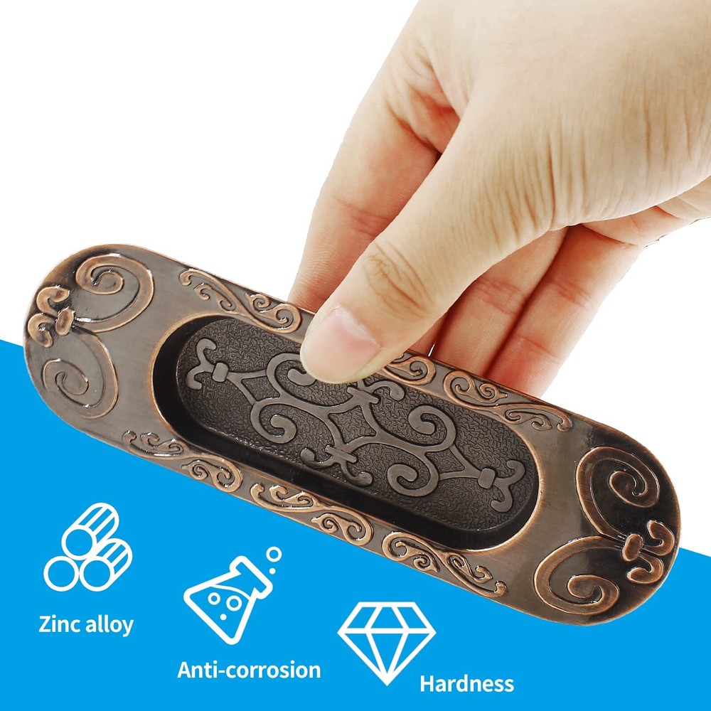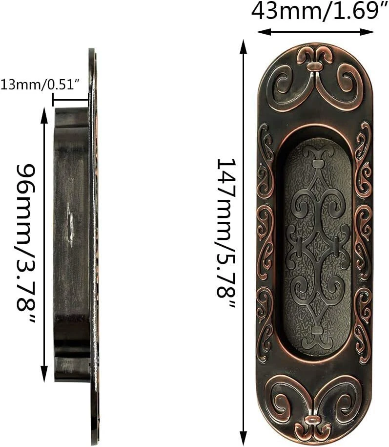 About Us focus on retail and wholesale hardware items and other accessories, all of the products we sell are strictly selected, we provide high quality, the most popular, affordable price products to worldwide. Feature 1. Suitable for cabinets, furniture, and kitchen applications. 2. Includes a flush pull handle and screws - no complicated installation. 3. Made from High quality Stainless Steel in Antique copper, these handles have a very high quality finish, oval modern vintage style Recessed Flush Pull. Always shiny never rusty. 4. Because pull handles are mounted on the exterior they require clearance, the Flush Handle is inset into the door, thus eliminating the protrusion and allowing the door to open without resistance. 5. The finger door pulls handle is designed to suit with most of internal and external doors: sliding barn doors, pocket doors, bifold doors, sliding doors, doors fitted with roller catches applications. Specification Material: Stainless Steel & Copper Color: Antique Copper Overall: 5.78*1.69 inch / 147*43 mm (L*W) Groove Depth: 0.51 inch / 13 mm Mounting Hole Distance: 3.78 inch / 96 mm Package Included 2 x Recessed Pull Handle 4 x Screws Warmly Note 1. The colors may have difference as the different display, please understand. 2. Please allow 1-2mm error due to manual measurement, please make sure you do not mind before you bid. [ Advanced Design ] Manufactured from High quality Stainless Steel in Antique Copper, these handles have a very high quality finish, oval modern vintage style Recessed Flush Pull. Always shiny never rusty. The surface and all edges are finely chamfered with polished by hours, touches soft, smooth and quality feeling. [ High Quality Materials ] The recessed handle pull is made of high-quality Stainless Steel and Antique Copper, so the recessed drawer pulls are sturdy and durable. The surface is protected by a coating, it will not rust after a long time of use. [ Multi-purpose ] The flush sliding door pull is practical and can be applied to many places. It's suitable for sliding barn doors, pocket doors, sliding doors, doors fitted with roller catches applications. Also suits with cabinets, furniture, and kitchen applications. [ What You Get ] 2 Pcs vintage barn door pulls and 4 pcs screws. Overall: 5.78*1.69 inch / 147*43 mm (L*W); Groove Depth: 0.51 inch / 13 mm; Mounting Hole Distance: 3.78 inch / 96 mm. style: style cabinet handles can perfectly match various styles of home decoration, adding elegance and exquisite temperament to your home decoration