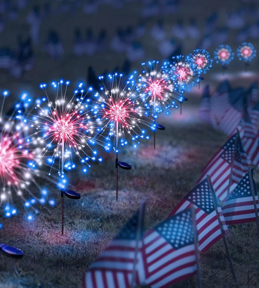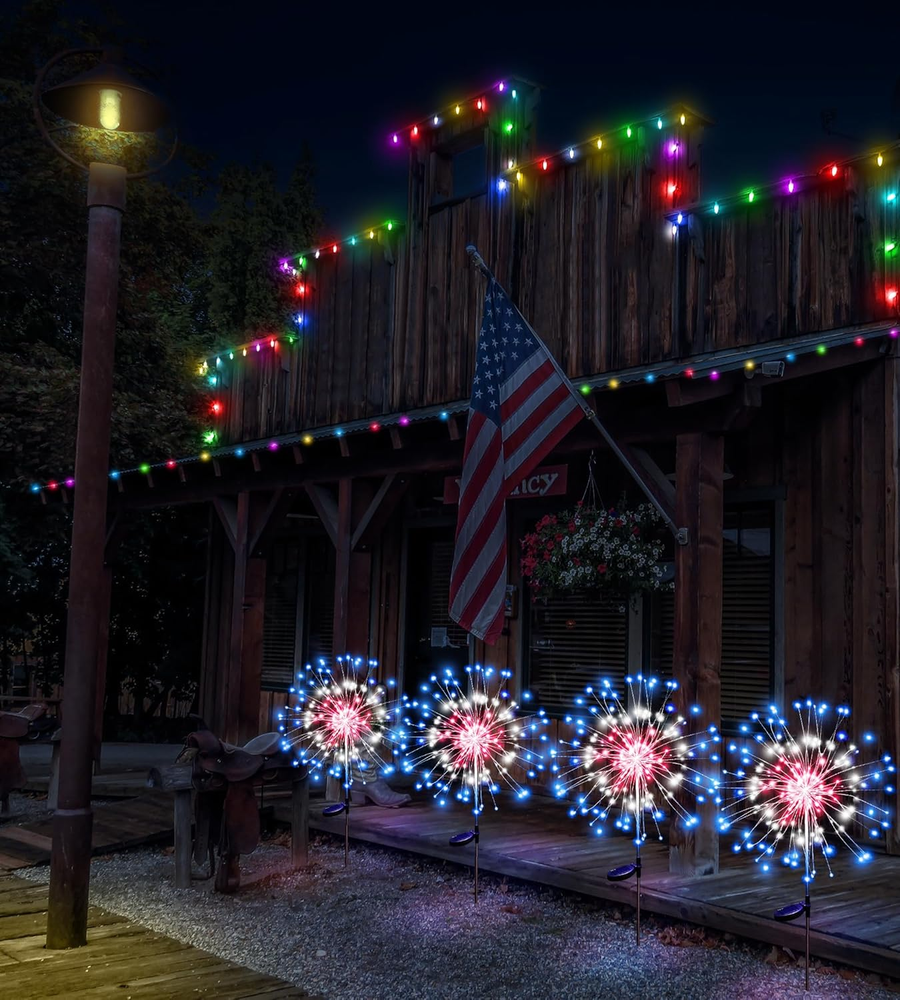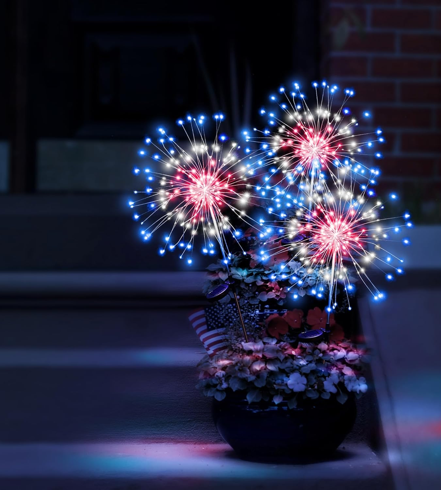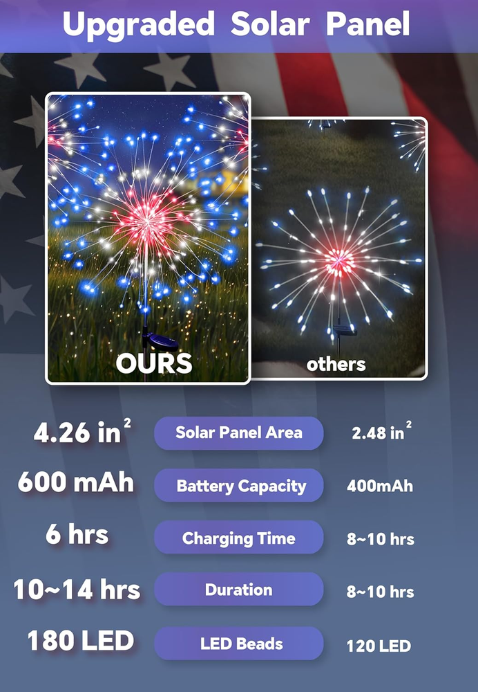 【Extended Performance】: Designed for longevity, these outdoor solar powered lights boast durable copper wires and low-heat-emission LEDs. They're built tough to withstand prolonged use without overheating or breaking. Equipped with a 1.2V/800mAh AAA Ni-MH rechargeable battery, they charge efficiently in 6-8 hours of standard sunshine and operate for 8-10 hours at night on a full charge 【Enhanced Illumination】: Featuring a whopping 180 LED beads, our upgraded solar garden fireworks lights outshine the competition. Craft mesmerizing displays reminiscent of lifelike fireworks by DIY-ing any shape you desire 【All-Weather Illumination】: These waterproof solar garden lights are built to withstand any weather condition. With its rubberized coating, they're impervious to water and dust, making them perfect for heavy rain or snow. Plus, their vibrant hues make them an ideal addition to your outdoor 4th of July decorations 【Perfect for Patriotic Celebrations】: Elevate your Independence Day decorations with our solar firework lights! Whether it's the 4th of July, Memorial Day, or any patriotic occasion, these lights add a radiant touch to your festivities 【Charm and Ambiance, Anytime, Anywhere】: Elevate your outdoor decor with our enchanting solar star lights. Featuring red, white, and blue LED lights, these lights offer a mesmerizing display of color and charm Product Description 1 High Brightness Led Beads 2 Durable Copper Wire 3 Large Area Solar Panel Illuminate Your Celebration with Solar Fireworks! More Colors, More Choices Add to Cart Add to Cart Add to Cart Add to Cart Add to Cart Customer Reviews 3.6 out of 5 stars 37 4.6 out of 5 stars 13 4.2 out of 5 stars 2,798 4.1 out of 5 stars 151 4.2 out of 5 stars 2,798 Price $21.99 $ 21 . 99 $29.99 $ 29 . 99 $14.99 $ 14 . 99 $21.59 $ 21 . 59 $18.99 $ 18 . 99 Solar Powered ✔ ✔ ✔ ✔ ✔ Waterproof ✔ ✔ ✔ ✔ ✔ Multiple Flashing Modes ✔ ✔ ✔ ✔ ✔ Wireless ✔ ✔ ✔ ✔ ✔ LED Beads 180 120 Total 120 150 180