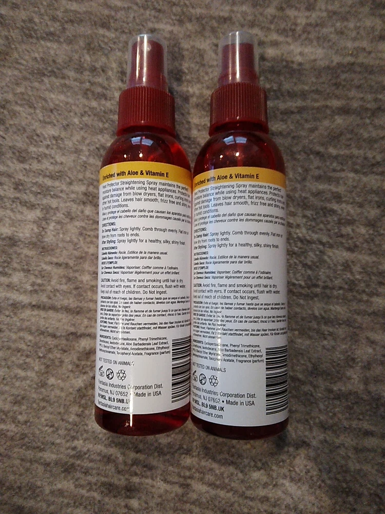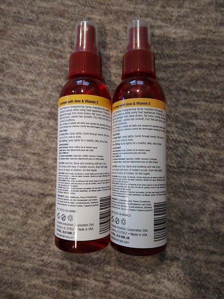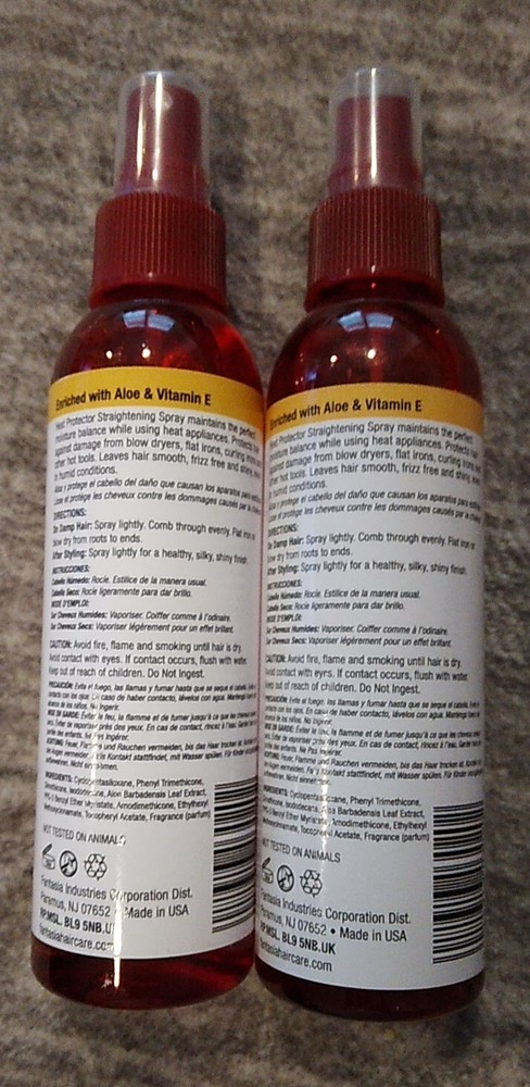 Brand: Fantasia MPN: Does not apply Expiration Date: N/A Formulation: Spray Type: Heat Protecting Spray UPC: 011313030202 gtin13: 011313030202 Features: Enriched With Aloe & Vitamin E Styling Effect: For Smooth, Shiny & Silky Hair, Heat Protection, Straightening Custom Bundle: Yes Product Line: Hair Polisher Heat Protector Spray Volume: 6 Oz EACH Suitable For: Hair Bundle Description: Lot Of 2