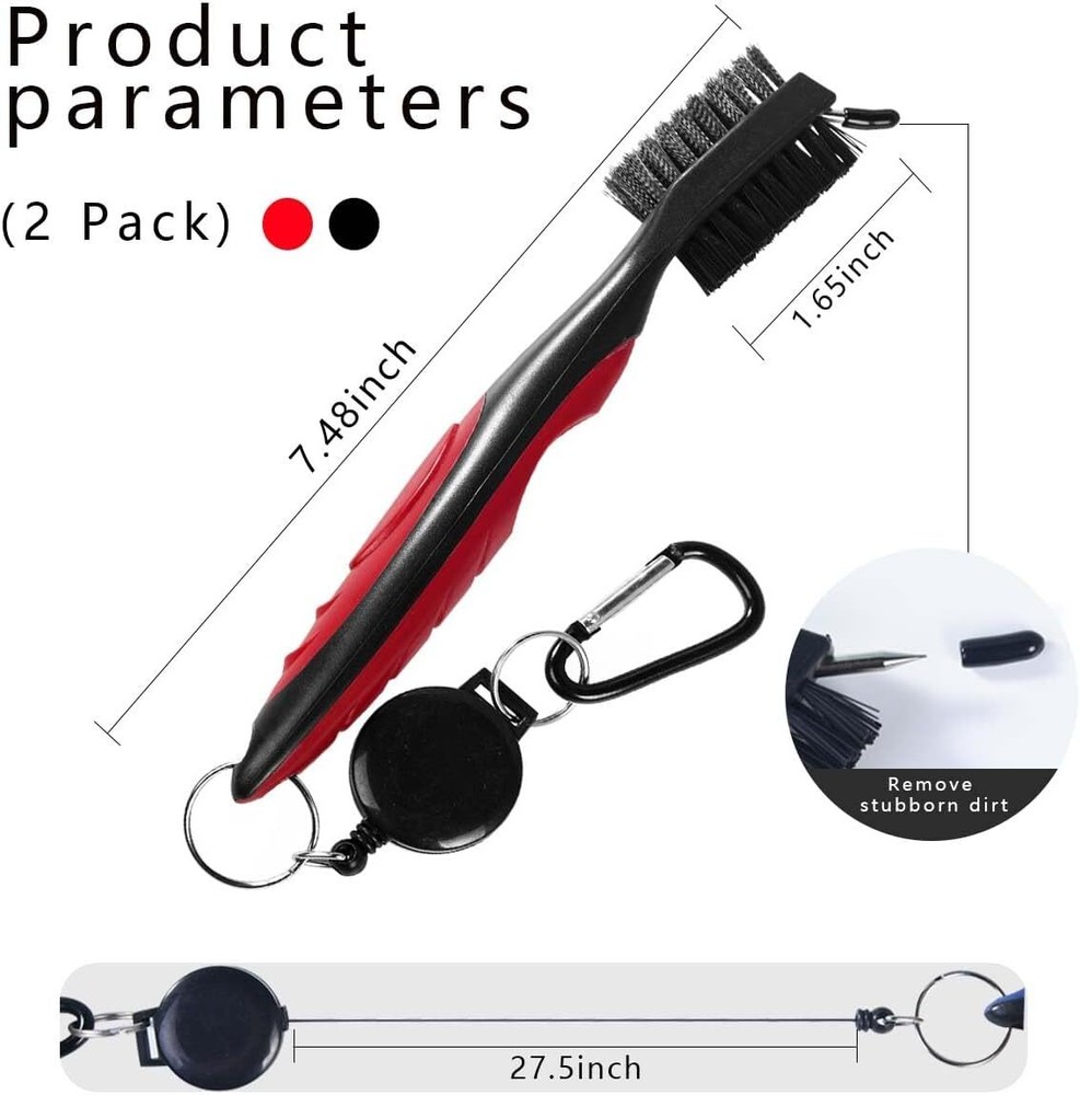Material: The golf club brush is made of high-quality plastic handle, nylon bristles, and aluminum carabiner. Having longer usage time and stronger cleaning power. Retractable Carabiner: Golf club cleaner with aluminum carabiner and a 25 inch retractable zip-line, makes it easy to attach to your golf bag. Easy to use anytime and anywhere, not easily lost. Super Cleaning Power: The golf club cleaning tool have 2 brushes, Nylon bristles are used to remove dust or grass from the surface of the golf club, while wire bristles are used to remove soil from the surface of the golf club. Metal Spikes: Spikes can quickly and efficiently clean individual grooves, the best cleaning tool for cleaning deep grooves and golf shoes. Package Includes: 2 Pack golf club brush cleaning tools, which can be given to your golfing friends. The best golf accessory for golf lovers.