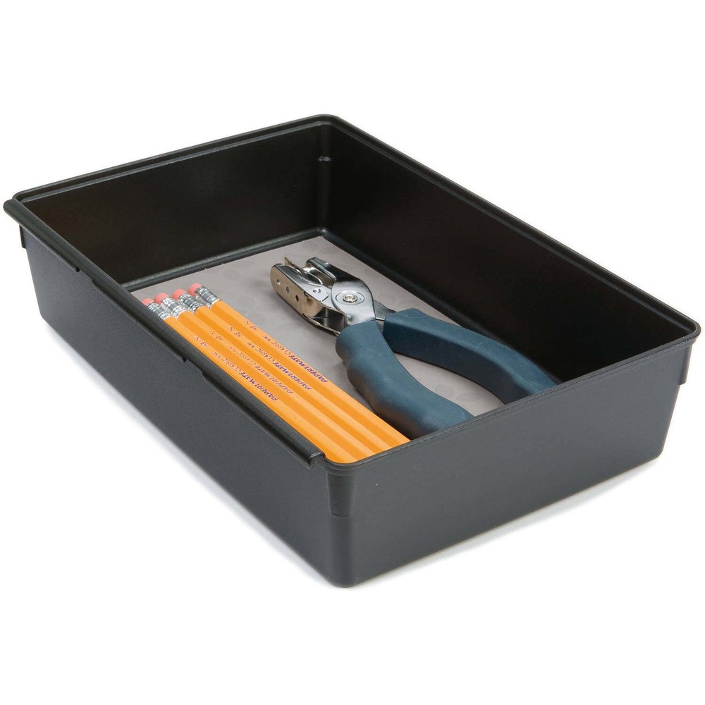 Customize and keep your drawers organized with the Rubbermaid Drawer Organizer. This handy insert interlocks with other organizers so you can store more in one place. The gray drawer organizer can also be used for beauty supplies, craft and kitchen items and more. The unit is crafted with durable plastic that can be wiped cleaned easily for effortless maintenance. The interlocking drawer organizer features a non-slip bottom for better grip, keeping the unit from shifting or sliding during use. The 2" depth and 6" x 9" width fits many drawers easily. The interlocking design makes it easy to add more organizers for even more easy in-drawer storage. Additional organizers are sold separately. Rubbermaid Drawer Organizer, 6" x 9", Gray: Durable plastic for everyday use Plastic construction empowers easy cleaning; simply wipe or rinse as needed Featuring interlocking sizes that allow for custom configurations Additional interlocking drawer organizer units are sold separately 2" depth fits most drawers Easy way to organize; non-slip bottom for better grip in drawers Ideal for office or school supplies, kitchen items, beauty products and more Size" 6" x 9"