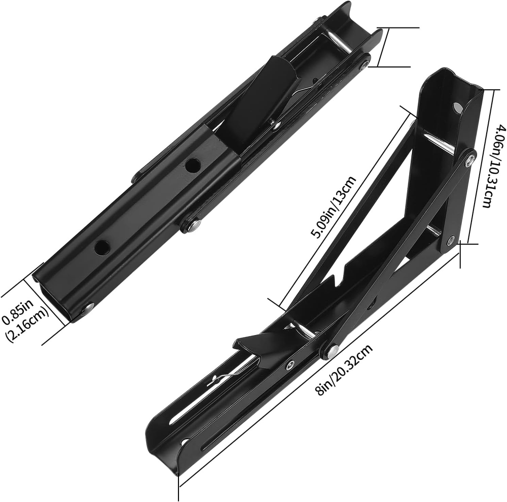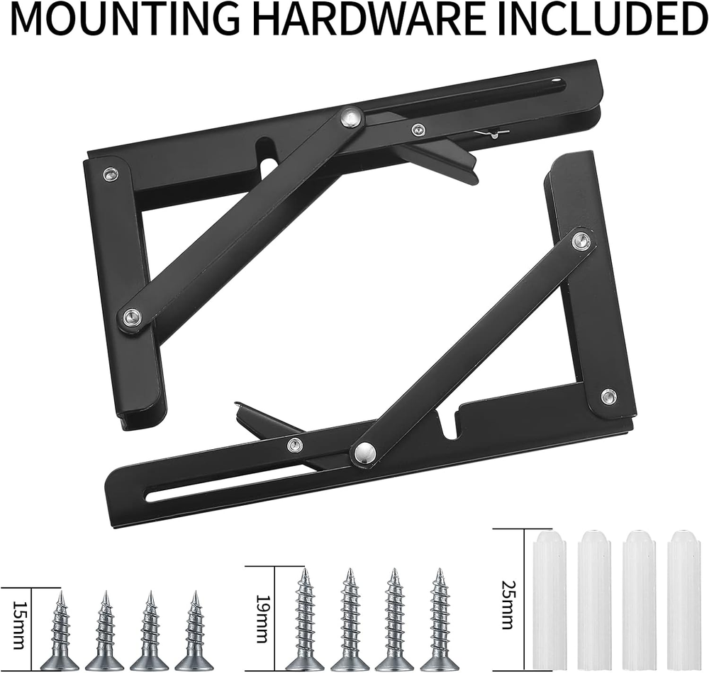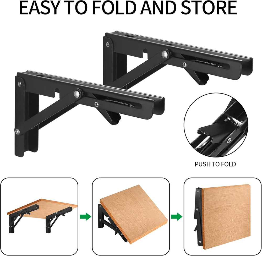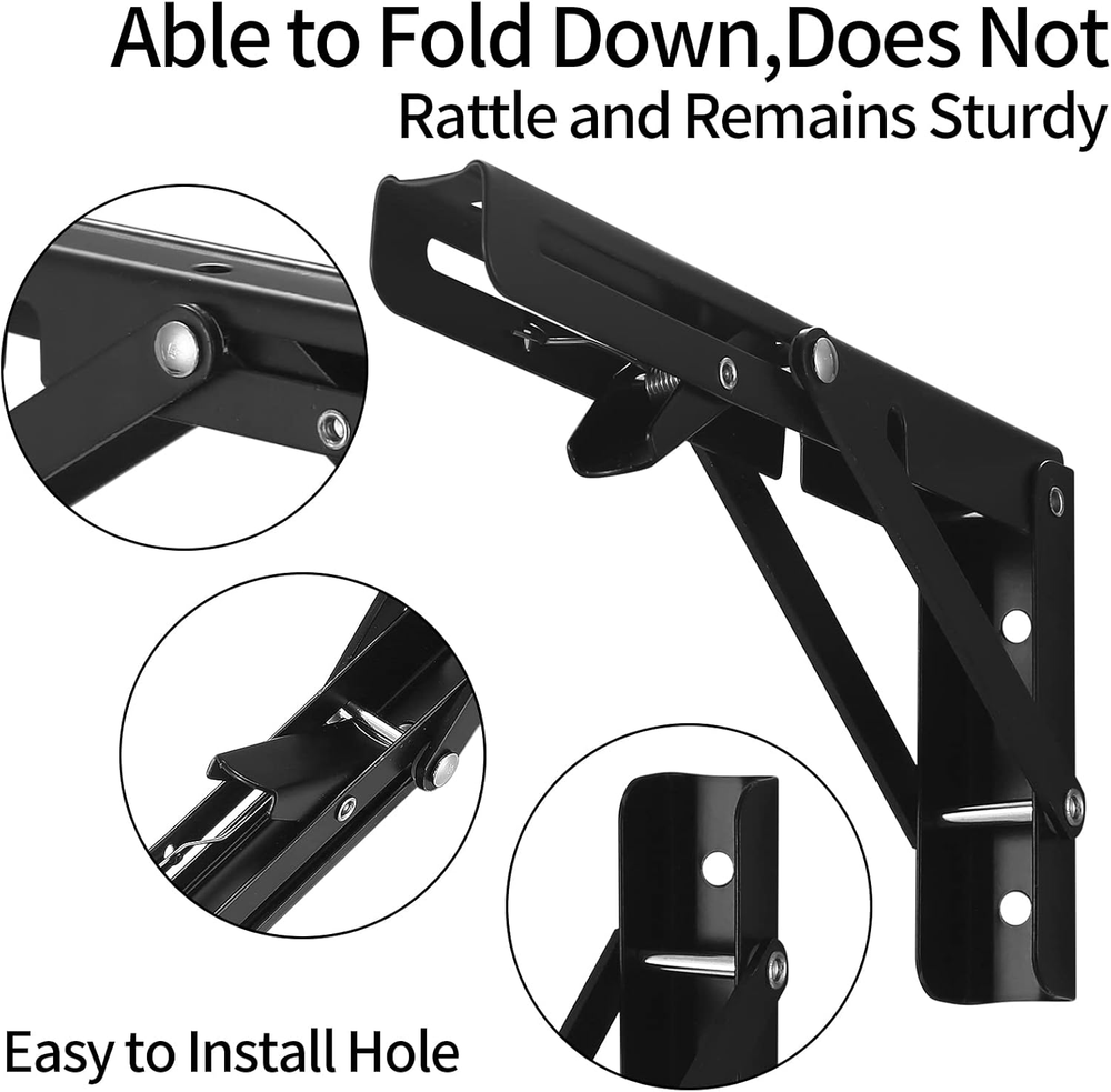 Premium Material: The wall-mounted heavy-duty folding bracket is made of excellent iron material with smooth surface to prevent scratches, has good corrosion and rust resistance, and the triangular shape is the most stable structure of the wall bracket. Easy to Install: Easy to install and fold, the folding bracket can be installed on any type of wall without damaging the wall. Just make sure the two sturdy folding brackets are parallel to each other and perpendicular to the wall. Collapsible, locking hinges heavy duty bracket lock the flip bracket at 90°. Space-saving Design: The foldable heavy duty shelf bracket attaches to the wall at a 90 degree angle and has only one mounting surface. It takes up very little space. Simply press the release arm and the stand can be folded up to keep your room neat and tidy. Wide Applications: These folding shelf brackets heavy duty can be used in garage, kitchen, store, workshop, boat, caravan, garden, trailer, bedroom, balcony, bathroom, etc. Package Includes: You will get 2 pcs wall shelf brackets, enough for your daily use. If you have any questions about floating shelves brackets, please feel free to contact us at any time and we will provide you with the best customer service. Product Description